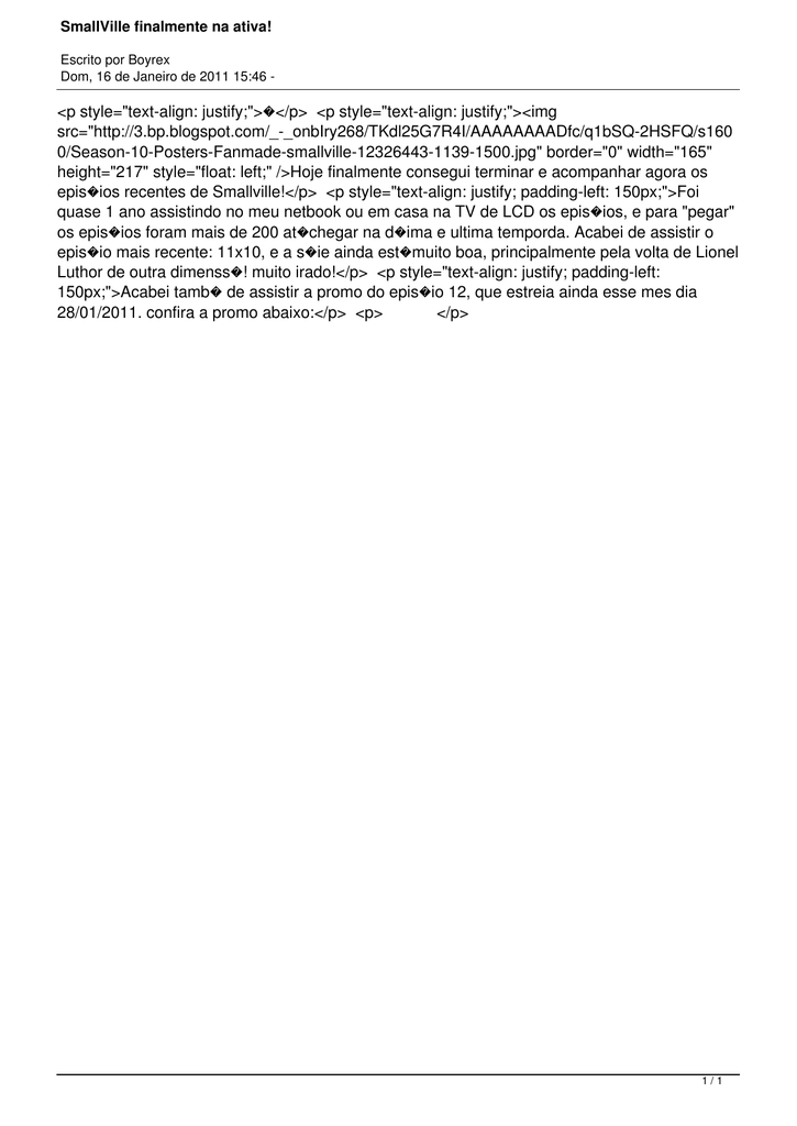 SmallVille finalmente na ativa! Escrito por Boyrex Dom, 16 de Janeiro de 2011 15:46 - <p style="text-align: justify;">�</p> <p style="text-align: justify;"><img src="http://3.bp.blogspot.com/_-_onbIry268/TKdl25G7R4I/AAAAAAAADfc/q1bSQ-2HSFQ/s160 0/Season-10-Posters-Fanmade-smallville-12326443-1139-1500.jpg" border="0" width="165" height="217" style="float: left;" />Hoje finalmente consegui terminar e acompanhar agora os epis�ios recentes de Smallville!</p> <p style="text-align: justify; padding-left: 150px;">Foi quase 1 ano assistindo no meu netbook ou em casa na TV de LCD os epis�ios, e para "pegar" os epis�ios foram mais de 200 at�chegar na d�ima e ultima temporda. Acabei de assistir o epis�io mais recente: 11x10, e a s�ie ainda est�muito boa, principalmente pela volta de Lionel Luthor de outra dimenss�! muito irado!</p> <p style="text-align: justify; padding-left: 150px;">Acabei tamb� de assistir a promo do epis�io 12, que estreia ainda esse mes dia 28/01/2011. confira a promo abaixo:</p> <p> </p> 1/1