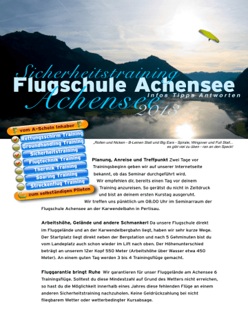 Sicherheitstraining Flugschule Achensee Achensee 2013 Infos Tipps Antworten „Rollen und Nicken - B-Leinen Stall und Big Ears - Spirale, Wingover und Full Stall... es gibt viel zu üben - ran an den Speck! Planung, Anreise und Treffpunkt Zwei Tage vor Trainingsbeginn geben wir auf unserer Internetseite bekannt, ob das Seminar durchgeführt wird. Wir empfehlen dir, bereits einen Tag vor deinem Training anzureisen. So gerätst du nicht in Zeitdruck und bist an deinem ersten Kurstag ausgeruht. Wir treffen uns pünktlich um 08.00 Uhr im Seminarraum der Flugschule Achensee an der Karwendelbahn in Pertisau. Arbeitshöhe, Gelände und andere Schmankerl Da unsere Flugschule direkt im Fluggelände und an der Karwendelbergbahn liegt, haben wir sehr kurze Wege. Der Startplatz liegt direkt neben der Bergstation und nach 5 Gehminuten bist du vom Landeplatz auch schon wieder im Lift nach oben. Der Höhenunterschied beträgt an unserem 12er Kopf 550 Meter (Arbeitshöhe über Wasser etwa 450 Meter). An einem guten Tag werden 3 bis 4 Trainingsflüge gemacht. Fluggarantie bringt Ruhe Wir garantieren für unser Fluggelände am Achensee 6 Trainingsflüge. Solltest du diese Mindestzahl auf Grund des Wetters nicht erreichen, so hast du die Möglichkeit innerhalb eines Jahres diese fehlenden Flüge an einem anderen Sicherheitstraining nachzuholen. Keine Geldrückzahlung bei nicht fliegbarem Wetter oder wetterbedingter Kursabsage. „Unser oberstes Ziel auch im Sicherheitstraining: Spaß haben!!!“ Reiserücktritts,- und Krankenrücktransportversicherung Keiner will die Reiserücktrittsversicherung, aber bitte bedenke, dass dir und uns „im Fall der Fälle“ diese Hintertür nur Gutes bringt! Unser Tipp: www.elvia.de. Der Abschluss der RRV muss bei Festbuchung der Reise erfolgen. Bitte beachte: Spätere Abschlüsse sind nur innerhalb von 14 Tagen nach Festbuchung oder Erhalt der Reisebestätigung möglich. Genauso wichtig ist eine Krankenrücktransportversicherung! Unterkunft Achensee Wenn du direkt am Landeplatz in Pertisau wohnen möchtest, empfehlen wir dir das Haus Bergland, Fam. Niederrist, Tel. 0043 5243 5308, www.bergland-pertisau.at. Ganz besonders gut und familiär aufgehoben bist du bei „Traudl“ im Haus Dekassian in Maurach, Tel. 0043 5243 5141, www.achensee.com/dekassian. Traudl berechnet auch keine Stornogebühren im Falle einer Absage! Rettungsschirm Bitte achte darauf, dass dein Rettungsschirm in den letzten 6 Monaten vor deinem Sicherheitstrainingstermin frisch gepackt worden ist. Gerne kannst du deinen Retter auch zu uns schicken und ihn zu deinem Training frisch packen lassen (mindestens 5 Tage vor Trainingsbeginn). „Der Start ist deine erste Trainingsflugfigur - nicht nur im Sicherheitstraining. Der Start soll sicher sein, immer und immer wieder“. Kompatibilitätsprüfung und Service der Flugschule Achensee „Wird dein Rettungsschirm bei einem eventuellen Absturz einwandfrei funktionieren?“ Diese Frage kann nur eine sachgemäße Kompatibilitätsprüfung beantworten. Es spart uns eine Menge (Flug-) Zeit, wenn du schon mit einer bestätigten K-Prüfung zu deinem Sicherheitstraining erscheinst. Diese K-Prüfung wird von einem ausgebildeten K-Prüfer in deinem Packbuch bestätigt. Ausrüstungsvorbereitung Achte auf eine gecheckte Gleitschirmausrüstung. Wenn du ein Vario besitzt, so mach deine Trainingsflüge (Spirale, B-Leinenstall, Big-Ears) unbedingt mit diesem Instrument. Deinen Protektor im Gurtzeug steckst du am Besten in einen Plastiksack, somit kann er sich im Falle einer Wasserlandung nicht voll saugen. Optimale Trainingsvorbereitung Bei deiner Anmeldebestätigung haben wir dir unser „Sicherheitstraining Workbook“ als PDF angehängt. Bitte beschäftige dich schon einmal im voraus mit den Flugfiguren, die du fliegen möchtest. Somit wirst du noch mehr von deinen Trainingstagen profitieren. Papiere Bitte bring deine bestehende Lizenzen mit und auch deine vorhandenen Versicherungsnachweise (Haftpflichtversicherung, Krankenversicherung, Rücktransportversicherung). „Eine geplante Rettungsschirmöffnung ist ein wahrlich erfrischendes Highlight in deinem Training!“ Extras Rettungsschirm packen incl. Kompatibilitätsprüfung kostet 35 Euro. Der Verbindungskarabiner zwischen Rettungsschirm und Gurtzeug 8 Euro. Die Patrone der Automatik-Schwimmweste kostet bei einer Wasserung 35 Euro. Die günstigste Achensee Liftkarte ist die „Dreier Karte“ für 25 Euro. Solltest du ins Wasser gehen stellen wir dir wenn möglich eine Leihausrüstung zur Verfügung, Kosten Gurtzeug/Rettung 5 Euro und Gleitschirm 5 Euro pro Flug. Film in Full HD Qualität Deine Flüge werden in HD Qualität gefilmt und zusammen mit den Fotos, die während des Trainings gemacht werden auf DVDs gebrannt. Hierzu kommt außerdem unser hochwertiger Lehrfilm, dieses Gesamtpaket kostet 19 Euro. Solltest du deine Flüge zusätzlich in Full HD Qualität haben wollen, so kannst du deinen eigenen Stick mitbringen, oder bei uns einen 32 GB Stick für 29 Euro kaufen. Für Vielflieger und Rechner „Flieg Vier zahl Drei“ Wenn du innerhalb eines Jahres 4 Trainings buchst, bezahlst du nur für 3. Nach Beendigung des ersten Kurses hast du 12 Monate Zeit, 3 weitere Trainings zu absolvieren. Außerdem bitte mitbringen Viele Fragen, Lust und Laune, sonnige Gesichter und Gemüter, blauer Himmel, ein paar Schäfchenwolken, einen braven Wind und jede Menge Humor...