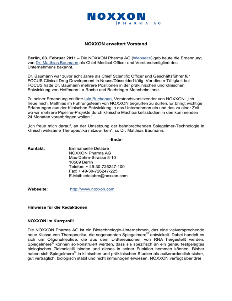 NOXXON erweitert Vorstand Berlin, 03. Februar 2011 – Die NOXXON Pharma AG (Webseite) gab heute die Ernennung von Dr. Matthias Baumann als Chief Medical Officer und Vorstandsmitglied des Unternehmens bekannt. Dr. Baumann war zuvor acht Jahre als Chief Scientific Officer und Geschäftsführer für FOCUS Clinical Drug Development in Neuss/Düsseldorf tätig. Vor dieser Tätigkeit bei FOCUS hatte Dr. Baumann mehrere Positionen in der präklinischen und klinischen Entwicklung von Hoffmann La Roche und Boehringer Mannheim inne. Zu seiner Ernennung erklärte Iain Buchanan, Vorstandsvorsitzender von NOXXON: „Ich freue mich, Matthias im Führungsteam von NOXXON begrüßen zu dürfen. Er bringt wichtige Erfahrungen aus der Klinischen Entwicklung in das Unternehmen ein und das zu einer Zeit, wo wir mehrere Pipeline-Projekte durch klinische Machbarkeitsstudien in den kommenden 24 Monaten voranbringen wollen.“ „Ich freue mich darauf, an der Umsetzung der bahnbrechenden Spiegelmer-Technologie in klinisch wirksame Therapeutika mitzuwirken“, so Dr. Matthias Baumann. -EndeKontakt: Emmanuelle Delabre NOXXON Pharma AG Max-Dohrn-Strasse 8-10 10589 Berlin Telefon: + 49-30-726247-100 Fax: + 49-30-726247-225 E-Mail: [email protected] Webseite: http://www.noxxon.com Hinweise für die Redaktionen NOXXON im Kurzprofil Die NOXXON Pharma AG ist ein Biotechnologie-Unternehmen, das eine vielversprechende neue Klasse von Therapeutika, die sogenannten Spiegelmere® entwickelt. Dabei handelt es sich um Oligonukleotide, die aus dem L-Stereoisomer von RNA hergestellt werden. ® Spiegelmere können so konstruiert werden, dass sie spezifisch an ein genau festgelegtes biologisches Zielmolekül binden und dieses in seiner Funktion hemmen können. Bisher haben sich Spiegelmere® in klinischen und präklinischen Studien als außerordentlich sicher, gut verträglich, biologisch stabil und nicht immunogen erwiesen. NOXXON verfügt über drei Entwicklungsprogramme, von denen zwei erfolgreich die ersten klinischen Phase-I-Studien abgeschlossen haben: NOX-E36 und NOX-A12. Das Unternehmen ist in Berlin und beschäftigt ca. 70 Mitarbeiter. NOXXONs Investoren sind unter anderem NGN Capital, TVM Capital, Sofinnova Partners, Edmond de Rothschild Investment Partners, Deutsche Effecten- und WechselBeteiligungsgesellschaft (DEWB), Seventure Partners, The Dow Chemical Company, Dieckell Group, Oppenheim Asset Management Services, IBG Risikokapitalfonds, VC Fonds Berlin und CD Ventures. Über Spiegelmere® Spiegelmere® (L-Stereoisomer-RNA-Oligonukleotide) sind chemische Substanzen, die auf synthetischen, spiegelbildlichen Oligonukleotiden basieren, welche sehr selektiv für ihre pharmakologischen Zielmoleküle sind und die Funktion dieser Moleküle wirksam hemmen. Sie vereinen die Vorzüge von niedermolekularen Arzneimitteln und Biopharmazeutika. Aufgrund ihrer einzigartigen spiegelbildlichen Struktur werden Spiegelmere® nicht verstoffwechselt und binden nicht an die natürlich vorkommenden Nukleinsäuren. Spiegelmere® führen auch nicht zu einer Aktivierung der angeborenen Immunantwort über Toll-like-Rezeptoren und haben in präklinischen Versuchsreihen ein überaus vorteilhaftes Immunogenitätsprofil gezeigt.