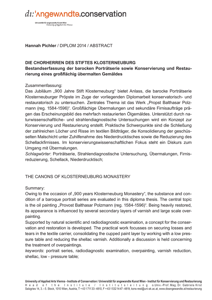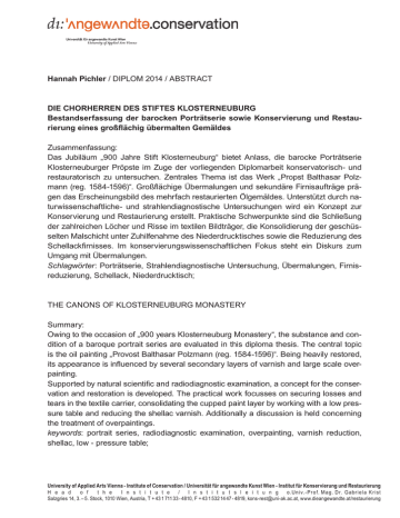 Hannah Pichler / DIPLOM 2014 / ABSTRACT DIE CHORHERREN DES STIFTES KLOSTERNEUBURG Bestandserfassung der barocken Porträtserie sowie Konservierung und Restaurierung eines großflächig übermalten Gemäldes Zusammenfassung: Das Jubiläum „900 Jahre Stift Klosterneuburg“ bietet Anlass, die barocke Porträtserie Klosterneuburger Pröpste im Zuge der vorliegenden Diplomarbeit konservatorisch- und restauratorisch zu untersuchen. Zentrales Thema ist das Werk „Propst Balthasar Polzmann (reg. 1584-1596)“. Großflächige Übermalungen und sekundäre Firnisaufträge prägen das Erscheinungsbild des mehrfach restaurierten Ölgemäldes. Unterstützt durch naturwissenschaftliche- und strahlendiagnostische Untersuchungen wird ein Konzept zur Konservierung und Restaurierung erstellt. Praktische Schwerpunkte sind die Schließung der zahlreichen Löcher und Risse im textilen Bildträger, die Konsolidierung der geschüsselten Malschicht unter Zuhilfenahme des Niederdrucktisches sowie die Reduzierung des Schellackfirnisses. Im konservierungswissenschaftlichen Fokus steht ein Diskurs zum Umgang mit Übermalungen. Schlagwörter: Porträtserie, Strahlendiagnostische Untersuchung, Übermalungen, Firnisreduzierung, Schellack, Niederdrucktisch; THE CANONS OF KLOSTERNEUBURG MONASTERY Summary: Owing to the occasion of „900 years Klosterneuburg Monastery“, the substance and condition of a baroque portrait series are evaluated in this diploma thesis. The central topic is the oil painting „Provost Balthasar Polzmann (reg. 1584-1596)“. Being heavily restored, its appearance is influenced by several secondary layers of varnish and large scale overpainting. Supported by natural scientific and radiodiagnostic examination, a concept for the conservation and restoration is developed. The practical work focusses on securing losses and tears in the textile carrier, consolidating the cupped paint layer by working with a low pressure table and reducing the shellac varnish. Additionally a discussion is held concerning the treatment of overpaintings. keywords: portrait series, radiodiagnostic examination, overpainting, varnish reduction, shellac, low - pressure table; University of Applied Arts Vienna - Institute of Conservation / Universität für angewandte Kunst Wien - Institut für Konservierung und Restaurierung H e a d o f t h e I n s t i t u t e / I n s t i t u t s l e i t u n g o.Univ.- Prof. M ag. Dr. G abr iela K r ist Salzgries 14, 3. – 5. Stock, 1010 Wien, Austria, T + 43 1 711 33 - 4810, F + 43 1 532 14 47 - 4819, [email protected], www.dieangewandte.at/restaurierung
