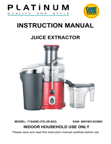 INSTRUCTION MANUAL JUICE EXTRACTOR MODEL: 7104260 (YD-JR-823) EAN: 6001001433983 INDOOR HOUSEHOLD USE ONLY Please save and read this instruction manual carefully before use. ENGLISH INTRODUCTION Thank you for purchasing our “Platinum” Juice Extractor. Each unit has been manufactured to ensure safety, reliability, and ease of use. Before use, please read these instructions carefully and keep them for future reference. IMPORTANT SAFEGUARDS When using your electrical appliance, basic precautions should always be followed, including the following: l This product is not intended for use by persons (including children) with reduced physical, sensory or mental capabilities, or lack of experience and knowledge concerning the use of this product, unless they are supervised or have been given instruction concerning use of the appliance by a person responsible for their safety. l Children should be supervised to ensure that they do not play with the appliance. l Always ensure that the voltage on the rating label corresponds to the voltage in your home. l Check the power cord and plug regularly for any damage. If the cord or the plug is damaged, it must be replaced by the manufacturer or a qualified person in order to avoid an electrical hazard. l This product is intended for household use only. Industrial or commercial use will void the warranty, and the supplier can not be held responsible for injury or damage caused when using the appliance for any other purpose than that intended. l Incorrect operation and improper use can damage the appliance and cause injury to the user. l Do not use the appliance if it has been dropped or damaged in any way. In case of damage, take the unit in for examination and/or repair by an authorized service agent. l To reduce the risk of electric shock, do not immerse or expose the motor assembly, plug or the power cord to water or any other liquid. l Never immerse the unit in water or any other liquid for cleaning purposes. l Remove the plug from the socket by gripping the plug. Do not pull on the cord to disconnect the appliance. Always unplug the unit when not in use, before cleaning or when adding or removing parts. l The use of accessory attachments that are not recommended or supplied by the manufacturer may result in injuries, fire or electric shock. l Do not let the cord hang over the edge of a table or counter. Ensure that the cord is not in a position where it can be pulled on inadvertently. l Do not allow the cord to touch hot surfaces and do not place on or near a hot gas or electric burner or in a heated oven. l Use of an extension cord with this appliance is not recommended. However, if it is necessary to use an extension lead, ensure that the lead is suited to the power consumption of the appliance to avoid overheating of the extension cord, appliance or plug point. Do not place the extension cord in a position where it can be pulled on by children or animals or tripped over. l This appliance is not suitable for outdoor use. Do not use this appliance for anything other than its intended use. l Do not carry the appliance by the power cord. l Always operate the appliance on a smooth, even and stable surface. Do not place the unit on a hot surface. ENGLISH l Always make sure the Juice Extractor is properly and completely assembled before operating. The unit will not operate unless properly assembled. l Always make sure juicer cover is clamped securely in place before motor is turned on. Do not unfasten clamps while juicer is in operation. l This product is only for juicing fruits and vegetables. Do not use this machine with high fibre food, nuts or other refrigerated food. Other food material might damage the machine itself. l Do not push fruits and vegetables into the feed chute with your fingers during operating. Always use the food pusher provided. l Do not take out the Pulp Container and Juice Jug during operating. l Do not keep operate the machine without loading. Any abnormal use is also forbidden. l During the first period using, it’s normal that there is a light smell come out. As the motor need certain pilot run to get perfect smooth. After few times using, smell will disappear automatically. l Be sure to turn the switch to “0” position after each use. Make sure the motor stops completely before disassembling. And the power cord is unplugged from the outlet. l Always disconnect the Juice Extractor from the power outlet when not in use or when assembling. l Do not put removable parts into dishwasher machine. l Do not leave this appliance unattended during use. Always unplug the unit when not in use. Allow it to cool before putting on or taking off parts, and before cleaning the appliance. l The manufacturer does not accept responsibility for any damage or injury caused by the improper or incorrect use of the appliance, or by repairs carried out by unauthorized personnel. l In case of technical problems, switch off the machine and do not attempt to repair it yourself. Return the appliance to an authorized service facility for examination, adjustment or repair. Always insist on the use of original spare parts. Failure to comply with the above mentioned precautions and instructions, could affect the safe operation of this machine. l This appliance is intended to be used in household and similar applications such as: -Staff kitchen areas in shops, offices and other working environments; -Farm houses; -By clients in hotels, motels and other residential type environments; -Bed and breakfast type environments. ENGLISH KNOW YOUR JUICE EXTRACTOR 1. Food Pusher 2. Juicer Cover 3. Pulp Container 4. Safety Locking arm 5. Motor Base 6. Switch & Speed Selector 7. S.S. Mesh Filter Basket 8. Filter Bowl 9. Juice Spout Tube 10. Juice Jug 11. Feed Chute 12. Nylon Brush 11 1 12 SPECIFICATIONS Capacity Voltage Power Cord KB : : : : : 1.0 Liter AC 220-240V / 50 Hz 600-700W 2 round pins plug 2 minutes USING YOUR JUICE EXTRACTOR 1. Remove all packing material an