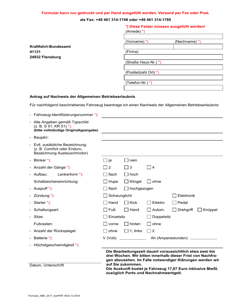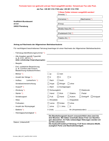 Formular kann nur gedruckt und per Hand ausgefüllt werden. Versand per Fax oder Post. als Fax: +49 461 314-1748 oder +49 461 314-1785 *) Diese Felder müssen ausgefüllt werden! (Anrede) *) (Vorname) *) Kraftfahrt-Bundesamt 41131 24932 Flensburg (Nachname) *) (Firma) (Straße Haus-Nr.) *) (Postleitzahl Ort) *) (Telefon-Nr.) *) Antrag auf Nachweis der Allgemeinen Betriebserlaubnis Für nachfolgend beschriebenes Fahrzeug beantrage ich einen Nachweis der Allgemeinen Betriebserlaubnis: - Fahrzeug-Identifizierungsnummer *): - Alle Angaben gemäß Typschild (z. B. S 51, KR 51) *): (bitte vollständige Originaltypangabe) - Baujahr: - Evtl. zusätzliche Bezeichnung: (z. B. Comfort oder Enduro, Bezeichnung Austauschmotor) - Blinker *): ja nein - Anzahl der Gänge *): 2 3 - Aufbau: flach hoch Hupe Klingel - Auspuff *): flach hochgezogen - Zündung *): Schwunglicht - Starter *): Hand Kick Elektro Pedal - Schaltungsart: Fuß Hand Autom. Drehgriff - Sitze: Einzelsitz Lenkerform *): Schallzeicheneinrichtung: Fußrasten: - Anzahl der Rückspiegel: - Batterie *): 4 ohne Elektronik Doppelsitz vorne hinten ohne ohne 1, links 2 V (Volt): Knüppel Ah (Amperestunden): - Höchstgeschwindigkeit *): Datum, Unterschrift Formular_ABE_2017_fuerPDF.rtf/22.12.2016 Die Bearbeitungszeit dauert voraussichtlich etwa zwei bis drei Wochen. Wir bitten innerhalb dieser Frist von Nachfragen abzusehen. Im Falle notwendiger Klärungen werden wir auf Sie zukommen. Die Auskunft kostet je Fahrzeug 17,67 Euro inklusive MwSt. zuzüglich Porto und Nachnahmeentgelt.