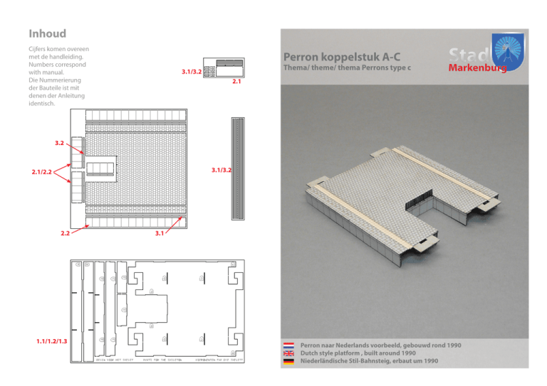Inhoud Cijfers komen overeen met de handleiding. Numbers correspond with manual. Die Nummerierung der Bauteile ist mit denen der Anleitung identisch. Perron koppelstuk A-C Thema/ theme/ thema Perrons type c 3.1/3.2 2.1 3.2 3.1/3.2 2.1/2.2 2.2 1.1/1.2/1.3 3.1 Perron naar Nederlands voorbeeld, gebouwd rond 1990 Dutch style platform , built around 1990 Niederländische Stil-Bahnsteig, erbaut um 1990 Tips, trucs en aanbevelingen Snij een onderdeel pas uit als het direct nodig is voor de assemblage. Houd de onderdelen zo veel mogelijk uit de buurt van vocht. Extra “vervuilen” kan met poeders of zeer bescheiden met de airbrush. Wees extra voorzichtig met Keep the parts away from de kozijnen en andere dunne moisture as much as possible. onderdelen. Extra “weathering” can be done with powders or, very Verlichting modest, with an airbrush. Indien gewenst, bouw deze in bij stap 1 van de handleiGlue ding. General wood glue is good to Lijmen Doorsnee houtlijm is prima te gebruiken voor het opbouwen van Markenburg producten. Wees spaarzaam met het gebruik van lijm. Voor het gedoseerd aanbrengen van de lijm kan een druppel lijm op een plaatje worden geplakt waarna met b.v. een cocktailprikker de lijm van de druppel op de onderdelen aangebracht kan worden. Probeer onderdelen eerst droog in elkaar te zetten, dit geeft waardevolle informatie en ruimte voor correcties. Als alles duidelijk is kan er met lijm gewerkt worden. Onderdelen uitsnijden Gebruik een scherp mesje. Tips, tricks and recommendations use for building Markenburg products. Benodigd bij de bouw Benodigde materialen: Deze handleiding (Hout)lijm Scherp (hobby)mesje Goed licht Handig: Coctailprikkers (zie tips). Be sparingly with the use of glue. For the dosed application of the adhesive, please paste a drop of glue on a piece of paper and then put with, for example a toothpick, little bits of glue from the drop of glue at the paper onto the parts. Papiertje of plaatje voor het Try first to assemble the dry plaatsen van enkele druppels parts, this provides valuable information and space for lijm. corrections. When everything is clear it can be glued Schone werkruimte zodat kleine onderdelen niet direct together. kwijtraken. Vergrootglas of loep. Eventueel verlichting e.d. Snij achtergebleven reststuk- zoals Led’s en lakdraad. jes eerst uit de onderdelen voordat het onderdeel uit het frame gesneden wordt. Cutting parts Please use a sharp knife. First, cut of residual pieces out of the components before cutting the parts out of the frame. Cut out a part only when it is directly necessary for the assembly. Tipps, Tricks und Empfehlungen Take special care with the windowframes and other thin Bauteile nicht feucht werden parts. lassen. Ein “gealtertes Finish” des Hauses kann mit Puder Lights oder mit dezentem Einsatz If desired, build them in at von Airbrush erfolgen. step 1 of the manual. Kleben Holzleim ist ideal für den Zusammenbau der Markenburg Produkte. Required for the construction Required materials: This manual (Wood) glue Sharp (hobby) knife Good lighting Handy: Toothpicks (see tips). Seien Sie bei filigranen Teilen wie z.B. Fensterrahmen besonder vorsichtig. Leuchten Wenn Sie Ihr Haus mit Beleuchtung versehen wollen, bauen Sie diese in Schritt 1 der Anleitung ein Erforderlich für den Bau Benötigte Materialien: Diese Anleitung (Holz-) Leim Scharfes (Hobby-) Messer Zur Klebstoffdosierung empGutes Licht fehlen wir etwas Leim auf ein Stück Papier zu geben und Hilfsmaterial: den Leim mit einem ZahnstoZahnstocher (siehe Tipps). cher zu übertragen. Leim bitte sparsam verwenden Papier oder Platte für die PlatBitte den Bausatz erst trocken zierung von ein paar Tropfen vormontieren, es ermöglicht Klebstoff. Ihnen Korrekturen. Wenn alles klar ist, zusammen leimen. Clean workspace so that Sauberer Arbeitsbereich, ggf, small parts will not immediaSchüssel, damit keine Teile Teile ausschneiden tely be lost. verloren gehen. Verwenden Sie ein scharfes Messer, z.B. Cutter. Magnifying glass Lupe Paper or plate for placing a few drops of glue. Any lighting etc, such as LEDs Schneiden Sie die Abfallstücke, wie z.B. Fenster zuerst and thin wires. aus. Lösen Sie dann das Bauteil vom Rahmen. Bitte die Teile nur unmittelbar vor der Montage ausschneiden, damit sie nicht verloren gehen. Zusätzliche Beleuchtung etc, wie zum Beispiel LEDs und dünnen Draht. Handleiding Manual Anleitung Stap 1 Zet het skelet in elkaar. Zorg dat de letters bij elkaar komen (A bij A etc..) Begin bij de “A” onderdelen en ga zo verder. Step 1 Put the skeleton together. Make sure that the letters come together (A to A etc..) Start at the “A” parts and so on. Schritt 1 Fügen Sie den Grundkörper zusammen, dabei müssen gleiche Buchstaben zusammen passen (A auf A usw.) Stap 1.1 Stap 1.2 Stap 1.3 Stap 2 Bouw de handrails op zoals op de foto’s. Plak de perronranden met handrails tegen het skelet. Plak dan de bestrating op het skelet. Lijn de bestrating uit met de handrails. Step 2 Construct the handrails as shown in the pictures. Paste the platform edges with handrails on the skeleton. Than paste the pavement on to the skeleton. Align the pavement with the handrails. Schritt 2 Konstruieren Sie die Handläufe. Fügen Sie die Bahnsteigkanten mit Handläufe auf dem Skelett. Fügen Sie den Pflaster auf das Skelett. Richten Sie den Pflaster aus mit die Handläufe. Stap 2.1 Stap 2.2 Stap 2.3 Stap 3 Plak de geleidetegels in de open ruimten van de bestrating. De zwarte tegels zijn optioneel. Indien gewenst zullen de witte tegels ingekort moeten worden. Dan kunnen de extra “rand” strookjes aangebracht worden. Step 3 Paste the guiding tiles in the open spaces of the pavement. The black tiles are optional. If desired the white tiles will need to be shortened with a sharp knife. Then the extra “edge” strips can be applied. Schritt 3 Montiern Sie die Blindenleitstreifen. Die schwarzen Fliesen sind optional. Wenn gewünscht, müssen die weißen Fliesen mit eine