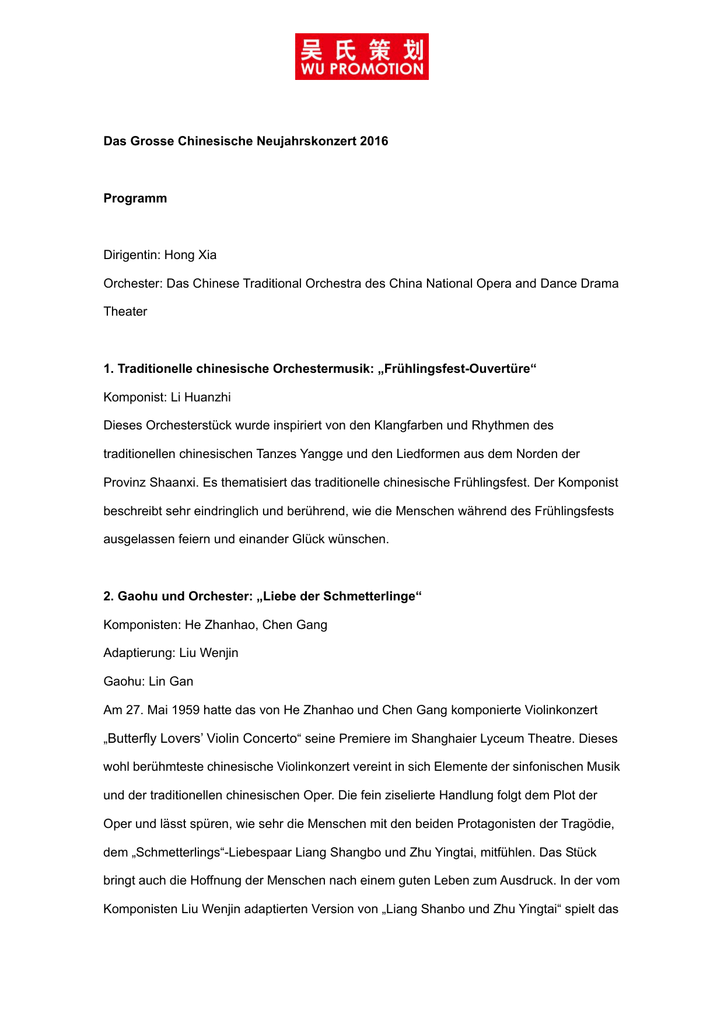 Das Grosse Chinesische Neujahrskonzert 2016 Programm Dirigentin: Hong Xia Orchester: Das Chinese Traditional Orchestra des China National Opera and Dance Drama Theater 1. Traditionelle chinesische Orchestermusik: „Frühlingsfest-Ouvertüre“ Komponist: Li Huanzhi Dieses Orchesterstück wurde inspiriert von den Klangfarben und Rhythmen des traditionellen chinesischen Tanzes Yangge und den Liedformen aus dem Norden der Provinz Shaanxi. Es thematisiert das traditionelle chinesische Frühlingsfest. Der Komponist beschreibt sehr eindringlich und berührend, wie die Menschen während des Frühlingsfests ausgelassen feiern und einander Glück wünschen. 2. Gaohu und Orchester: „Liebe der Schmetterlinge“ Komponisten: He Zhanhao, Chen Gang Adaptierung: Liu Wenjin Gaohu: Lin Gan Am 27. Mai 1959 hatte das von He Zhanhao und Chen Gang komponierte Violinkonzert „Butterfly Lovers’ Violin Concerto“ seine Premiere im Shanghaier Lyceum Theatre. Dieses wohl berühmteste chinesische Violinkonzert vereint in sich Elemente der sinfonischen Musik und der traditionellen chinesischen Oper. Die fein ziselierte Handlung folgt dem Plot der Oper und lässt spüren, wie sehr die Menschen mit den beiden Protagonisten der Tragödie, dem „Schmetterlings“-Liebespaar Liang Shangbo und Zhu Yingtai, mitfühlen. Das Stück bringt auch die Hoffnung der Menschen nach einem guten Leben zum Ausdruck. In der vom Komponisten Liu Wenjin adaptierten Version von „Liang Shanbo und Zhu Yingtai“ spielt das Instrument Gaohu die Hauptrolle, eine zweisaitige Kniegeige, was dem Stück eine stark traditionell chinesische Färbung verleiht. 3. Lusheng und Orchester: „Der Zug fährt in die Dong-Dörfer” Komponisten: Yi Yongren, Zhang Dasen Lusheng: Song Yang „Der Zug fährt in die Dong-Dörfer” wurde von der musikalischen Tradition der Nationalität der Dong inspiriert und ist ein bekanntes Stück für das Lusheng, eine Mundorgel mit sechs Pfeifen aus Bambus und einer Windkammer aus Hartholz. Das Werk macht sich die ungewöhnlichen imitatorischen Fähigkeiten des Lusheng zunutze und beschreibt anschaulich, wie ein Zug, dessen Pfeife an ausgelassene Freudenlieder erinnert, durch Bergtäler und Tunnel fährt. Die Lebendigkeit des Stücks lässt uns das überschwängliche Lebensgefühl der Dong erahnen. 4. Traditionelle Kammermusik „Daling-Weise“ Komponist: Wang Yunfei Piri: Wu Shude Guzheng: Lei Dianyun „Daling“ ist im Koreanischen der Oberbegriff für „Volkslied“. Das von der koreanischen Volksmusik inspirierte Stück „Daling-Weise“ verbindet eine Reihe von Liedern, die von ganz verschiedenen Instrumenten aus der Volksmusik interpretiert werden. Die ausladenden Vibrati und der tänzerische Rhythmus des Stücks sind typisch für die Musik der koreanischen Minderheit in China. Der Einsatz spezieller koreanischer Instrumente wie des Janggu, Piri oder Gayageum verleiht dem Stück seine ganz eigene Note. Die Mitglieder des Chinese Traditional Orchestra des China National Opera and Dance Drama Theater sind eigens in den autonomen koreanischen Bezirk Yanbian gefahren, um sich mit dem Stil dieser Musik vertraut zu machen und traditionelle Lieder zu sammeln. In erster Linie ging es ihnen aber darum, die traditionellen koreanischen Instrumente Janggu, Piri, Gayageum und Haegeum zu erlernen. Sie haben sich gezielt und intensiv auf die heutige Aufführung dieses Stücks vorbereitet, um die herausragende Kultur der koreanischen Minderheit adäquat zu vermitteln und das Publikum eine wahrhaft authentische Volksmusik erleben zu lassen. 5. Mehrstimmiges Stück für Suona: „Dem Yangge zuschauen“ Volkslied aus Shanxi Adaptierung: Jing Jianshu Suona: Shan Weiwei, Liu Xizhan „Dem Yangge zuschauen“ ist eine Volksweise aus der Gegend um Qitai in der Provinz Shanxi. Außerdem ist es eines der repräsentativsten Werke für die Yangge („Reispflanzerlieder“) dieser Region. Jing Jianshu bedient sich der Lebendigkeit der Suona, einem traditionellen chinesischen Holzblasinstrument. Er beschreibt sehr eindringlich, wie zwei Schwestern aus einem Dorf, die unbedingt eine Aufführung des Yangge sehen wollen, dem strömenden Regen trotzen und um die besten Plätze drängeln. Das Stück vermittelt uns, wie sehr die Bewohner der Dörfer im Norden Chinas volkstümliche Aktivitäten schätzen, und lässt uns ihre positive Haltung dem Leben gegenüber spüren. 6. Jinghu und Orchester: „Tief in der Nacht“ Komponist: Wu Hua Jinghu: Bo Miao Jing‘erhu: Yang Wenna Große chinesische Trommel: Wang Jianan Dieses Werk basiert auf der Passage „Der Wind weht über die Lotosblätter“ aus der traditionellen Kunqu-Oper „Sifan steigt den Berg hinab“, die im Laufe der Zeit von den Opern-Musikern zu ihrer heutigen Form adaptiert wurde. Der Titel des Werkes sind die ersten drei Zeichen des ersten Liedes der Oper. „Der Wind weht über die Lotosblätter“ beschreibt wie die junge Nonne Sifan über ihr einsames und kümmerliches Leben in einem buddhistischen Kloster klagt. Die Verfasser von „Tief in der Nacht“ verwenden verschiedene Methoden aus der Volksmusik (wie Ausschmückungen, Streichungen und Straffungen, Umschreibungen) und verwandeln so die ursprünglich traurig-trotzige Melodie in ein kraftvolles, leidenschaftliches Musikstück mit einem völlig neuen Charakter. Bei der Adaptierung dieser traditionellen Inhalte wurden die Stärken verschiedener Aufführungsvarianten kombiniert und die Struktur des Stückes dahingehend erweitert, so dass es nun Prolog, Adagio, Moderato und Allegro umfasst. 7. Traditionelles chinesisches Orchesterstück „Wie viel weißt du über chinesische Blas- und Saiten-Instrumente?“ Komponist: Guan Naizhong Das Stück „Wie viel weißt du über chinesische Blas- und Saiten-Instrumente?“ stellt die verschiedenen Instrumente vor, die in einem großen chinesischen Orchester zum Einsatz kommen. Komponiert wurde das Werk vom berühmten taiwanesischen Musiker Guan Naizhong, der auf Ethno-Musik 