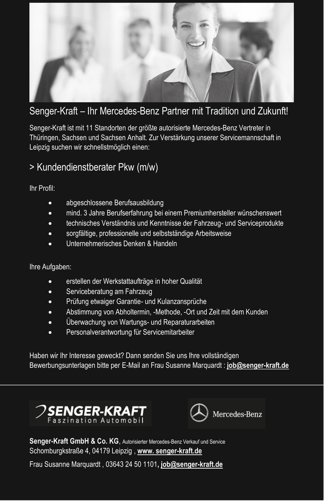 Senger-Kraft – Ihr Mercedes-Benz Partner mit Tradition und Zukunft! Senger-Kraft ist mit 11 Standorten der größte autorisierte Mercedes-Benz Vertreter in Thüringen, Sachsen und Sachsen Anhalt. Zur Verstärkung unserer Servicemannschaft in Leipzig suchen wir schnellstmöglich einen: > Kundendienstberater Pkw (m/w) Ihr Profil: abgeschlossene Berufsausbildung mind. 3 Jahre Berufserfahrung bei einem Premiumhersteller wünschenswert technisches Verständnis und Kenntnisse der Fahrzeug- und Serviceprodukte sorgfältige, professionelle und selbstständige Arbeitsweise Unternehmerisches Denken & Handeln Ihre Aufgaben: erstellen der Werkstattaufträge in hoher Qualität Serviceberatung am Fahrzeug Prüfung etwaiger Garantie- und Kulanzansprüche Abstimmung von Abholtermin, -Methode, -Ort und Zeit mit dem Kunden Überwachung von Wartungs- und Reparaturarbeiten Personalverantwortung für Servicemitarbeiter Haben wir Ihr Interesse geweckt? Dann senden Sie uns Ihre vollständigen Bewerbungsunterlagen bitte per E-Mail an Frau Susanne Marquardt : [email protected] Senger-Kraft GmbH & Co. KG, Autorisierter Mercedes-Benz Verkauf und Service Schomburgkstraße 4, 04179 Leipzig , www. senger-kraft.de Frau Susanne Marquardt , 03643 24 50 1101, [email protected]
