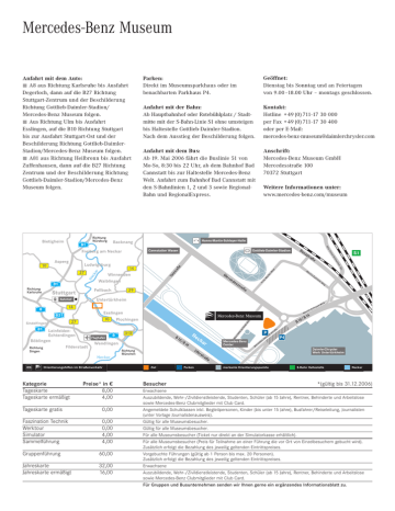 Mercedes-Benz Museum Anfahrt mit dem Auto: A8 aus Richtung Karlsruhe bis Ausfahrt Degerloch, dann auf die B27 Richtung Stuttgart-Zentrum und der Beschilderung Richtung Gottlieb-Daimler-Stadion/ Mercedes-Benz Museum folgen. Aus Richtung Ulm bis Ausfahrt Esslingen, auf die B10 Richtung Stuttgart bis zur Ausfahrt Stuttgart-Ost und der Beschilderung Richtung Gottlieb-DaimlerStadion/Mercedes-Benz Museum folgen. A81 aus Richtung Heilbronn bis Ausfahrt Zuffenhausen, dann auf die B27 Richtung Zentrum und der Beschilderung Richtung Gottlieb-Daimler-Stadion/Mercedes-Benz Museum folgen. Richtung Würzburg Kontakt: Hotline + 49 (0) 711-17 30 000 per Fax + 49 (0) 711-17 30 400 oder per E-Mail: [email protected] Anfahrt mit dem Bus: Ab 19. Mai 2006 fährt die Buslinie 51 von Mo-So, 8:30 bis 22 Uhr, ab dem Bahnhof Bad Cannstatt bis zur Haltestelle Mercedes-Benz Welt. Anfahrt zum Bahnhof Bad Cannstatt mit den S-Bahnlinien 1, 2 und 3 sowie RegionalBahn und RegionalExpress. Anschrift: Mercedes-Benz Museum GmbH Mercedesstraße 100 70372 Stuttgart Al im ße eg r- ti al te ar de n- -W ce Sc itz Ta ls W M . t ra Str Ne ck ar er er ss hr t ra en 29 k- W eg ße Untertürkheim Esslingen 10 Plochingen e ti ar n-S ch ren k-W eg 4 B1 lli ne k- St 27 M 0/ B1 r. 831 Sindelfingen he M 14 8 rk Bahnhof rtü 14 Winnenden Waiblingen Fellbach Stuttgart S1 te 81 Be nz str aß e Un 27 Gottlieb-Daimler-Stadion te Ludwigsburg 10 Weitere Informationen unter: www.mercedes-benz.com/museum Hanns-Martin-Schleyer-Halle Cannstatter Wasen Freiberg am Neckar Richtung Karlsruhe Anfahrt mit der Bahn: Ab Hauptbahnhof oder Rotebühlplatz / Stadtmitte mit der S-Bahn-Linie S1 ohne umsteigen bis Haltestelle Gottlieb-Daimler-Stadion. Nach dem Ausstieg der Beschilderung folgen. Backnang 81 Asperg Geöffnet: Dienstag bis Sonntag und an Feiertagen von 9.00–18.00 Uhr – montags geschlossen. Fr Bietigheim Parken: Direkt im Museumsparkhaus oder im benachbarten Parkhaus P4. s- B1 0/ Wendlingen B1 4 Ne ck ar Uf er Richtung München Singen Neckar Orientierungshilfen im Straßenverkehr Kategorie Tageskarte Tageskarte ermäßigt Preise* in € 8,00 4,00 Tageskarte gratis 0,00 Faszination Technik Werktour Simulator Sammelführung 0,00 0,00 4,00 4,00 Gruppenführung 60,00 Jahreskarte Jahreskarte ermäßigt 32,00 16,00 Ziel Besucher Parken str P de 313 ce 8 er Flughafen M LeinfeldenEchterdingen Böblingen Filderstadt Richtung Je 81 Mercedes-Benz Center M er ce de s- l Je lin ek -S tr aß e P4 DaimlerChrysler Werk Untertürkheim aß e markante Orientierungspunkte S-Bahn Haltestelle Neckar *(gültig bis 31.12.2006) Erwachsene Auszubildende, Wehr-/Zivildienstleistende, Studenten, Schüler (ab 15 Jahre), Rentner, Behinderte und Arbeitslose sowie Mercedes-Benz Clubmitglieder mit Club Card. Angemeldete Schulklassen inkl. Begleitpersonen, Kinder (bis unter 15 Jahre), Busfahrer/Reiseleitung, Journalisten (unter Vorlage Journalistenausweis). Gültig für alle Museumsbesucher. Gültig für alle Museumsbesucher. Für alle Museumsbesucher (Ticket nur direkt an der Simulatorkasse erhältlich). Für alle Museumsbesucher (Preis für Teilnahme an einer Führung die vor Ort von Einzelbesuchern gebucht wird). Zusätzlich erfolgt die Bezahlung des jeweilig geltenden Eintrittspreises. Vorgebuchte Führungen (gültig ab 1 Person bis max. 20 Personen). Zusätzlich erfolgt die Bezahlung des jeweilig geltenden Eintrittspreises. Erwachsene Auszubildende, Wehr-/Zivildienstleistende, Studenten, Schüler (ab 15 Jahre), Rentner, Behinderte und Arbeitslose sowie Mercedes-Benz Clubmitglieder mit Club Card. Für Gruppen und Busunternehmen senden wir Ihnen gerne ein ergänzendes Informationsblatt zu.