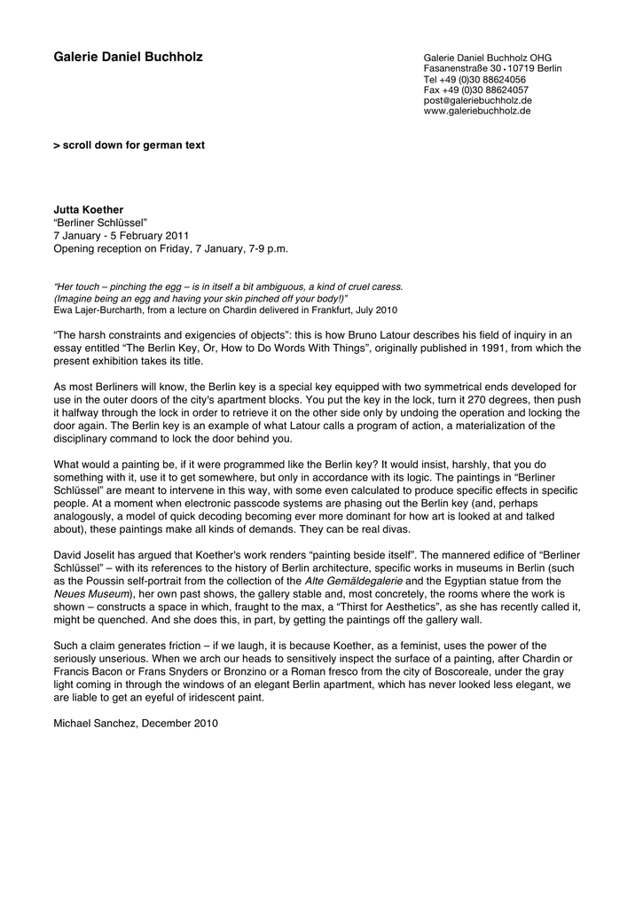 Galerie Daniel Buchholz Galerie Daniel Buchholz OHG Fasanenstraße 30 • 10719 Berlin Tel +49 (0)30 88624056 Fax +49 (0)30 88624057 [email protected] www.galeriebuchholz.de > scroll down for german text Jutta Koether “Berliner Schlüssel” 7 January - 5 February 2011 Opening reception on Friday, 7 January, 7-9 p.m. “Her touch – pinching the egg – is in itself a bit ambiguous, a kind of cruel caress. (Imagine being an egg and having your skin pinched off your body!)” Ewa Lajer-Burcharth, from a lecture on Chardin delivered in Frankfurt, July 2010 “The harsh constraints and exigencies of objects”: this is how Bruno Latour describes his field of inquiry in an essay entitled “The Berlin Key, Or, How to Do Words With Things”, originally published in 1991, from which the present exhibition takes its title. As most Berliners will know, the Berlin key is a special key equipped with two symmetrical ends developed for use in the outer doors of the city's apartment blocks. You put the key in the lock, turn it 270 degrees, then push it halfway through the lock in order to retrieve it on the other side only by undoing the operation and locking the door again. The Berlin key is an example of what Latour calls a program of action, a materialization of the disciplinary command to lock the door behind you. What would a painting be, if it were programmed like the Berlin key? It would insist, harshly, that you do something with it, use it to get somewhere, but only in accordance with its logic. The paintings in “Berliner Schlüssel” are meant to intervene in this way, with some even calculated to produce specific effects in specific people. At a moment when electronic passcode systems are phasing out the Berlin key (and, perhaps analogously, a model of quick decoding becoming ever more dominant for how art is looked at and talked about), these paintings make all kinds of demands. They can be real divas. David Joselit has argued that Koether's work renders “painting beside itself”. The mannered edifice of “Berliner Schlüssel” – with its references to the history of Berlin architecture, specific works in museums in Berlin (such as the Poussin self-portrait from the collection of the Alte Gemäldegalerie and the Egyptian statue from the Neues Museum), her own past shows, the gallery stable and, most concretely, the rooms where the work is shown – constructs a space in which, fraught to the max, a “Thirst for Aesthetics”, as she has recently called it, might be quenched. And she does this, in part, by getting the paintings off the gallery wall. Such a claim generates friction – if we laugh, it is because Koether, as a feminist, uses the power of the seriously unserious. When we arch our heads to sensitively inspect the surface of a painting, after Chardin or Francis Bacon or Frans Snyders or Bronzino or a Roman fresco from the city of Boscoreale, under the gray light coming in through the windows of an elegant Berlin apartment, which has never looked less elegant, we are liable to get an eyeful of iridescent paint. Michael Sanchez, December 2010 Galerie Daniel Buchholz Galerie Daniel Buchholz OHG Neven-DuMont-Str. 17 50667 Köln Tel +49-221-2574946 Fax +49-221-253351 [email protected] www.galeriebuchholz.de Jutta Koether “Berliner Schlüssel“ 7. Januar - 5. Februar 2011 Eröffnung am Freitag, dem 7. Januar, von 19 - 21 Uhr “Ihre Berührung – beim Pellen des Eis – ist ihrerseits ein wenig mehrdeutig, eine Art grausamer Liebkosung (man stelle sich nur einmal vor, man wäre selbst ein Ei, dem man die Haut vom Körper pellt!).” Ewa Lajer-Burcharth, Auszug aus einem im Juli 2010 in Frankfurt gehaltenen Vortrag über Chardin “Die strengen Zwänge und Forderungen von Objekten” – so beschreibt Bruno Latour in seinem 1991 veröffentlichten Aufsatz “Der Berliner Schlüssel. Erkundungen eines Liebhabers der Wissenschaften”, dem sich der Titel der vorliegenden Ausstellung verdankt, sein Forschungsgebiet. Wie den meisten Berlinern bekannt sein dürfte, verfügt der Berliner Schlüssel über zwei an beiden Seiten symmetrisch angebrachte Bärte und wurde ursprünglich zum Abschließen der Außentüren Berliner Mehrfamilienhäuser entwickelt. Dazu steckt man ihn zunächst ins Schlüsselloch, dreht ihn zum Aufschließen um 270 Grad, schiebt ihn anschließend durch das Schlüsselloch, zieht ihn auf der anderen Seite heraus, um die Tür von Innen wieder abzuschließen. Der Berliner Schlüssel ist ein Beispiel für eine Materialisierung des Disziplinarbefehls, ständig die Tür hinter sich abzuschließen, die Latour als Handlungsprogramm bezeichnet. Was wäre ein Gemälde, wenn wir wie der Berliner Schlüssel programmiert wären? Es würde schroff darauf bestehen, dass man etwas mit ihm anfängt und mit seiner Hilfe ein bestimmtes Ziel erreicht, dies jedoch ausschließlich entsprechend seiner eigenen Logik. Die Bilder der Ausstellung “Berliner Schlüssel“ sollen in derselben Weise intervenieren, einige von ihnen sind sogar so angelegt, dass sie bei bestimmten Menschen eine bestimmte Wirkung erzielen. Zu einem Zeitpunkt, da elektronische Passcode-Systeme nach und nach den Berliner Schlüssel verdrängen (und vielleicht analog dazu das Modell einer schnellen Dekodierung zunehmend die Betrachtung von Kunst und das Sprechen über sie prägt), stellen diese Bilder allerhand Ansprüche. Sie können sich geradezu wie Diven aufführen. David Joselit schreibt, Koethers Werk sei “Painting besides itself”. Das manierierte Gedankengebäude von “Berliner Schlüssel” einschließlich der vielfältigen Bezüge zur Berliner Geschichte und Architektur sowie zu einzelnen Kunstwerken aus Berliner Museen (darunter ein Poussin-Selbstbildnis aus der Sammlung der Alten Gemäldegalerie und eine ägyptische Skulptur aus dem Neuen Museum), aber auch Koethers eigene vergangene Ausstellungen, der Galeriezusammenhang und ganz konkret die Räume, in denen die vorliegenden Arbeiten gez