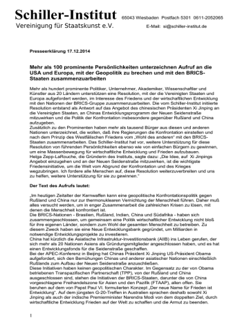 Schiller-Institut Vereinigung für Staatskunst e.V. 65043 Wiesbaden Postfach 5301 0611-2052065 E-Mail: [email protected] Presseerklärung 17.12.2014 Mehr als 100 prominente Persönlichkeiten unterzeichnen Aufruf an die USA und Europa, mit der Geopolitik zu brechen und mit den BRICSStaaten zusammenzuarbeiten Mehr als hundert prominente Politiker, Unternehmer, Akademiker, Wissenschaftler und Künstler aus 20 Ländern unterstützen eine Resolution, mit der die Vereinigten Staaten und Europa aufgefordert werden, im Interesse des Friedens und der wirtschaftlichen Entwicklung mit den Nationen der BRICS-Gruppe zusammenzuarbeiten. Die vom Schiller-Institut initiierte Resolution entstand als Antwort auf das Angebot des chinesischen Präsidenten Xi Jinping an die Vereinigten Staaten, an Chinas Entwicklungsprogramm der Neuen Seidenstraße mitzuwirken und die Politik der Konfrontation insbesondere gegenüber Rußland und China aufzugeben. Zusätzlich zu den Prominenten haben mehr als tausend Bürger aus diesen und anderen Nationen unterzeichnet, die wollen, daß ihre Regierungen die Konfrontation einstellen und nach dem Prinzip des Westfälischen Friedens vom „Wohl des anderen“ mit den BRICSStaaten zusammenarbeiten. Das Schiller-Institut hat vor, weitere Unterstützung für diese Resolution von führenden Persönlichkeiten ebenso wie von einfachen Bürgern zu gewinnen, um eine Massenbewegung für wirtschaftliche Entwicklung und Frieden aufzubauen. Helga Zepp-LaRouche, die Gründerin des Instituts, sagte dazu: „Die Idee, auf Xi Jinpings Angebot einzugehen und an der Neuen Seidenstraße mitzuwirken, ist die wichtigste Friedensinitiative, um die Welt vom Abgrund der Konfrontation und des Krieges wegzubringen. Ich fordere alle Menschen auf, diese Resolution weiterzuverbreiten und uns zu helfen, weitere Unterstützung für sie zu gewinnen.“ Der Text des Aufrufs lautet: „Im heutigen Zeitalter der Kernwaffen kann eine geopolitische Konfrontationspolitik gegen Rußland und China nur zur thermonuklearen Vernichtung der Menschheit führen. Daher muß alles versucht werden, um in enger Zusammenarbeit die zahlreichen Krisen zu lösen, mit denen die Menschheit konfrontiert ist. Die BRICS-Nationen - Brasilien, Rußland, Indien, China und Südafrika - haben sich zusammengeschlossen, um gemeinsam eine Politik wirtschaftlicher Entwicklung nicht bloß für ihre eigenen Länder, sondern zum Wohl der gesamten Menschheit zu betreiben. Zu diesem Zweck haben sie eine Neue Entwicklungsbank gegründet, um Milliarden in notwendige Entwicklungsprojekte zu investieren. China hat kürzlich die Asiatische Infrastruktur-Investitionsbank (AIIB) ins Leben gerufen, der sich mehr als 20 Nationen Asiens als Gründungsmitglieder angeschlossen haben, und es hat einen Entwicklungsfonds für die Seidenstraße geschaffen. Bei der APEC-Konferenz in Beijing hat Chinas Präsident Xi Jinping US-Präsident Obama aufgefordert, sich den Bemühungen Chinas und anderer asiatischer Nationen einschließlich Rußlands zum Aufbau der Neuen Seidenstraße anzuschließen. Diese Initiativen haben keinen geopolitischen Charakter. Im Gegensatz zu der von Obama betriebenen Transpazifischen Partnerschaft (TPP), von der Rußland und China ausgeschlossen sind, stehen die Initiativen der BRICS-Staaten, darunter die von China vorgeschlagene Freihandelszone für Asien und den Pazifik (FTAAP), allen offen. Sie beruhen auf dem von Papst Paul VI. formulierten Konzept „Der neue Name für Frieden ist Entwicklung“. Auf dem jüngsten G-20-Treffen in Australien sprachen deshalb sowohl Xi Jinping als auch der indische Premierminister Narendra Modi von dem doppelten Ziel, durch wirtschaftliche Entwicklung Frieden auf der Welt zu schaffen und die Armut zu beenden. 1 Es gibt kein Problem auf der Welt, das nicht auf diese Weise gelöst werden könnte, und umgekehrt gibt es kein Problem, das ohne diesen Ansatz gelöst werden könnte. So ist die Zusammenarbeit zwischen den USA, Rußland, China, Indien und anderen Nationen unabdingbar, um die Ebola-Epidemie in Afrika zu besiegen. Die terroristische Bedrohung durch ISIS und Al-Kaida richtet sich gleichermaßen gegen Rußland, China und Indien wie gegen die USA und Europa. Sie kann nur durch eine auf Zusammenarbeit gegründete Sicherheitsarchitektur besiegt werden. Die Politik, unter dem Vorwand der Demokratie sogenannte „Farbenrevolutionen“ anzuzetteln, ist eine Kriegspolitik, auch wenn sie nicht so bezeichnet wird, denn ihr Ziel ist es, Regierungen mit Hilfe ausländischer Gelder zu stürzen. Das muß aufhören. Die Politik, Rußland mit Sanktionen zu überziehen, weil es sich gegen derartige „Farbenrevolutionen“ und gegen den Naziputsch in der Ukraine wehrt, verschärft nur die globale Krise. Ein Vorgehen, das auf gegenseitiger Zusammenarbeit beruht, schüfe hingegen die Grundlage für globalen Frieden. Während die USA Kennedys Weltraumprogramm aufgegeben haben, betreiben die Chinesen ein Mondprogramm, das darauf abzielt, auf dem Mond Helium-3 abzubauen, um damit auf der Erde unbegrenzte Energie aus Kernfusion zu gewinnen. Durch eine Zusammenarbeit zwischen den USA, Europa, Rußland, China, Indien und anderen Nationen könnte die Menschheit endlich Johannes Keplers Vision verwirklichen, zum Wohle der Menschheit die Gesetze des Sonnensystems zu meistern. Nur dieser Weg kann die Vereinigten Staaten und Europa zu ihrer ursprünglichen Zielsetzung zurückführen, wie sie in der europäischen Renaissance und der Amerikanischen Revolution zum Ausdruck kam - einer Zielsetzung, von der sich die USA und Europa immer mehr verabschiedet haben, die aber jetzt von der übrigen Welt aufgegriffen und von ihnen wieder eingefordert wird. Wir fordern daher die Vereinigten Staaten und Europa auf, die selbstmörderische Geopolitik der Vergangenheit, die schon zu zwei Weltkriegen geführt hat und zu einem dritten zu führen droht, aufzugeben. Statt dessen sollten wir eine Zukunft für die gesamte Menschheit aufbauen, indem wir 