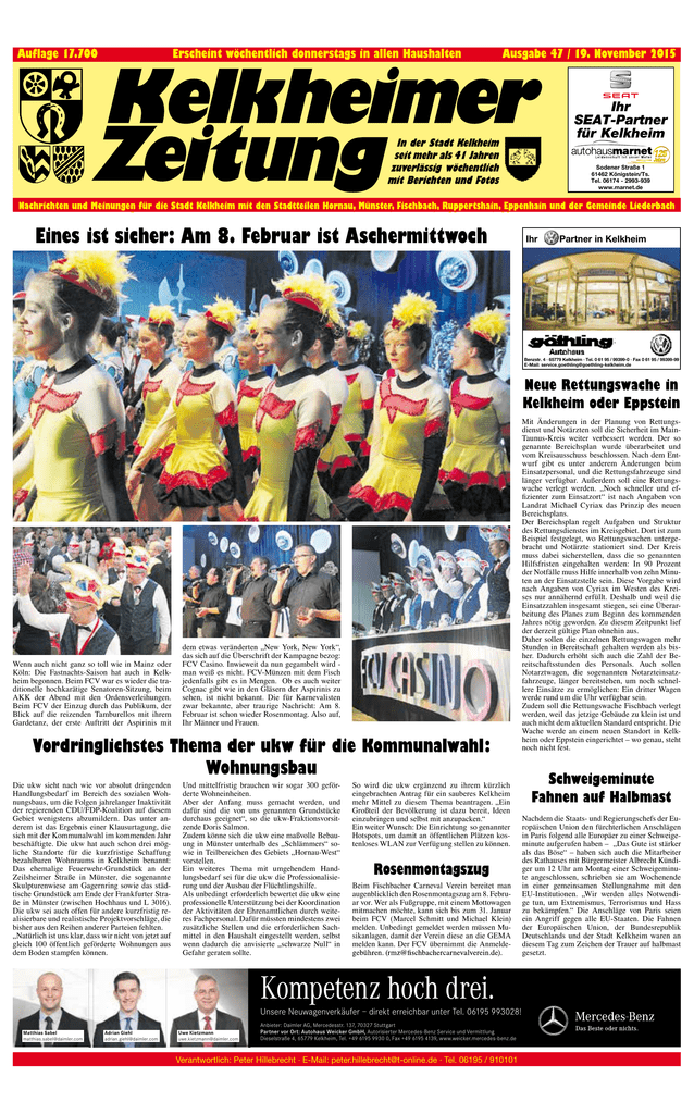 Auflage 17.700 Erscheint wöchentlich donnerstags in allen Haushalten Ausgabe 47 / 19. November 2015 Ihr SEAT-Partner für Kelkheim In der Stadt Kelkheim seit mehr als 41 Jahren zuverlässig wöchentlich mit Berichten und Fotos Sodener Straße 1 61462 Königstein/Ts. Tel. 06174 - 2993-939 www.marnet.de Nachrichten undund Meinungen fürfür diedieStadt Münster, Fischbach, Fischbach,Ruppertshain, Ruppertshain,Eppenhain Eppenhain und Gemeinde Liederbach Nachrichten Meinungen StadtKelkheim Kelkheimmit mitden denStadtteilen Stadtteilen Hornau, Hornau, Münster, und derder Gemeinde Liederbach Eines ist sicher: Am 8. Februar ist Aschermittwoch Ihr Partner in Kelkheim Benzstr. 4 · 65779 Kelkheim · Tel. 0 61 95 / 99399-0 · Fax 0 61 95 / 99399-99 E-Mail: [email protected] Neue Rettungswache in Kelkheim oder Eppstein Unbenannt-13 1 Wenn auch nicht ganz so toll wie in Mainz oder Köln: Die Fastnachts-Saison hat auch in Kelkheim begonnen. Beim FCV war es wieder die traditionelle hochkarätige Senatoren-Sitzung, beim AKK der Abend mit den Ordensverleihungen. Beim FCV der Einzug durch das Publikum, der Blick auf die reizenden Tamburellos mit ihrem Gardetanz, der erste Auftritt der Aspirinis mit dem etwas veränderten „New York, New York“, das sich auf die Überschrift der Kampagne bezog: FCV Casino. Inwieweit da nun gegambelt wird man weiß es nicht. FCV-Münzen mit dem Fisch jedenfalls gibt es in Mengen. Ob es auch weiter Cognac gibt wie in den Gläsern der Aspirinis zu sehen, ist nicht bekannt. Die für Karnevalisten zwar bekannte, aber traurige Nachricht: Am 8. Februar ist schon wieder Rosenmontag. Also auf, Ihr Männer und Frauen. Vordringlichstes Thema der ukw für die Kommunalwahl: Wohnungsbau Die ukw sieht nach wie vor absolut dringenden Handlungsbedarf im Bereich des sozialen Wohnungsbaus, um die Folgen jahrelanger Inaktivität der regierenden CDU/FDP-Koalition auf diesem Gebiet wenigstens abzumildern. Das unter anderem ist das Ergebnis einer Klausurtagung, die sich mit der Kommunalwahl im kommenden Jahr beschäftigte. Die ukw hat auch schon drei mögliche Standorte für die kurzfristige Schaffung bezahlbaren Wohnraums in Kelkheim benannt: Das ehemalige Feuerwehr-Grundstück an der Zeilsheimer Straße in Münster, die sogenannte Skulpturenwiese am Gagernring sowie das städtische Grundstück am Ende der Frankfurter Straße in Münster (zwischen Hochhaus und L 3016). Die ukw sei auch offen für andere kurzfristig realisierbare und realistische Projektvorschläge, die bisher aus den Reihen anderer Parteien fehlten. „Natürlich ist uns klar, dass wir nicht von jetzt auf gleich 100 öffentlich geförderte Wohnungen aus dem Boden stampfen können. Und mittelfristig brauchen wir sogar 300 geförderte Wohneinheiten. Aber der Anfang muss gemacht werden, und dafür sind die von uns genannten Grundstücke durchaus geeignet“, so die ukw-Fraktionsvorsitzende Doris Salmon. Zudem könne sich die ukw eine maßvolle Bebauung in Münster unterhalb des „Schlämmers“ sowie in Teilbereichen des Gebiets „Hornau-West“ vorstellen. Ein weiteres Thema mit umgehendem Handlungsbedarf sei für die ukw die Professionalisierung und der Ausbau der Flüchtlingshilfe. Als unbedingt erforderlich bewertet die ukw eine professionelle Unterstützung bei der Koordination der Aktivitäten der Ehrenamtlichen durch weiteres Fachpersonal. Dafür müssten mindestens zwei zusätzliche Stellen und die erforderlichen Sachmittel in den Haushalt eingestellt werden, selbst wenn dadurch die anvisierte „schwarze Null“ in Gefahr geraten sollte. So wird die ukw ergänzend zu ihrem kürzlich eingebrachten Antrag für ein sauberes Kelkheim mehr Mittel zu diesem Thema beantragen. „Ein Großteil der Bevölkerung ist dazu bereit, Ideen einzubringen und selbst mit anzupacken.“ Ein weiter Wunsch: Die Einrichtung so genannter Hotspots, um damit an öffentlichen Plätzen kostenloses WLAN zur Verfügung stellen zu können. Rosenmontagszug Beim Fischbacher Carneval Verein bereitet man augenblicklich den Rosenmontagszug am 8. Februar vor. Wer als Fußgruppe, mit einem Mottowagen mitmachen möchte, kann sich bis zum 31. Januar beim FCV (Marcel Schmitt und Michael Klein) melden. Unbedingt gemeldet werden müssen Musikanlagen, damit der Verein diese an die GEMA melden kann. Der FCV übernimmt die Anmelde- Kompetenz hoch drei. Unsere Neuwagenverkäufer – direkt erreichbar unter Tel. 06195 993028! Matthias Sabel [email protected] Adrian Giehl [email protected] Uwe Kietzmann [email protected] Anbieter: Daimler AG, Mercedesstr. 137, 70327 Stuttgart Partner vor Ort: Autohaus Weicker GmbH, Autorisierter Mercedes-Benz Service und Vermittlung Dieselstraße 4, 65779 Kelkheim, Tel. +49 6195 9930 0, Fax +49 6195 4139, www.weicker.mercedes-benz.de Verantwortlich: Peter Hillebrecht · E-Mail: [email protected] · Tel. 06195 / 910101 22.03.2010 9:00:15 U Mit Änderungen in der Planung von Rettungsdienst und Notärzten soll die Sicherheit im MainTaunus-Kreis weiter verbessert werden. Der so genannte Bereichsplan wurde überarbeitet und vom Kreisausschuss beschlossen. Nach dem Entwurf gibt es unter anderem Änderungen beim Einsatzpersonal, und die Rettungsfahrzeuge sind länger verfügbar. Außerdem soll eine Rettungswache verlegt werden. „Noch schneller und effizienter zum Einsatzort“ ist nach Angaben von Landrat Michael Cyriax das Prinzip des neuen Bereichsplans. Der Bereichsplan regelt Aufgaben und Struktur des Rettungsdienstes im Kreisgebiet. Dort ist zum Beispiel festgelegt, wo Rettungswachen untergebracht und Notärzte stationiert sind. Der Kreis muss dabei sicherstellen, dass die so genannten Hilfsfristen eingehalten werden: In 90 Prozent der Notfälle muss Hilfe innerhalb von zehn Minuten an der Einsatzstelle sein. Diese Vorgabe wird nach Angaben von Cyriax im Westen des Kreises nur annähernd erfüllt. Deshalb und weil die Einsatzzahlen insgesamt stiegen, sei eine Überarbeitung des Planes zum Beginn des kommenden Jahres nötig geword