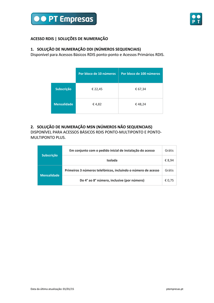 ACESSO RDIS | SOLUÇÕES DE NUMERAÇÃO 1. SOLUÇÃO DE NUMERAÇÃO DDI (NÚMEROS SEQUENCIAIS) Disponível para Acessos Básicos RDIS ponto-ponto e Acessos Primários RDIS. Por bloco de 10 números Por bloco de 100 números Subscrição € 22,45 € 67,34 Mensalidade € 4,82 € 48,24 2. SOLUÇÃO DE NUMERAÇÃO MSN (NÚMEROS NÃO SEQUENCIAIS) DISPONÍVEL PARA ACESSOS BÁSICOS RDIS PONTO-MULTIPONTO E PONTOMULTIPONTO PLUS. Em conjunto com o pedido inicial de instalação do acesso Grátis Isolada € 8,94 Primeiros 3 números telefónicos, incluindo o número de acesso Grátis Do 4° ao 8° número, inclusive (por número) € 0,75 Subscrição Mensalidade Data da última atualização: 01/01/15 ptempresas.pt