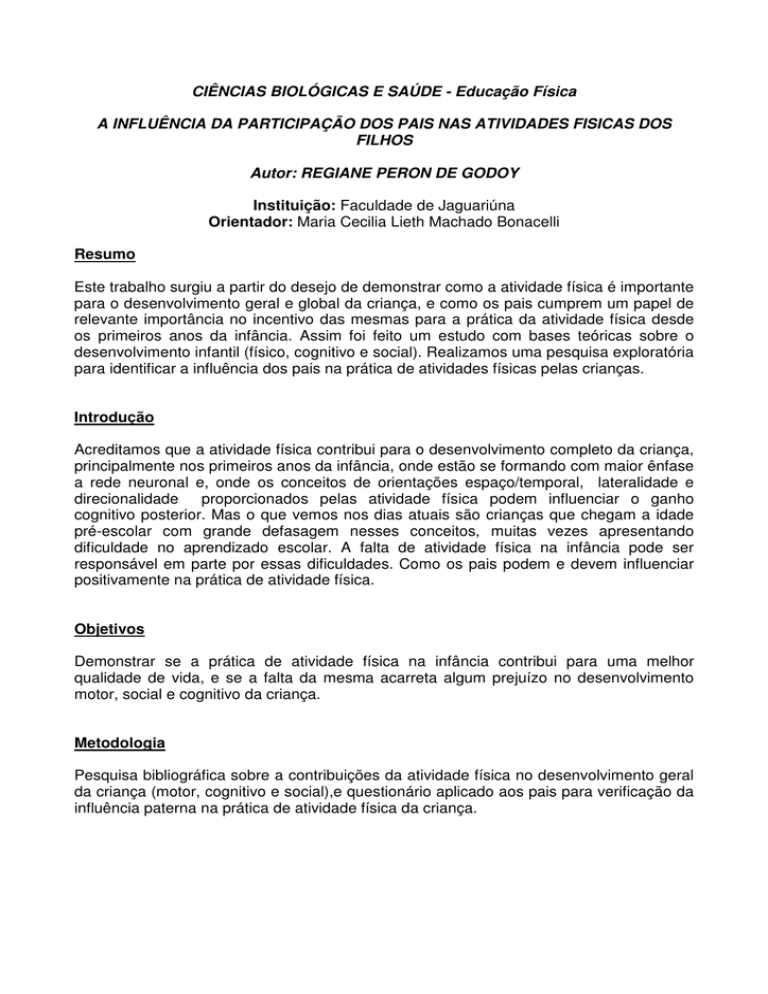 CIÊNCIAS BIOLÓGICAS E SAÚDE - Educação Física A INFLUÊNCIA DA PARTICIPAÇÃO DOS PAIS NAS ATIVIDADES FISICAS DOS FILHOS Autor: REGIANE PERON DE GODOY Instituição: Faculdade de Jaguariúna Orientador: Maria Cecilia Lieth Machado Bonacelli Resumo Este trabalho surgiu a partir do desejo de demonstrar como a atividade física é importante para o desenvolvimento geral e global da criança, e como os pais cumprem um papel de relevante importância no incentivo das mesmas para a prática da atividade física desde os primeiros anos da infância. Assim foi feito um estudo com bases teóricas sobre o desenvolvimento infantil (físico, cognitivo e social). Realizamos uma pesquisa exploratória para identificar a influência dos pais na prática de atividades físicas pelas crianças. Introdução Acreditamos que a atividade física contribui para o desenvolvimento completo da criança, principalmente nos primeiros anos da infância, onde estão se formando com maior ênfase a rede neuronal e, onde os conceitos de orientações espaço/temporal, lateralidade e direcionalidade proporcionados pelas atividade física podem influenciar o ganho cognitivo posterior. Mas o que vemos nos dias atuais são crianças que chegam a idade pré-escolar com grande defasagem nesses conceitos, muitas vezes apresentando dificuldade no aprendizado escolar. A falta de atividade física na infância pode ser responsável em parte por essas dificuldades. Como os pais podem e devem influenciar positivamente na prática de atividade física. Objetivos Demonstrar se a prática de atividade física na infância contribui para uma melhor qualidade de vida, e se a falta da mesma acarreta algum prejuízo no desenvolvimento motor, social e cognitivo da criança. Metodologia Pesquisa bibliográfica sobre a contribuições da atividade física no desenvolvimento geral da criança (motor, cognitivo e social),e questionário aplicado aos pais para verificação da influência paterna na prática de atividade física da criança. Desenvolvimento Capítulo 1.Esclarecimento teórico de como ocorre o desenvolvimento da criança tanto físico como social e cognitivo. Capítulo 2.Como os pais podem influenciar a prática de atividade física das crianças. Capítulo 3. O universo da pesquisa. Capitulo 4. Resultado da pesquisa e discussão. Capitulo 5. conclusão Resultados Preliminares Pesquisa em andamento sem resultados preliminares Fontes Consultadas ATKINSON, R. K.; ATKINSON, R. C.; SMITH, E.E.; BRM, D. J. e NOLEN-HOEKSEMA, S. Introdução à Psicologia de Hilgard; GALLAHUE, D. L. e OZMUN, J. C. Compreendendo o Desenvolvimento Motor; KREBS, R. J.; MACEDO, F.O.; Desempenho da aptidão física de crianças e adolescentes; MACHADO, A. A., Psicologia do Esporte-Temas Emergentes. PAPALIA, D. E. e OLDS, S. W. Desenvolvimento Humano; RUBIO, K. Psicologia do Esporte-Interfaces, Pesquisa e Intervenção; *tenho mais referências mas ñ coube.