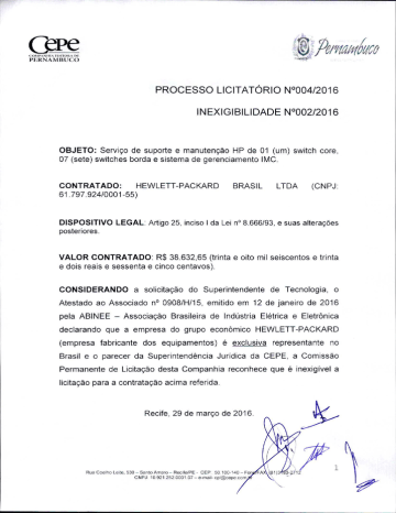 CePe t IIMI'.\NHI,\ HH10Il.\ In, PERNAMlIUCO PROCESSO L1CITATÓRIO N°004/2016 INEXIGIBILIDADE N°002/2016 OBJETO: Serviço de suporte e manutenção HP de 01 (um) switch core, 07 (sete) switches borda e sistema de gerenciamento IMC. CONTRATADO: HEWLETT-PACKARD 61 .797.924/0001-55) BRASIL LTDA (CNPJ: DISPOSITIVO LEGAL: Artigo 25, inciso I da Lei nO8.666/93, e suas alterações posteriores. VALOR CONTRATADO: R$ 38.632,65 (trinta e oito mil seiscentos e trinta e dois reais e sessenta e cinco centavos). CONSIDERANDO a solicitação do Superintendente de Tecnologia, o Atestado ao Associado nO0908/H/15, emitido em 12 de janeiro de 2016 pela ABINEE - Associação Brasileira de Indústria Elétrica e Eletrônica declarando que a empresa do grupo econômico HEWLETT-PACKARD (empresa fabricante dos equipamentos) é exclusiva representante no Brasil e o parecer da Superintendência Jurídica da CEPE, a Comissão Permanente de Licitação desta Companhia reconhece que é inexigível a licitação para a contratação acima referida. Recife, 29 de março de 2016. Rua Coelho leite, 530 - Santo Amaro - ReClfe/PE. CEP., 50,100.140 - Fo CNPJ: 10.921.252.0001.07 - e-mail. [email protected] r Cepe (O~II'\Nllr.lo flllH)[t" nr PERNAMBUCO COMISSÃO PERMANENTE DE LICITAÇÃO - CPL <I ~ ~-q ssara Vila rim Pimentel 1M9<~, ? ~&iO ?f;;~Ot0 Patricia Peron de Moraes Membro Presidente da CPL 1!aAô~IIYODiniz de Lima ~ Me br Membro Ratifico a Inexigibilidade do Processo Li itatário n0004/2016, nos termos do parecer da Comissão Permanente de Licitação. março de 2016. Luiz Ricard I e de Castro Leitão esidente da CEPE Rua Coelho LeIte, 530 - Santo Amaro - Recife/PE - CEP.: 50 100-140 - Fone/FAX: CNPJ. 10.921.252.0001,07 - [email protected] (81)3183-2712 2