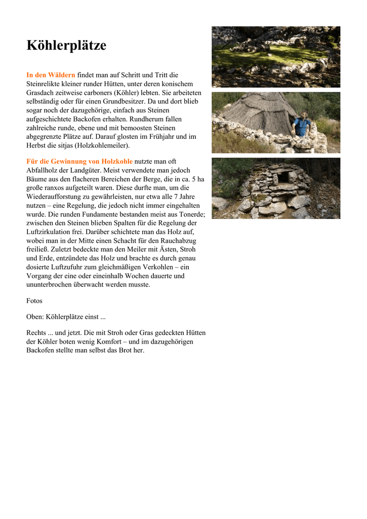 Köhlerplätze In den Wäldern findet man auf Schritt und Tritt die Steinrelikte kleiner runder Hütten, unter deren konischem Grasdach zeitweise carboners (Köhler) lebten. Sie arbeiteten selbständig oder für einen Grundbesitzer. Da und dort blieb sogar noch der dazugehörige, einfach aus Steinen aufgeschichtete Backofen erhalten. Rundherum fallen zahlreiche runde, ebene und mit bemoosten Steinen abgegrenzte Plätze auf. Darauf glosten im Frühjahr und im Herbst die sitjas (Holzkohlemeiler). Für die Gewinnung von Holzkohle nutzte man oft Abfallholz der Landgüter. Meist verwendete man jedoch Bäume aus den flacheren Bereichen der Berge, die in ca. 5 ha große ranxos aufgeteilt waren. Diese durfte man, um die Wiederaufforstung zu gewährleisten, nur etwa alle 7 Jahre nutzen – eine Regelung, die jedoch nicht immer eingehalten wurde. Die runden Fundamente bestanden meist aus Tonerde; zwischen den Steinen blieben Spalten für die Regelung der Luftzirkulation frei. Darüber schichtete man das Holz auf, wobei man in der Mitte einen Schacht für den Rauchabzug freiließ. Zuletzt bedeckte man den Meiler mit Ästen, Stroh und Erde, entzündete das Holz und brachte es durch genau dosierte Luftzufuhr zum gleichmäßigen Verkohlen – ein Vorgang der eine oder eineinhalb Wochen dauerte und ununterbrochen überwacht werden musste. Fotos Oben: Köhlerplätze einst ... Rechts ... und jetzt. Die mit Stroh oder Gras gedeckten Hütten der Köhler boten wenig Komfort – und im dazugehörigen Backofen stellte man selbst das Brot her.