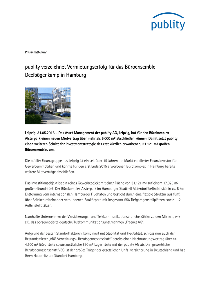 Pressemitteilung publity verzeichnet Vermietungserfolg für das Büroensemble Deelbögenkamp in Hamburg Leipzig, 31.05.2016 – Das Asset Management der publity AG, Leipzig, hat für den Bürokomplex Alsterpark einen neuen Mietvertrag über mehr als 5.000 m² abschließen können. Damit setzt publity einen weiteren Schritt der Investmentstrategie des erst kürzlich erworbenen, 31.121 m² großen Büroensembles um. Die publity Finanzgruppe aus Leipzig ist ein seit über 15 Jahren am Markt etablierter Finanzinvestor für Gewerbeimmobilien und konnte für den erst Ende 2015 erworbenen Bürokomplex in Hamburg bereits weitere Mietverträge abschließen. Das Investitionsobjekt ist ein reines Gewerbeobjekt mit einer Fläche von 31.121 m² auf einem 17.025 m² großen Grundstück. Der Bürokomplex Alsterpark im Hamburger Stadtteil Alsterdorf befindet sich in ca. 5 km Entfernung vom internationalen Hamburger Flughafen und besticht durch eine flexible Struktur aus fünf, über Brücken miteinander verbundenen Baukörpern mit insgesamt 556 Tiefgaragenstellplätzen sowie 112 Außenstellplätzen. Namhafte Unternehmen der Versicherungs- und Telekommunikationsbranche zählen zu den Mietern, wie z.B. das börsennotierte deutsche Telekommunikationsunternehmen „Freenet AG“. Aufgrund der besten Standortfaktoren, kombiniert mit Stabilität und Flexibilität, schloss nun auch der Bestandsmieter „VBG Verwaltungs- Berufsgenossenschaft“ bereits einen Nachnutzungsvertrag über ca. 4.500 m² Bürofläche sowie zusätzliche 830 m² Lagerfläche mit der publity AG ab. Die gewerbliche Berufsgenossenschaft VBG ist der größte Träger der gesetzlichen Unfallversicherung in Deutschland und hat Ihren Hauptsitz am Standort Hamburg. „Der fünfteilige Bürokomplex besticht mit einer beeindruckenden Architektur und hoher Flexibilität. Dieser Vermietungserfolg inklusive dem attraktiven Mietermix stellt die positiven Renditemöglichkeiten unserer erworbenen Objekte unter Beweis“, so Thomas Olek, Vorstandsvorsitzender der publity AG. Pressekontakt: Finanzpresse und Investor Relations: edicto GmbH Axel Mühlhaus/ Peggy Kropmanns Telefon: +49 69 905505-52 E-Mail: [email protected] Über publity Die publity AG ist ein auf Büroimmobilien in Deutschland spezialisierter Asset Manager. Das Unternehmen deckt eine breite Wertschöpfungskette vom Ankauf über die Entwicklung bis zur Veräußerung der Immobilien ab und verfügt über einen Track Record von mehreren Hundert erfolgreichen Transaktionen. publity zeichnet sich dabei durch ein tragfähiges Netzwerk in der Immobilienbranche sowie bei den Work Out Abteilungen von Finanzinstituten aus, verfügt über sehr guten Zugang zu Investitionsmitteln und wickelt Transaktionen mit einem hocheffizienten Prozess mit bewährten Partnern zügig ab. Fallweise beteiligt sich publity als Co-Investor in begrenztem Umfang an Joint Venture Transaktionen. Die Aktien der publity AG (ISIN DE0006972508) werden im Entry Standard der Frankfurter Wertpapierbörse gehandelt. Pressekontakt: publity AG Landsteinerstraße 6, 04103 Leipzig, Deutschland Telefon: +49 341 261787-41, Telefax: +49 341 261787-31 E-Mail: [email protected], Internet: www.publity.de Über publity Die publity AG ist ein auf Büroimmobilien in Deutschland spezialisierter Asset Manager. Das Unternehmen deckt eine breite Wertschöpfungskette vom Ankauf über die Entwicklung bis zur Veräußerung der Immobilien ab und verfügt über einen Track Record von mehreren Hundert erfolgreichen Transaktionen. publity zeichnet sich dabei durch ein tragfähiges Netzwerk in der Immobilienbranche sowie bei den Work Out Abteilungen von Finanzinstituten aus, verfügt über sehr guten Zugang zu Investitionsmitteln und wickelt Transaktionen mit einem hocheffizienten Prozess mit bewährten Partnern zügig ab. Fallweise beteiligt sich publity als Co-Investor in begrenztem Umfang an Joint Venture Transaktionen. Die Aktien der publity AG (ISIN DE0006972508) werden im Entry Standard der Frankfurter Wertpapierbörse gehandelt.
