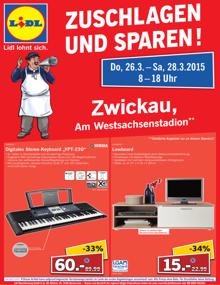 N E G A L H C S U Z ! N E R A P S D N U Do, 26.3. – Sa, 28.3.2015 8 – 18 Uhr Zwickau, n o i d a t s n e s h c a s t s e W Am ** **Sämtliche Angebote nur an diesem Standort ! YAMAHA LIVARNO® Digitales Stereo-Keyboard „YPT-230“ Lowboard • 61 Tasten in Standardgröße und 32-stimmige Polyphonie • Insgesamt 385 hochwertige Instrumenten-Voices und 100 Begleitrhythmen inklusive des weltbekannten Konzertflügelklangs von Yamaha • Mit Lernprogramm „Yamaha Education Suite 5“ und 102 integrierten, leicht erlernbaren Songs • Besonders hohe Kratzfestigkeit durch Melaminharzbeschichtung • Frontklappe mit stabilem Metallbeschlag • Gerätefach mit mehrfach höhenverstellbarem Einlegeboden • Maße: ca. B 117 x H 33 x T 39 cm (Inkl. Netzadapter) Korpus in hochwertiger Sonoma-Eiche-Nachbildung Mit LC-Display -33% 60.- * 89.99 -34% L3088356 (ohne Deko) 15.- * 22.99 Dieser Artikel kann aufgrund begrenzter Vorratsmenge bereits im Laufe des ersten Angebotstages ausverkauft sein. Alle Preise ohne Deko. Für Druckfehler keine Haftung. * Lidl Dienstleistung GmbH & Co. KG, Rötelstr. 30, 74166 Neckarsulm • Namen und Anschrift der regional tätigen Unternehmen finden Sie unter www.lidl.de/filialsuche oder 0800 4353361. HHZ-GER 13/2015 N E G A L H C ZUS ! N E R A UND SP Do, 26.3. – Sa, 28.3.2015 8 – 18 Uhr LIVARNO LUX® LED-Unterbauspots SILVERCREST® Epilierer „SED 3.7 C2“ Benutzerfreundlich Schadstoffgeprüft Praxisgetestet Dauergetestet • Schnelles und gründliches Ergebnis durch 18 Pinzettenpaare aus rostfreiem Edelstahl für lang anhaltend glatte Haut • Wahlweise Akku- oder Netzbetrieb – hochwertiger Li-Ionen-Akku • Betriebszeit: ca. 40 Min. (bei Vollladung), Ladezeit: ca. 80 Min. • Netzadapter mit automatischer Spannungsanpassung (100–240 V) • Verschiedene Farben Adapter • Für farbige Lichtakzente in Regalen oder Vitrinen • 4 Spots mit je 9 RGB-LEDs • Mit praktischem Schnurschalter • Ideal zur Unterbaumontage OWIM GmbH & Co. KG LED Z31357 Diese Leuchte enthält eingebaute LEDLampen. -49% je 9.- * 17.99 A++ A+ A B C D E -33% L E D 10.- * Die Lampen können in der Leuchte nicht ausgetauscht werden. 874/2012 14.99 SILVERCREST® (Abb. ähnlich) Benutzerfreundlich Schadstoffgeprüft Praxisgetestet Dauergetestet SILVERCREST® Teekocher „STK 650 A1“ • Kabellose, abnehmbare Kanne aus hitzebeständigem Markenglas • Auto-Stopp und anschließende Warmhaltefunktion Mit großem Teesieb für eine optimale Entfaltung des Aromas • Für bis zu 8 Std. Musikwiedergabe • Leistungsstarker Li-Ion-Akku (3,7 V/750 mAh) • Inklusive Mini-USB-Adapter (USB/3,5-mm-Klinke) • Reichweite: bis zu 10 m; Maße: ca. Ø 6 x H 5 cm • Verschiedene Farben Mit Freisprechfunktion Höchster Genuss durch Steigrohr-Brühverfahren; für bis zu 8 Tassen 1 max. Bluetooth®-Mini-Lautsprecher „SBL 3.0 A1“ -46% -46% 650 W 8.- * je 14.99 (Abb. ähnlich) 8.- * 14.99 ULTIMATE SPEED® Klima-Sitzauflage Inklusive 4 Adapter – z.B. für Bälle, Luftmatratzen, Fahrrad- oder Autoreifen Betrieb über 12-V-Anschluss (Zigarettenanzünder) -46% ULTIMATE SPEED® Mini-Kompressor "UMK 10 A1" • Betriebsdruck: bis max. 150 PSI/10 bar • Integriertes Manometer • Kabellänge: ca. 3 m HHZ-GER 13/2015 8.- * 14.99 • Mit Belüftung im Sitz- und Rückenbereich • 2 Gebläsestufen – einstellbar über Bedienfeld Universal geeignet für Auto, Stuhl, Sessel u.v.m. Netzadapter ID 1000000000 -46% 8.- * 14.99 *Dieser Artikel kann aufgrund begrenzter Vorratsmenge bereits im Laufe des ersten Angebotstages ausverkauft sein. Alle Preise ohne Deko. Für Druckfehler keine Haftung.