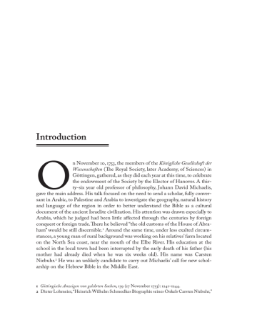 Introduction O n November 10, 1753, the members of the Königliche Gesellschaft der Wissenschaften (The Royal Society, later Academy, of Sciences) in Göttingen, gathered, as they did each year at this time, to celebrate the endowment of the Society by the Elector of Hanover. A thirty-six year old professor of philosophy, Johann David Michaelis, gave the main address. His talk focused on the need to send a scholar, fully conversant in Arabic, to Palestine and Arabia to investigate the geography, natural history and language of the region in order to better understand the Bible as a cultural document of the ancient Israelite civilization. His attention was drawn especially to Arabia, which he judged had been little affected through the centuries by foreign conquest or foreign trade. There he believed “the old customs of the House of Abraham” would be still discernible.1 Around the same time, under less exalted circumstances, a young man of rural background was working on his relatives’ farm located on the North Sea coast, near the mouth of the Elbe River. His education at the school in the local town had been interrupted by the early death of his father (his mother had already died when he was six weeks old). His name was Carsten Niebuhr.2 He was an unlikely candidate to carry out Michaelis’ call for new scholarship on the Hebrew Bible in the Middle East. 1 Göttingische Anzeigen von gelehrten Sachen, 139 (17 November 1753): 1241–1244. 2 Dieter Lohmeier, “Heinrich Wilhelm Schmeelkes Biographie seines Onkels Carsten Niebuhr,” 16 introduction How the professor of philosophy and the farm boy came together with the help of the King of Denmark-Norway to produce one of the great journeys of exploration and investigation in the Eighteenth Century is the subject of this study. The study has two themes. One is the idea of an expedition; not only what the idea represented, but also how it evolved and was transformed by the influences of others and by the difficult realities of an expedition. The other is the life story of the young man and the expedition – an account of exploration, adventure, tragedy, courage and, above all else, curiosity. Both played out in the changing environment of the Northern European Enlightenment and the stimulating setting of the Middle East. The journey that resulted from the intertwining of these two themes within the milieu of 18th Century Europe and the lands of the Arab world was the Royal Danish Expedition to Arabia, or in Denmark usually, Den Arabiske Rejse, The Arabian Journey. Funded by the King of Denmark-Norway, Frederik V (1723–1766), the expedition brought together a team of six men – a philologist, a botanist/zoologist, a cartographer/astronomer, a physician, a professional illustrator and an orderly. It was a truly Northern European group – two Danes, two Germans and two Swedes. The party left Copenhagen in January 1761, and in that year traveled by ship to Istanbul and Alexandria. They then visited Cairo and the Sinai Peninsula before traversing the Red Sea via Jiddah to Yemen, which was the group’s main destination. After investigating Yemen the journey took the expedition across the Arabian Sea to Bombay before entering the Persian Gulf and visiting Shīrāz, Persepolis, al Başrah (Basra), Baghdād, al Mawşil (Mosul), Halab (Aleppo), Damascus, Jerusalem and Cyprus. Thus, the expedition circumnavigated the Arabian Peninsula, and touched upon a number of neighboring territories, and India, along the way. The return trip overland crossed Anatolia to Istanbul, and then home by way of Bucharest and Warsaw to Copenhagen, returning in November of 1767. The expedition lasted almost seven years, and of the original six participants, only one, Carsten Niebuhr, survived through the fourth year. For the remaining years he continued the work of the expedition as a solitary explorer. As an historical event, the expedition stands out for a number of reasons. At the human level it is simply an incredible tale of personal courage and unrelenting intellectual curiosity. As an endeavor in exploration, it was the only major scientific expedition to emanate from Scandinavia and Germany in the entire 18th Century, and it was primarily land-based, less common in an era noted for seaborne exploration, principally in the Pacific. Institutionally it was unique because its purpose, methodologies and organization were shaped by the universities of Northern Europe, namely Göttingen, Copenhagen and Uppsala. It operated solely as a scholarly endeavor. It was always called “die gelehrte Gesellschaft,” “the scholarly party or association”. It was not part of a military unit or some other government agency; and Jahrbuch der Männer vom Morgenstern 88 (2009): 193–194. Also see Barthold Georg Niebuhr, Carsten Niebuhrs Leben, in his Kleine Schriften (Bonn, 1828), 5–7. introduction 17 The Route of the Royal Danish Expedition to Arabia 1761–1767* despite many difficulties, the expedition produced an abundance of valuable scientific results that were applauded in the 18th Century, and are still impressive today. Its cultural and geographic descriptions of Arabia and parts of the Ottoman Empire with their emphasis on people and religions, were the most comprehensive, accurate and unbiased available in that era. Its maps constituted the most important contribution to the cartography of the region produced in the 18th Century. It greatly advanced the science of navigational astronomy, particularly its use in hydrography and cartography, and the determination of longitude. Its work in the natural sciences – botany and zoology (especially marine biology) – led to important scientific discoveries pioneering for the times, that are still valued today in those fields. Finally, its meticulous examination of various antiquities introduced new scholarly standards to that kind of work and contributed to the understanding of several ancient languages.3 * From, 