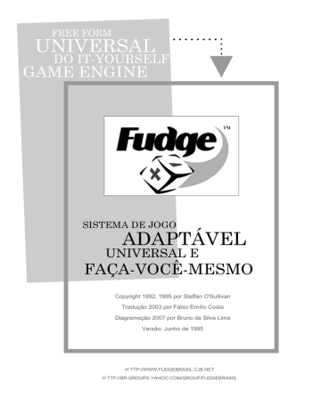 FREE FORM UNIVERSAL DO IT-YOURSELF GAME ENGINE SISTEMA DE JOGO ADAPTÁVEL UNIVERSAL E FAÇA-VOCÊ-MESMO Copyright 1992, 1995 por Steffan O'Sullivan Tradução 2003 por Fábio Emílio Costa Diagramação 2007 por Bruno da Silva Lima Versão: Junho de 1995 H TTP://WWW.FUDGEBRASIL.CJB.NET H TTP://BR.GROUPS.YAHOO.COM/GROUP/FUDGEBRASIIL Versão 1.0, Agosto de 2007 “Bobagens da Contra Capa” e Introdução FUDGE Fudge: Freeform Universal Do-it-yourself Gaming Engine. Sistema de Jogo Adaptável, Universal e Faça-Você-Mesmo. O Fudge é um RPG único. As regras básicas são para Mestres de Jogo (Game Masters, GM) experientes, mas os jogadores podem ser desde novatos completos até os mais experientes. Fudge funciona com qualquer gênero e personagens exemplo para muitos gêneros estão incluídos. O Fudge possui muitos aspectos interessantes, incluindo muitos novos conceitos em RPG: ♦ Não há atributos fixos. O Mestre escolhe atributos apropriados dependendo do seu gosto pessoal e do gênero que se irá jogar. Muitos exemplos de atributos são incluídos. ♦ O Fudge é um Sistema voltado à perícias. Perícias também podem ser definidas pelo Mestre, indo desde perícias altamente especializadas até mesmo a grupos muito grandes de perícias. A escolha é sua, inclusive podendo mesclar estilos, conforme a sua necessidade. ♦ Os Níveis de Atributos e de Perícias são baseadas em palavras, tornando fácil determinar o quão bom qualquer personagem em especial é em qualquer coisa. Você nunca irá ouvir seus jogadores dizendo "Meu Guerreiro é de Nível (tem Perícia) 14", mas sim "Meu personagem é um Ótimo espadachim" ♦ Bênçãos e Falhas naturais podem ser criadas e descritas por cada jogador de formas tão breves ou tão longas quanto ele desejar. Muitos exemplos são fornecidos para que você possa entender. ♦ Devido ao sistema baseado em palavras, qualquer Universo de Campanha ou aventura desenvolvido para Fudge pode ser traduzido sem problemas para qualquer outro RPG — e vice-versa. Isso torna Fudge extremamente útil como um "tradutor universal" de sistemas de RPG. ♦ Um sistema de resolução de ações simples permite aos jogadores saber o quão bem eles foram em uma ação específica — em palavras. Regras para dados de seis faces, dados percentuais, e dados Fudge especiais são incluídas. O Fudge também pode ser jogado sem dados, se desejado. ♦ Você pode integrar regras de outros RPGs em Fudge. Se um RPG existente possui um mecanismo específico de jogo fantástico, mas de resto não funciona, você pode facilmente importar a parte boa do RPG para Fudge sem ter de converter o jogo todo. Você gosta do sistema de psiônicos do jogo X, do sistema de combate do jogo Y, e do sistema de sanidade do jogo Z? Use todos eles livremente em Fudge. ♦ Ao Mestre são dadas opções para utilizar Fudge tanto para uma campanha realista quanto para uma campanha "épica" (ou "lendária" ou "cinemática"). Qualquer gênero pode ser jogado em qualquer ponto entre o realismo e as lendas. ♦ As regras básicas podem ser copiadas e distribuídas livremente. Na verdade, qualquer distribuidor pode publicar as regras Fudge e adicionar seu ambiente e aventuras às mesmas — veja as Notas Legais para detalhes. ♦ Se você está pensando em desenvolver seu próprio RPG caseiro, a simples leitura de Fudge pode fornecer uma excelente introdução para o que você precisa entender como um desenvolvedor de jogos. O Fudge é especificamente para pessoas que querem uma boa base para construir seus próprios sistemas. Ele fornece as pedras fundamentais que você precisa para customizar suas próprias regras. Se você nunca encontrou um RPG comercial que supre suas necessidades corretamente, então Fudge pode ser o que você precisa. Se você criou um ótimo ambiente de jogo (ou adaptou um de livros ou filmes), mas nenhum outro sistema de RPG lhe faz justiça, talvez Fudge possa lhe ajudar. As regras básicas de Fudge não oferecem nenhuma informação sobre ambiente de campanha (exceto por exemplos). Lançamentos futuros da Grey Ghost Games (N.T.: Empresa norte-americana que detêm os "direitos comerciais" do Fudge) irão incluir mundos de campanha, suplementos com regras genéricas, e aventuras. Por causa da natureza flexível e universal de Fudge, eles poderão ser usados com qualquer sistema de RPG. Sumário i. Notas Legais ................................................................................. 4 3 Resolução de Ações ................................................................... 26 ii. Agradecimentos do Autor ............................................................. 5 3.1 Termos da Resolução de Ações ............................................. 26 iii. Sobre o Autor ................................................................................ 5 3.2 Rolando os Dados ................................................................... 27 iv. Agradecimentos do Tradutor ........................................................ 5 3.21 Lendo os Dados ................................................................. 27 v. Sobre o Tradutor ........................................................................... 5 3.22 Outras Técnicas com Dados .............................................. 28 vi. Agradecimentos do Diagramador ................................................. 5 3.23 Taxas de Sucesso .............................................................. 28 vii. Sobre o Diagramador .................................................................... 5 3.3 Modificadores de Ações .......................................................... 29 3.4 Ações Sem Oposição .............................................................. 29 1 Criação de Personagens .............................................................. 6 3.5 Ações Opostas ........................................................................ 30 1.1 Termos da Criação de Personagens