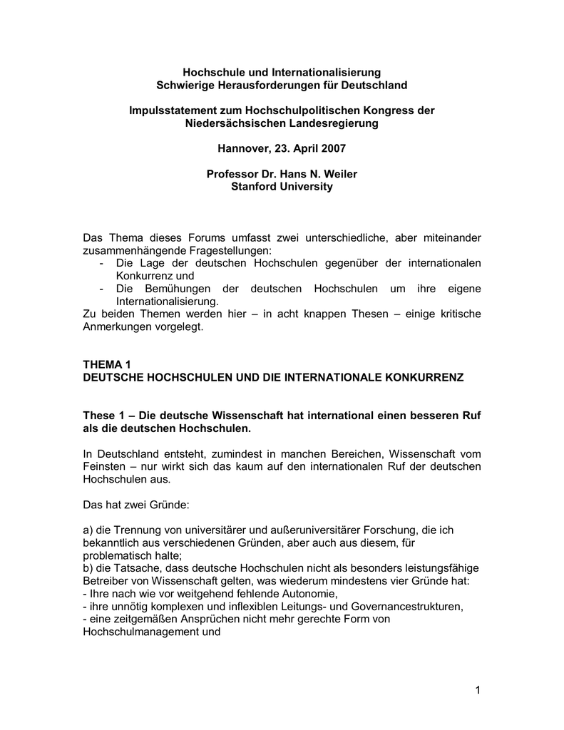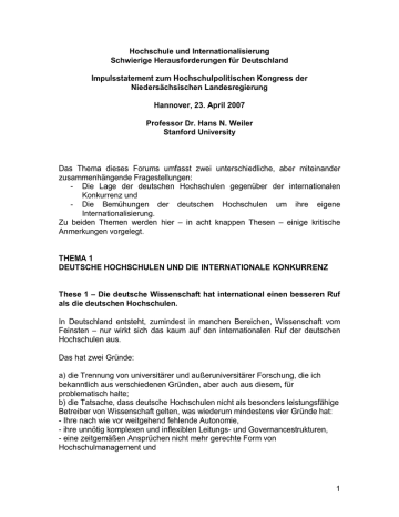 Hochschule und Internationalisierung Schwierige Herausforderungen für Deutschland Impulsstatement zum Hochschulpolitischen Kongress der Niedersächsischen Landesregierung Hannover, 23. April 2007 Professor Dr. Hans N. Weiler Stanford University Das Thema dieses Forums umfasst zwei unterschiedliche, aber miteinander zusammenhängende Fragestellungen: - Die Lage der deutschen Hochschulen gegenüber der internationalen Konkurrenz und - Die Bemühungen der deutschen Hochschulen um ihre eigene Internationalisierung. Zu beiden Themen werden hier – in acht knappen Thesen – einige kritische Anmerkungen vorgelegt. THEMA 1 DEUTSCHE HOCHSCHULEN UND DIE INTERNATIONALE KONKURRENZ These 1 – Die deutsche Wissenschaft hat international einen besseren Ruf als die deutschen Hochschulen. In Deutschland entsteht, zumindest in manchen Bereichen, Wissenschaft vom Feinsten – nur wirkt sich das kaum auf den internationalen Ruf der deutschen Hochschulen aus. Das hat zwei Gründe: a) die Trennung von universitärer und außeruniversitärer Forschung, die ich bekanntlich aus verschiedenen Gründen, aber auch aus diesem, für problematisch halte; b) die Tatsache, dass deutsche Hochschulen nicht als besonders leistungsfähige Betreiber von Wissenschaft gelten, was wiederum mindestens vier Gründe hat: - Ihre nach wie vor weitgehend fehlende Autonomie, - ihre unnötig komplexen und inflexiblen Leitungs- und Governancestrukturen, - eine zeitgemäßen Ansprüchen nicht mehr gerechte Form von Hochschulmanagement und 1 - ein System der Forschungsfinanzierung, das jahrzehntelang gemeint hat, ohne Vollkostenfinanzierung auszukommen und den Hochschulen zugemutet hat, sich die indirekten, aber genau so realen Kosten von Forschungsvorhaben aus dem eigenen unterernährten Fleisch zu schneiden. Ein dritter Grund für die mangelnde internationale Konkurrenzfähigkeit der deutschen Hochschulen beginnt sich abzuzeichnen: die Föderalismusreform, die – was immer ihre sonstigen Verdienste sein mögen – für die internationale Wettbewerbsfähigkeit der deutschen Hochschulen ein beträchtliches Handicap zu werden verspricht. These 2 – Die internationale Konkurrenz ist längst schon aus den Startlöchern. Inzwischen sieht sich Deutschland einer Wettbewerbssituation gegenüber, wie sie knallharter nicht sein könnte. Einige Schlaglichter: a) Die ebenso nachhaltigen wie beträchtlichen Anstrengungen der skandinavischen Länder in der Bildungs- und Wissenschaftsfinanzierung beginnen, sich im europäischen Vergleich bemerkbar zu machen. Hier entsteht ein neues „Nord-Süd-Gefälle“. b) China hat inzwischen Japan überholt und ist jetzt Nr. 2 weltweit in den Ausgaben für Forschung und Entwicklung. c) Indien (das ich gerade besucht habe) hat inzwischen seine eigene „Exzellenzinitiative“ mit für indische Verhältnisse massiven finanziellen Anreizen für wissenschaftliche Exzellenz in Kernbereichen der Forschung. Die National Knowledge Commission fordert in ihrem soeben erschienenen ersten Bericht eine Ausweitung des Hochschulwesens von 350 auf 1500 Hochschulen und die Einrichtung von 50 „national universities“ (auf deutsch: Elitehochschulen), davon zehn in den nächsten fünf Jahren. Im Unterschied zu Deutschland fällt das Argument, dass internationale Wettbewerbsfähigkeit in fortgeschrittenen Technologien eine massive Ausweitung der Hochschulkapazitäten erfordert, in Indien auf überaus fruchtbaren Boden. d) In dem amerikanischen Magazin „Business Week“ kann man nachlesen, dass sich die USA ernsthaft Sorgen machen, dass ihnen China und Indien in der Ausbildung hochqualifizierter Wissenschaftler und Ingenieure den Rang ablaufen; der neue amerikanische Kongress behandelt zur Zeit ein Gesetz, das über die nächsten vier Jahre die zusätzliche Ausbildung von 100 000 Wissenschaftlern, Ingenieuren und Mathematikern möglich machen soll. 2 e) Stanford University hat vor einem halben Jahr eine Spendenkampagne angekündigt, um in den entscheidenden Wissensbereichen unserer Zeit international wettbewerbsfähig zu bleiben. Das Ziel: 4,2 Mrd. $, aber bei der Ankündigung der Kampagne wurde gleichzeitig mitgeteilt, dass die Hälfte, 2,1 Mrd. $, bereits eingegangen sei. These 3 – Deutschlands interner Aufholbedarf untergräbt die internationale Konkurrenzfähigkeit. Was hat Deutschland dem entgegen zu setzen? - eine Exzellenzinitiative, die über fünf Jahre gerade einmal den Forschungsetat einer einzigen amerikanischen Forschungsuniversität erreicht (und deren Weiterfinanzierung nach fünf Jahren überdies längst noch nicht gesichert ist), - einen „Hochschulpakt“ für die Schaffung demographie- und arbeitsmarktgerechter Ausbildungskapazitäten, von dem jetzt schon feststeht, dass er hoffnungslos unterfinanziert ist, und - einen ganz allmählichen Einstieg in die Vollkostenfinanzierung von Forschungsvorhaben, der mit 20 Prozent überaus bescheiden angesetzt ist (bei den amerikanischen Forschungsuniversitäten liegt der nachweisbar erforderliche Satz bei über 50 Prozent). Internationale Konkurrenzfähigkeit sieht anders aus. Mit anderen Worten: Deutschlands Hochschulwesen hat so viel internen Aufholund Reparaturbedarf nach Jahrzehnten der Unterfinanzierung, dass an eine nennenswerte Verbesserung der internationalen Konkurrenzfähigkeit zunächst nicht zu denken ist. THEMA 2 DEUTSCHE HOCHSCHULEN AUF DEM (SCHWIERIGEN) WEG ZUR INTERNATIONALITÄT These 4 – Zur Internationalisierung deutscher Hochschulen gehört mehr als eine Handvoll englischsprachiger Lehrveranstaltungen und ein Büro in Singapur. Wissen und Wissenschaft sind international. Das gilt für Hochschulen aber längst noch nicht, denn diese sind – in allen Ländern – auf vielfältige Weise und aus historischen, kulturellen und rechtlichen Gründen fest in nationale Bezüge und Regelungen eingebunden und stehen damit ihrer eigenen Internationalisierung 3 oft genug im Wege. (Versuchen Sie einmal, an einer deutschen Universität einem polnischen Kolle