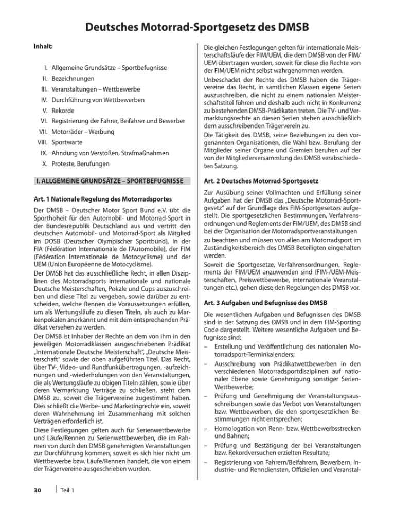 Deutsches Motorrad-Sportgesetz des DMSB Inhalt: I. Allgemeine Grundsätze – Sportbefugnisse II. Bezeichnungen III. Veranstaltungen – Wettbewerbe IV. Durchführung von Wettbewerben V. Rekorde VI. Registrierung der Fahrer, Beifahrer und Bewerber VII. Motorräder – Werbung VIII. Sportwarte IX. Ahndung von Verstößen, Strafmaßnahmen X. Proteste, Berufungen I. ALLGEMEINE GRUNDSÄTZE – SPORTBEFUGNISSE Art. 1 Nationale Regelung des Motorradsportes Der DMSB – Deutscher Motor Sport Bund e.V. übt die Sporthoheit für den Automobil- und Motorrad-Sport in der Bundesrepublik Deutschland aus und vertritt den deutschen Automobil- und Motorrad-Sport als Mitglied im DOSB (Deutscher Olympischer Sportbund), in der FIA (Fédération lnternationale de l’Automobile), der FIM (Fédération lnternationale de Motocyclisme) und der UEM (Union Européenne de Motocyclisme). Der DMSB hat das ausschließliche Recht, in allen Disziplinen des Motorradsports internationale und nationale Deutsche Meisterschaften, Pokale und Cups auszuschreiben und diese Titel zu vergeben, sowie darüber zu entscheiden, welche Rennen die Voraussetzungen erfüllen, um als Wertungsläufe zu diesen Titeln, als auch zu Markenpokalen anerkannt und mit dem entsprechenden Prädikat versehen zu werden. Der DMSB ist Inhaber der Rechte an dem von ihm in den jeweiligen Motorradklassen ausgeschriebenen Prädikat „Internationale Deutsche Meisterschaft“, „Deutsche Meisterschaft“ sowie der oben aufgeführten Titel. Das Recht, über TV-, Video- und Rundfunkübertragungen, -aufzeichnungen und -wiederholungen von den Veranstaltungen, die als Wertungsläufe zu obigen Titeln zählen, sowie über deren Vermarktung Verträge zu schließen, steht dem DMSB zu, soweit die Trägervereine zugestimmt haben. Dies schließt die Werbe- und Marketingrechte ein, soweit deren Wahrnehmung im Zusammenhang mit solchen Verträgen erforderlich ist. Diese Festlegungen gelten auch für Serienwettbewerbe und Läufe/Rennen zu Serienwettbewerben, die im Rahmen von durch den DMSB genehmigten Veranstaltungen zur Durchführung kommen, soweit es sich hier nicht um Wettbewerbe bzw. Läufe/Rennen handelt, die von einem der Trägervereine ausgeschrieben wurden. 30 Teil 1 Die gleichen Festlegungen gelten für internationale Meisterschaftsläufe der FIM/UEM, die dem DMSB von der FIM/ UEM übertragen wurden, soweit für diese die Rechte von der FIM/UEM nicht selbst wahrgenommen werden. Unbeschadet der Rechte des DMSB haben die Trägervereine das Recht, in sämtlichen Klassen eigene Serien auszuschreiben, die nicht zu einem nationalen Meisterschaftstitel führen und deshalb auch nicht in Konkurrenz zu bestehenden DMSB-Prädikaten treten. Die TV- und Vermarktungsrechte an diesen Serien stehen ausschließlich dem ausschreibenden Trägerverein zu. Die Tätigkeit des DMSB, seine Beziehungen zu den vorgenannten Organisationen, die Wahl bzw. Berufung der Mitglieder seiner Organe und Gremien beruhen auf der von der Mitgliederversammlung des DMSB verabschiedeten Satzung. Art. 2 Deutsches Motorrad-Sportgesetz Zur Ausübung seiner Vollmachten und Erfüllung seiner Aufgaben hat der DMSB das „Deutsche Motorrad-Sportgesetz“ auf der Grundlage des FIM-Sportgesetzes aufgestellt. Die sportgesetzlichen Bestimmungen, Verfahrensordnungen und Reglements der FIM/UEM, des DMSB sind bei der Organisation der Motorradsportveranstaltungen zu beachten und müssen von allen am Motorradsport im Zuständigkeitsbereich des DMSB Beteiligten eingehalten werden. Soweit die Sportgesetze, Verfahrensordnungen, Reglements der FIM/UEM anzuwenden sind (FIM-/UEM-Meisterschaften, Preiswettbewerbe, internationale Veranstaltungen etc.), gehen diese den Regelungen des DMSB vor. Art. 3 Aufgaben und Befugnisse des DMSB Die wesentlichen Aufgaben und Befugnissen des DMSB sind in der Satzung des DMSB und in dem FIM-Sporting Code dargestellt. Weitere wesentliche Aufgaben und Befugnisse sind: –Erstellung und Veröffentlichung des nationalen Motorradsport-Terminkalenders; –Ausschreibung von Prädikatwettbewerben in den verschiedenen Motorradsportdisziplinen auf nationaler Ebene sowie Genehmigung sonstiger SerienWettbewerbe; – Prüfung und Genehmigung der Veranstaltungsausschreibungen sowie das Verbot von Veranstaltungen bzw. Wettbewerben, die den sportgesetzlichen Bestimmungen nicht entsprechen; – Homologation von Renn- bzw. Wettbewerbsstrecken und Bahnen; –Prüfung und Bestätigung der bei Veranstaltungen bzw. Rekordversuchen erzielten Resultate; –Registrierung von Fahrern/Beifahrern, Bewerbern, lndustrie- und Renndiensten, Offiziellen und Veranstal- Motorrad-Sportgesetz tern sowie sonstigen am Motorradsport direkt oder indirekt beteiligten Personen, Firmen und Organisationen, ggf. verbunden mit der Ausgabe von Lizenzen und/oder Ausweisen an diesen Personenkreis; –Erteilung der Erlaubnis zur Beteiligung an FIM- und UEM-Prädikatwettbewerben sowie an Veranstaltungen im Ausland; –Regelung des Ausbildungswesens für Sportwarte; – Ausübung der nationalen Sportgerichtsbarkeit – Erhebung von Gebühren (gemäß Gebühren, Teil 1 Motorradhandbuch). Art. 4 Überwachungsrecht des DMSB Die Mitglieder des Präsidiums und des Exekutivkomitees des DMSB haben das Recht, alle Veranstaltungen, die nach dem Deutschen Motorrad-Sportgesetz organisiert sind, zu überwachen. Das gleiche Recht haben die Vorsitzenden eines DMSBAusschusses oder einer DMSB-Arbeitsgruppe in ihrem Fachbereich. Die verantwortlichen Sportwarte sind gehalten, etwaigen Hinweisen dieses Personenkreises nachzugehen und die notwendigen Maßnahmen zu treffen. Die so autorisierten Personen weisen sich durch einen Lichtbildausweis des DMSB aus. Bei entsprechender Legitimation sind sie berechtigt, unter Beachtung und Einhaltung bestehender Sicherheitsbestimmungen sämtliche Absperrungen zu passieren und ungehindert jeden Platz (Rennbüro, abgesperrte Bahn, Rennstrecke, Fahrerlager, Boxen, Zeitnehmerhaus, Parkplätze, Tribünen usw.) zu betreten. II. BE