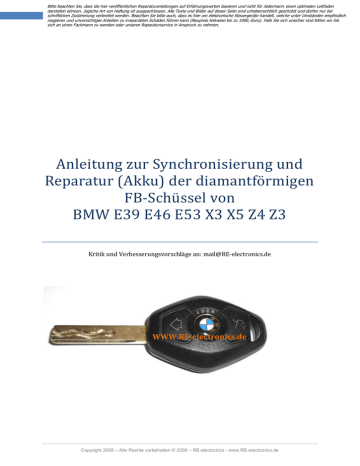 Bitte beachten Sie, dass die hier veröffentlichen Reparaturanleitungen auf Erfahrungswerten basieren und nicht für Jedermann einen optimalen Leitfaden darstellen können. Jegliche Art von Haftung ist ausgeschlossen. Alle Texte und Bilder auf dieser Seite sind urheberrechtlich geschützt und dürfen nur bei schriftlichen Zustimmung verbreitet werden. Beachten Sie bitte auch, dass es hier um elektronische Steuergeräte handelt, welche unter Umständen empfindlich reagieren und unvorsichtiges Arbeiten zu irreparablen Schäden führen kann (Neupreis teilweise bis zu 1000,-Euro). Falls Sie sich unsicher sind bitten wir Sie sich an einen Fachmann zu wenden oder unseren Reparaturservice in Anspruch zu nehmen. Anleitung zur Synchronisierung und Reparatur (Akku) der diamantförmigen FB-Schüssel von BMW E39 E46 E53 X3 X5 Z4 Z3 Kritik und Verbesserungsvorschläge an: [email protected] WWW.RE-electronics.de Copyright 2008 – Alle Rechte vorbehalten © 2008 – RE-electronics - www.RE-electronics.de Bitte beachten Sie, dass die hier veröffentlichen Reparaturanleitungen auf Erfahrungswerten basieren und nicht für Jedermann einen optimalen Leitfaden darstellen können. Jegliche Art von Haftung ist ausgeschlossen. Alle Texte und Bilder auf dieser Seite sind urheberrechtlich geschützt und dürfen nur bei schriftlichen Zustimmung verbreitet werden. Beachten Sie bitte auch, dass es hier um elektronische Steuergeräte handelt, welche unter Umständen empfindlich reagieren und unvorsichtiges Arbeiten zu irreparablen Schäden führen kann (Neupreis teilweise bis zu 1000,-Euro). Falls Sie sich unsicher sind bitten wir Sie sich an einen Fachmann zu wenden oder unseren Reparaturservice in Anspruch zu nehmen. Probleme mit der Fernbedienung Falls Sie die Zentralverriegelung über die Taste auf der Mittelkonsole aktivieren können, jedoch nicht über die Fernbedienung (Originalschlüssel), liegt sehr wahrscheinlich eine der folgenden 4 Fehlermöglichkeiten vor: - Akku im Schlüssel leer - Schlüssel defekt - Empfängermodul fehlerhaft/defekt - Schlüsselcodierung fehlerhaft Sehr häufig wird der erstgenannte beobachtet. Inhalt: 1. Akku ersetzen 2. Schlüssel synchronisieren Copyright 2008 – Alle Rechte vorbehalten © 2008 – RE-electronics - www.RE-electronics.de Bitte beachten Sie, dass die hier veröffentlichen Reparaturanleitungen auf Erfahrungswerten basieren und nicht für Jedermann einen optimalen Leitfaden darstellen können. Jegliche Art von Haftung ist ausgeschlossen. Alle Texte und Bilder auf dieser Seite sind urheberrechtlich geschützt und dürfen nur bei schriftlichen Zustimmung verbreitet werden. Beachten Sie bitte auch, dass es hier um elektronische Steuergeräte handelt, welche unter Umständen empfindlich reagieren und unvorsichtiges Arbeiten zu irreparablen Schäden führen kann (Neupreis teilweise bis zu 1000,-Euro). Falls Sie sich unsicher sind bitten wir Sie sich an einen Fachmann zu wenden oder unseren Reparaturservice in Anspruch zu nehmen. 1. Akku ersetzen Ein Akkuwechsel ist meistens dann notwendig, wenn der Schlüssel lange nicht im Gebrauch war (z.B. Zweitschlüssel) und der Akku durch die Tiefentladung beschädigt wurde. Teilweise fallen auch intensiv gebrauchte Schlüssel aus durch z.B. Oxidation oder Bruch der Kontakte am Akku. Für die Reparatur benötigen Sie einen Akku von Panasonic mit der Bezeichnung VL2020 1HF, ein scharfes Messer (z.B. Teppichmesser) sowie einen Sekundenkleber. Gehen Sie folgendermaßen vor: Den Schlüssel vorsichtig der Spritzkante entlang aufschneiden - Verwenden Sie ein dünnes und scharfes Messer - Führen Sie die Klinge nicht zu weit in das Gehäuse hinein, da sonst SMD-Bauteile beschädigt werden könnten - Arbeiten Sie langsam und präzise um eine saubere Schnittkante zu gewährleisten Elektronik herausnehmen, den Akku etwas nach oben ziehen und herauslöten Jetzt muss ein Pin am neuen Akku VL2020 1HF versetzt werden, da die Anordnung dieser nicht ganz passt Dazu den oberen Kontakt des alten Akku abzwicken und an den neuen so anlöten, dass die Pinposition ungefähr der des alten entspricht. Löten Sie nicht direkt am Akku selbst, sondern an dem angeschweißten Kontakt! Ggf. diesen mir einer Messerspitze vom Akku etwas anheben. Alternativ können Sie auch einfach einen dünnen Draht vom Kontakt zur Lötstelle an der Platine verlegen. Copyright 2008 – Alle Rechte vorbehalten © 2008 – RE-electronics - www.RE-electronics.de Bitte beachten Sie, dass die hier veröffentlichen Reparaturanleitungen auf Erfahrungswerten basieren und nicht für Jedermann einen optimalen Leitfaden darstellen können. Jegliche Art von Haftung ist ausgeschlossen. Alle Texte und Bilder auf dieser Seite sind urheberrechtlich geschützt und dürfen nur bei schriftlichen Zustimmung verbreitet werden. Beachten Sie bitte auch, dass es hier um elektronische Steuergeräte handelt, welche unter Umständen empfindlich reagieren und unvorsichtiges Arbeiten zu irreparablen Schäden führen kann (Neupreis teilweise bis zu 1000,-Euro). Falls Sie sich unsicher sind bitten wir Sie sich an einen Fachmann zu wenden oder unseren Reparaturservice in Anspruch zu nehmen. Nach dem Löten ggf. Lötstellen und Schalter durchmessen Schlüssel zusammenkleben und neu synchronisieren 2. Synchronisierung/Anlernen Um den Schlüssel mit der ZV neu zu synchronisieren, gehen Sie folgendermaßen vor: Einsteigen und Türen schließen Zündung einschalten (ca. 2-3s) Zündung ausschalten Schlüssel herausnehmen Schlüssel in die Hand nehmen und die "Öffnen"-Taste drücken und gedrückt halten, dann 3x "Schließen"-Taste drücken (3x fest drücken und jeweils ca. 1 Sekunde halten) "Öffnen" loslassen damit ist Ihr Schlüssel mit der ZV wieder synchronisiert. Copyright 2008 – Alle Rechte vorbehalten © 2008 – RE-electronics - www.RE-electronics.de