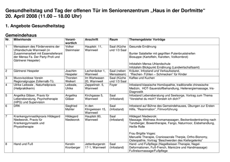 Gesundheitstag und Tag der offenen Tür im Seniorenzentrum „Haus in der Dorfmitte“ 20. April 2008 (11.00 – 18.00 Uhr) 1. Angebote Gesundheitstag Gemeindehaus Nr. Mitwirkende 1 Mensateam des Fördervereins der Uhlandschule Wannweil (in Zusammenarbeit mit Essenslieferant der Mensa Fa. Der Party-Profi und Gärtnerei Hespeler) 2 Gärtnerei Hespeler 3 Mucoviszidose Verein Regionalgruppe Zollernalb-Tü. Ulrike Leibssle , Naturheilpraxis (Heilpraktikerin) 4 5 6 7 8 Angelika Gläser, Praxis für Lebensberatung, Psychotherapie (HPG) und Supervision DRK Krankengymnastikpraxis Hildegard Niedworok, Praxis für Krankengymnastik und Physiotherapie Hand und Fuß Verantwortlich Volker Steinmaier Anschrift Raum Hauptstr. 11, Wannweil Saal (Küche Gesunde Ernährung und 1/3 Saal Bunter Salatteller mit gegrillten Putenbruststreifen Biosuppe (Kartoffeln, Karotten, Vollkornbrot) Joachim Hespeler Thorsten Weikert Leibssle, Ulrike Lachenäcker 1, Wannweil Im Wartwasen 20, Wannweil Zeppelinstr. 5, Wannweil Angelika Gläser Kirchgasse 5, Wannweil Siegfried Mahler In den Klingwiesen 15, Wannweil Hauptstr.80, Wannweil Hildegard Niedworok Kerstin Kronberger Jettenburgerstr. 17-1, Wannweil Themengebiete/ Vorträge Infotafeln Mensa Uhlandschule Infotafeln Blickpunkt Ernährung (Landwirtschaftsamt) Saal (neben Kräuter, Infostand und Verkaufsstand, Mensateam) “Riechen- Fühlen – Schmecken” für Kinder Saal (Küche Kaffee und Kuchen und 1/3 Saal Foyer Infostand klassische Homöopathie, traditionelle chinesische Medizin, HOT-Sauerstoffbehandlung, Heilenergiemassage, IrisDiagnostik Saal Infostand Lebensberatung und Seelsorge, Vortrag zum Thema (Infostand) “Verstehst du mich? Versteh ich dich?” Saal (Infostand) Infostand auf Bühne des Gemeindehauses, Übungen zur Ersten Hilfe, “Reanimation”, Filmvorführung Saal (Infostand) Hildegart Niedworok: Massage, Wellness Aromamassagen, Beckenbodentraniing nach Tanzberger, Bowentherapie, Fango, Naturmoor, Eisbehandlung, Heiße Rolle Saal (Infostand) Frau Brigitte Voges: Manuelle Therapie, Craniosacrale Therpie, Ortho-Bionomy, Osteopathie, Vortrag “Beschwerden des Kiefergelenks” Hand -und Fußpflege (Nagelbeisser-Therapie, NagelDeformationen, Fuß-French, Manicüre und Handmassage) Fußrelaxmassage/Fußpflege 9 activitas - Praxis für Physiotherapie Alexander & Juliane Heidrich 10 Zahnarztpraxis 11 12 13 Auf der Steinge 3, Wannweil Saal (Infostand) Dr. Antje Faulhaber Bahnhofstr. 8 und Dr. Peter Franke RichardBurkhardt-Str. 2 Psychotherapeutische Heilpraktikerin Antje Marlies Charlottenstr. A. M. Gersbacher Gersbacher 10, Wannweil Saal (Infostand) Susanne Kalbfell, staatl. Gepr. Podologin Nusser & Schaal Alexander und Juliane Heidrich Susanne Kalbfell Frau Nusser, Herr Eissler Dorfstr. 26, Wannweil Hintere Grabenstr. 28 72070 Tübingen Günther Im Dorf 122, Lippmann 72770 RTBetzingen Reinhardt Hauptstr. 31, Lutz Wannweil Hans Hauke Grießstr. 22, Wannweil Achim Löffler Schloßstr. 30, Wannweil Beate Simon Bleichstr. 8 72127 Kusterdingen Dieter Baumgartenstr. Schmidt 18, Wannweil. 14 Günther Lippmann, Augenoptikermeister 15 Linden-Apotheke 16 Homöopathischer Verein 17 Allianz (Löffler GbR) 18 19 Förderverein Uhlandschule und Beate Simon (Mobyfit), Tanzleiterin, Rückenschulexpertin Schwäb. Albverein Wannweil 20 VHS Wannweil Silke Binder 21 Yogalehrerin Margret-Rose Mahler 22 Reitverein MargaretRose Mahler Nelli Thiess Saal (Infostand) Krankengymnastik/Physiotherapie, Manuelle Therapie, PNF, Skoliosetherapie nach Schroth, Manuelle Lymphdrainage, KG an Geräten, Migräne- und Tinnitusbehandlung, Galileo Vibrationstraining, Kiefergelenksbehandlungen, therapeutisches Klettern, McKenzie, Massage, Fango (Naturmoor), Eis etc. Mundgesundheit, Prophylaxe, Aufklärung (über Implantologie, Endodontologie, Zahnerhaltung, Zahnersatz, GKV-Leistungen, Parodontologie)) Infostand: Magnetopathie, Meditation, Logotherapie (Sinnzentrierte Psychotherapie) Vorträge im Ratssaal Aufklärung Thema "Mentale Erschöpfung" und "LogoTherapie" Medizinische Fußpflege, Diabetischer Fuß Saal (Infostand) Saal (Infostand) Blutdruckmessung, Fußdruckmessung, Venenmessung, Kompressionsstrumpf, Einlagen Saal (Infostand) Gesundheitsvorsorge, Computer-Sehtest Hörmobil auf dem Marktplatz Saal (Infostand) Saal (Infostand) Clubraum 3 Infostand über Diabetes, Blutzuckermessung, Verkauf von Blutzuckermessgeräten Infostand Vereinsebene Vereinszimmer und Marktplatz Saal (Infostand) Gustav-WernerStr. 27, Wannweil In den Saal Klingwiesen 15, (Infostand) Wannweil Gustav-Werner- Marktplatz Str. 5, Wannweil Gesetzliche Krankenversicherung, Betriebskrankenkasse, Allianz, Krankenzusatzversicherung Info über Mobyfit – Ganzheitliche Physiotherapie, Rückenschule Volkswandern, Volksfahrradfahren mit Außenstation, Wanderverpflegung, Herzcheck mit cardioscan Infostand über Kursangebot, Krankenkassenförderung, Anmeldung etc. Yoga Infostand “Therapeutisches Reiten” Rathaus Nr. Mitwirkende Praxen 23 Krankenpflegeverein 24 Diakoniestation Härten 25 Brillinger Orthopädie 26 Senio Reutlingen Fachhandel für Senioren 27 Pro Mobil 28 AOK – Die Gesundheitskasse Neckar-Alb KundenCenter Betzingen 29 Silvia Winter und Marianne Bauer 30 Sportverein 31 Schwäb. Albverein Wannweil 32 Volksbank Reutlingen, VerantAnschrift wortlich Dieter Rilling Marienstr. 19, Wannweil Raum Foyer Rathaus (Infostand) Weinbergstr. 27, Foyer 72127 Rathaus Kusterdingen (Infostand) HandwerkerKleiner Saal Park 25 72070 Tübingen Kanzleistr. 22 Kleiner Saal 72764 Reutlingen Marco Gerg Oberer Rathaus Haldenweg 5, Treppe Wannweil (Infostand) KundenSteinachstraße FoyerCenter 16, 72770 Rathaus Betzingen ReutlingenBetzingen Sylvia Winter Lindenstr. 11/1, AußenWannweil bereich Rathaus (vor Marianne Bauer Baumgartenstr. Einwohner16, Wannweil meldeamt) Sybille Weinbergweg AußenSchach 11, Wannweil bereich Rathaus (vor EMA): Dieter Baumgartenstr. Rathausplatz Schmidt 18, Wannweil. Jutta Gartenstr. 33, Marktplatz Gerweck 72764 RT Themeng