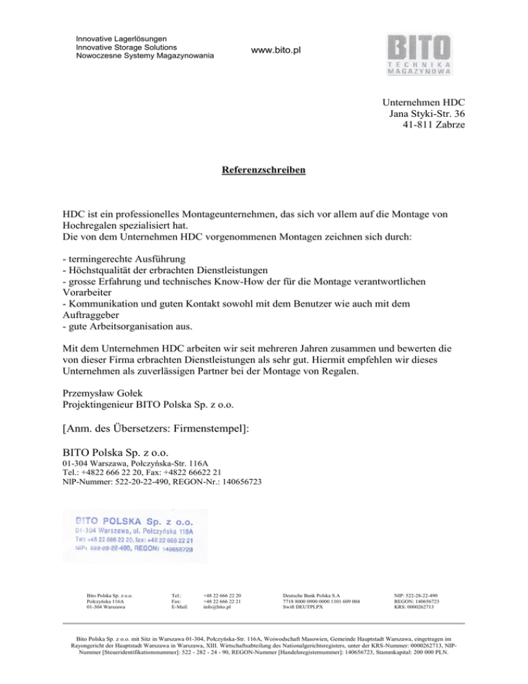 lnnovative Lagerlösungen lnnovative Storage Solutions Nowoczesne Systemy Magazynowania www.bito.pl Unternehmen HDC Jana Styki-Str. 36 41-811 Zabrze Referenzschreiben HDC ist ein professionelles Montageunternehmen, das sich vor allem auf die Montage von Hochregalen spezialisiert hat. Die von dem Unternehmen HDC vorgenommenen Montagen zeichnen sich durch: - termingerechte Ausführung - Höchstqualität der erbrachten Dienstleistungen - grosse Erfahrung und technisches Know-How der für die Montage verantwortlichen Vorarbeiter - Kommunikation und guten Kontakt sowohl mit dem Benutzer wie auch mit dem Auftraggeber - gute Arbeitsorganisation aus. Mit dem Unternehmen HDC arbeiten wir seit mehreren Jahren zusammen und bewerten die von dieser Firma erbrachten Dienstleistungen als sehr gut. Hiermit empfehlen wir dieses Unternehmen als zuverlässigen Partner bei der Montage von Regalen. Przemysław Gołek Projektingenieur BITO Polska Sp. z o.o. [Anm. des Übersetzers: Firmenstempel]: BITO Polska Sp. z o.o. 01-304 Warszawa, Połczyńska-Str. 116A Tel.: +4822 666 22 20, Fax: +4822 66622 21 NlP-Nummer: 522-20-22-490, REGON-Nr.: 140656723 Bito Polska Sp. z o.o. Połczyńska 116A 01-304 Warszawa Tel.: Fax: E-Mail: +48 22 666 22 20 +48 22 666 22 21 [email protected] Deutsche Bank Polska S.A 7718 8000 0900 0000 1101 609 004 Swift DEUTPLPX NIP: 522-28-22-490 REGON: 140656723 KRS: 0000262713 Bito Polska Sp. z o.o. mit Sitz in Warszawa 01-304, Połczyńska-Str. 116A, Woiwodschaft Masowien, Gemeinde Hauptstadt Warszawa, eingetragen im Rayongericht der Hauptstadt Warszawa in Warszawa, XIII. Wirtschaftsabteilung des Nationalgerichtsregisters, unter der KRS-Nummer: 0000262713, NIPNummer [Steueridentifikationsnummer]: 522 - 282 - 24 - 90, REGON-Nummer [Handelsregisternummer]: 140656723, Stammkapital: 200 000 PLN.