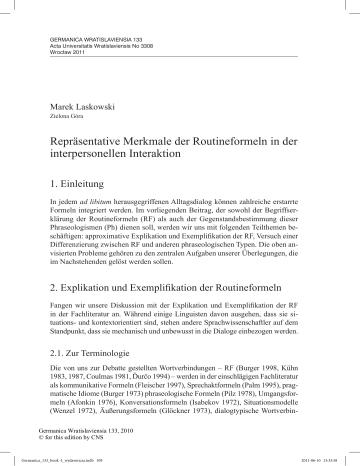 GERMANICA WRATISLAVIENSIA 133 Acta Universitatis Wratislaviensis No 3308 Wroc³aw 2011 Marek Laskowski Zielona Góra Repräsentative Merkmale der Routineformeln in der interpersonellen Interaktion 1. Einleitung In jedem ad libitum herausgegriffenen Alltagsdialog können zahlreiche erstarrte Formeln integriert werden. Im vorliegenden Beitrag, der sowohl der Begriffserklärung der Routineformeln (RF) als auch der Gegenstandsbestimmung dieser Phraseologismen (Ph) dienen soll, werden wir uns mit folgenden Teilthemen beschäftigen: approximative Explikation und Exemplifikation der RF, Versuch einer Differenzierung zwischen RF und anderen phraseologischen Typen. Die oben anvisierten Probleme gehören zu den zentralen Aufgaben unserer Überlegungen, die im Nachstehenden gelöst werden sollen. 2. Explikation und Exemplifikation der Routineformeln Fangen wir unsere Diskussion mit der Explikation und Exemplifikation der RF in der Fachliteratur an. Während einige Linguisten davon ausgehen, dass sie situations- und kontextorientiert sind, stehen andere Sprachwissenschaftler auf dem Standpunkt, dass sie mechanisch und unbewusst in die Dialoge einbezogen werden. 2.1. Zur Terminologie Die von uns zur Debatte gestellten Wortverbindungen – RF (Burger 1998, Kühn 1983, 1987, Coulmas 1981, Ďurčo 1994) – werden in der einschlägigen Fachliteratur als kommunikative Formeln (Fleischer 1997), Sprechaktformeln (Palm 1995), pragmatische Idiome (Burger 1973) phraseologische Formeln (Pilz 1978), Umgangsformeln (Afonkin 1976), Konversationsformeln (Isabekov 1972), Situationsmodelle (Wenzel 1972), Äußerungsformeln (Glöckner 1973), dialogtypische WortverbinGermanica Wratislaviensia 133, 2010 © for this edition by CNS Germanica_133_book -I_wydawnicza.indb 109 2011-06-10 13:33:58 110 Marek Laskowski dungen (Petschler, Zoch 1974), pragmatische Phraseologismen (Burger, Buhofer, Sialm 1982, Stein 1995, Laskowski 2003) genannt. Coulmas (1981), Lüger (1993), Laskowski (2003), Sosa Mayor (2006) bringen den Diskurs über die Routineformeln auf einen gemeinsamen Nenner, indem sie konstatieren, dass die automatisierten Ausdrücke zur Bewältigung kommunikativer Situationen dienen. Diese Supposition wird von Donalies (2009: 99) wie folgt begründet: „Sie haben sich aus der Routine unseres Umgangs miteinander entwickelt und sind im besten Sinne Produkte der unsichtbaren Hand. Wer Routineformeln gebraucht, hält sich an das Erprobte, Bewährte, an das Gewohnte“ (vgl. auch Wenzel 1978, Wunderlich 1977/1979). Nachdem die Benennungsprobleme der untersuchten Wortverbindungen kurz geschildert worden sind, besprechen wir deren Wesen und Klassifizierung. 2.2. Wesen und Typologie der Routineformeln Die RF sind in praxi feststehende Formeln (immer mit der Ruhe! Nun mach aber einen Punkt!) Abschiedsformeln (Auf Wiedersehen!), Bemerkungen (Der Ofen ist aus!), Ausrufe (Sei kein Frosch!), Dankesformeln (vielen Dank!), Fragen (Wie stehen die Aktien?), Fluchformeln (zum Donnerwetter noch mal!), Grußformeln (Hallo), Kommentare (Aha, daher weht der Wind!), Konversationsformeln (bitte mal herhören), Scheltformeln (zum Henker!), Stimulierungsformeln (Na, wird’s bald?), Tischformeln (Bedienen Sie sich bitte!), die uns die Sprache für bestimmte Situationen gebrauchsfertig zur Verfügung stellt (vgl. Wotjak / Richter 1997). In manchen Situationen brauchen wir nicht lange zu überlegen und finden schnell entsprechende Wendungen, die genau zu dem Kontext passen und diverse Intentionen zum Ausdruck bringen können, z.B. Anerkennung, Lob (Der war nicht von schlechten Eltern!), Ablehnung, Weigerung, Verneinung (Da lachen ja die Hühner!), Bestätigung, Ermunterung, Zustimmung (Hand aufs Herz! Na dann wollen wir mal!), Drohung, Forderung, Mahnung, Warnung (Wir sprechen uns noch!), Empörung (Das ist doch der Gipfel!), Erstaunen, Verwunderung (Da wird ja der Hund in der Pfanne verrückt!), kritischer Kommentar, Spott, Ironie, Zweifel (Das fängt ja gut an), Resignation (Dann gute Nacht!), Wichtigkeit (Da liegt der Hund begraben), Wünsche (Hals- und Beinruch!). Ermahnung zur Geduld (Abwarten und Tee trinken), Aufforderung zu vergessen (Schwamm drüber!). Im Nachstehenden gehen wir eingehender auf die Klassifikation der kommunikativen Formeln ein. 2.2.1. Syntaktisch-semantische und pragmatische Aspekte der Routineformeln Syntaktisch gesehen sind die untersuchten Wortverbindungen sehr heterogen (von einer Komponente [Abgemacht!], über zwei Komponenten [Gute Fahrt!] bis hin zu ganzen Sätzen [Das schlägt dem Fass den Boden aus!]). Deswegen ist es klar, dass die strukturelle Stabilität dieser Situationsmodelle im Großen und Ganzen minimal ist. Zum anderen sind sie jedoch sehr variabel. Nur wenige dialogtypische Wortverbindungen sind vollständig verfestigt oder auf wenige Varietäten Germanica Wratislaviensia 133, 2010 © for this edition by CNS Germanica_133_book -I_wydawnicza.indb 110 2011-06-10 13:33:58 Repräsentative Merkmale der Routineformeln 111 beschränkt (meiner Ansicht nach, nach meiner Ansicht, meiner Meinung nach, nach meiner Meinung, und so weiter, und so weiter und so fort). Die Mehrheit der Routineformeln weist im günstigen Falle einen festen Rahmen auf, der uns eine veränderbare lexikalische Auffüllung erlaubt, z.B. wie oben/früher/vorstehend/nachstehend/untern/an manchen Stellen erwähnt/angegeben, das will ich ganz deutlich/genau/klar/unmissverständlich sagen. Ihre Stabilität ist zum größten Teil dadurch zu bestimmen, dass sie den Sprechern als abrufbare Einheiten zur Bewältigung wiederkehrender kommunikativer Aufgaben, hauptsächlich in exponierten bzw. kritischen Phasen des zwischenmenschlichen sprachlichen Verkehrs gewählt werden können (Laskowski 2003: 123). Der pragmatische Aspekt der Routineformeln wurde unter anderen von Fleischer (1997: 126) in Betracht gezogen. Die Äußerungsformeln werden vorzugsweise „als textgliedernde oder kommunikationssteuernde Signale verwendet, nicht als Benennungseinheit
