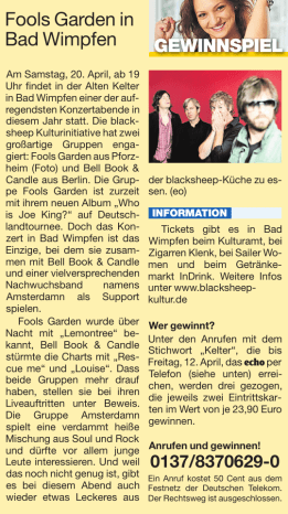 Fools Garden in Bad Wimpfen Am Samstag, 20. April, ab 19 Uhr findet in der Alten Kelter in Bad Wimpfen einer der aufregendsten Konzertabende in diesem Jahr statt. Die blacksheep Kulturinitiative hat zwei großartige Gruppen engagiert: Fools Garden aus Pforzheim (Foto) und Bell Book & Candle aus Berlin. Die Gruppe Fools Garden ist zurzeit mit ihrem neuen Album „Who is Joe King?“ auf Deutschlandtournee. Doch das Konzert in Bad Wimpfen ist das Einzige, bei dem sie zusammen mit Bell Book & Candle und einer vielversprechenden Nachwuchsband namens Amsterdamn als Support spielen. Fools Garden wurde über Nacht mit „Lemontree“ bekannt, Bell Book & Candle stürmte die Charts mit „Rescue me“ und „Louise“. Dass beide Gruppen mehr drauf haben, stellen sie bei ihren Liveauftritten unter Beweis. Die Gruppe Amsterdamn spielt eine verdammt heiße Mischung aus Soul und Rock und dürfte vor allem junge Leute interessieren. Und weil das noch nicht genug ist, gibt es bei diesem Abend auch wieder etwas Leckeres aus GEWINNSPIEL der blacksheep-Küche zu essen. (eo) INFORMATION Tickets gibt es in Bad Wimpfen beim Kulturamt, bei Zigarren Klenk, bei Sailer Women und beim Getränkemarkt InDrink. Weitere Infos unter www.blacksheepkultur.de Wer gewinnt? Unter den Anrufen mit dem Stichwort „Kelter“, die bis Freitag, 12. April, das echo per Telefon (siehe unten) erreichen, werden drei gezogen, die jeweils zwei Eintrittskarten im Wert von je 23,90 Euro gewinnen. Anrufen und gewinnen! 0137/8370629-0 Ein Anruf kostet 50 Cent aus dem Festnetz der Deutschen Telekom. Der Rechtsweg ist ausgeschlossen.