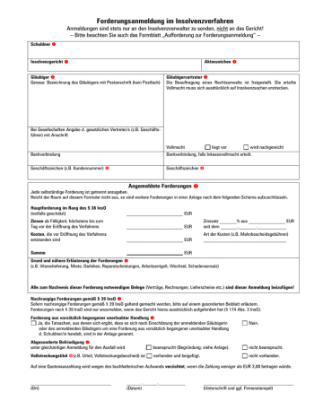 Forderungsanmeldung im Insolvenzverfahren Anmeldungen sind stets nur an den Insolvenzverwalter zu senden, nicht an das Gericht! – Bitte beachten Sie auch das Formblatt „Aufforderung zur Forderungsanmeldung“ – Schuldner Insolvenzgericht Aktenzeichen Gläubiger Genaue Bezeichnung des Gläubigers mit Postanschrift (kein Postfach) Gläubigervertreter Die Beauftragung eines Rechtsanwalts ist freigestellt. Die erteilte Vollmacht muss sich ausdrücklich auf Insolvenzsachen erstrecken. Bei Gesellschaften Angabe d. gesetzlichen Vertreter/s (z.B. Geschäftsführer) mit Anschrift Vollmacht liegt vor wird nachgereicht Bankverbindung Bankverbindung, falls Inkassovollmacht erteilt. Geschäftszeichen (z.B. Kundennummer) Geschäftszeichen Angemeldete Forderungen Jede selbständige Forderung ist getrennt anzugeben. Reicht der Raum auf diesem Formular nicht aus, so sind weitere Forderungen in einer Anlage nach dem folgenden Schema aufzuschlüsseln. Hauptforderung im Rang des § 38 InsO (notfalls geschätzt) _______________________ EUR Zinsen ab Fälligkeit, höchstens bis zum Tag vor der Eröffnung des Verfahrens _______________________ EUR Zinssatz _______% aus _______________ EUR seit dem _______._______.____________ Kosten, die vor Eröffnung des Verfahrens entstanden sind _______________________ EUR Art der Kosten (z.B. Mahnbescheidsgebühren) __________________________________ Summe _______________________ EUR Grund und nähere Erläuterung der Forderungen (z.B. Warenlieferung, Miete, Darlehen, Reparaturleistungen, Arbeitsentgelt, Wechsel, Schadensersatz) Alle zum Nachweis dieser Forderung notwendigen Belege (Verträge, Rechnungen, Lieferscheine etc.) sind dieser Anmeldung beizufügen! Nachrangige Forderungen gemäß § 39 InsO Sofern nachrangige Forderungen gemäß § 39 InsO geltend gemacht werden, bitte auf einem gesonderten Beiblatt erläutern. Forderungen nach § 39 InsO sind nur anzumelden, wenn das Gericht hierzu ausdrücklich aufgefordert hat (§ 174 Abs. 3 InsO). Forderung aus vorsätzlich begangener unerlaubter Handlung Ja, die Tatsachen, aus denen sich ergibt, dass es sich nach Einschätzung der anmeldenden Gläubigerin oder des anmeldenden Gläubigers um eine Forderung aus vorsätzlich begangener unerlaubter Handlung d. Schuldner/in handelt, sind in der Anlage genannt. Nein. Abgesonderte Befriedigung unter gleichzeitiger Anmeldung für den Ausfall wird beansprucht (Begründung: siehe Anlage). nicht beansprucht. Vollstreckungstitel (z.B. Urteil, Vollstreckungsbescheid) ist vorhanden und beigefügt. nicht vorhanden. Auf eine Quotenauszahlung wird wegen des buchhalterischen Aufwands verzichtet, wenn die Zahlung weniger als EUR 3,00 betragen würde. _________________________________ (Ort) ______.______.___________ (Datum) _____________________________________ (Unterschrift und ggf. Firmenstempel) Erläuterungen/Hinweise Die Verwendung des Formulars „Forderungsanmeldung“ ist freigestellt. Den genauen Namen – bei natürlichen Personen – (z.B. Max Mustermann, Beispielstraße 5, 81234 München) bzw. die genaue Firmierung – bei juristischen Personen oder Gesellschaften ohne Rechtspersönlichkeit – (z.B. Musterbann Bau GmbH, Beispielstraße 1-3, 81234 München) des Schuldners, das für das Verfahren zuständige Insolvenzgericht (z.B. „München“) sowie das zutreffende Aktenzeichen (z.B. „1500 IN 9876/10“) entnehmen Sie bitte dem Schreiben, mit dem Sie über die Eröffnung des Insolvenzverfahrens unterrichtet wurden oder dem betreffenden Gerichtsbeschluss, der Ihnen zugestellt wurde oder den öffentlichen Bekanntmachungen unter www.insolvenzbekanntmachungen.de Geben Sie bitte den exakten Namen (z.B. Monika Gläubigermann, Musterstraße 24, 81234 München) bzw. die exakte Firmierung (z.B. Gläubigermann Baustoffe AG, Musterstraße 102, 81234 München) des Gläubigers an. Diese Angaben werden für die Eintragungen in die Insolvenztabelle übernommen. Das betreffende Tabellenblatt hat die Wirkung wie ein rechtskräftiges Urteil, wenn die Forderung festgestellt ist. Deshalb muss der Gläubiger genau mit Name oder Firma bezeichnet sein. Postfachangaben bei der Adresse sind unzulässig und werden vom Gericht zurückgewiesen. Als Einzelfirma geben Sie bitte den Namen des Inhabers (ggf. mit dem Zusatz „als Inhaber der Firma …“) an (z.B. „Max Mustermann als Inhaber der Firma Mustermann Baustoffe, Beispielstraße 5, 81234 München“). Melden Sie als Gläubigervertreter die Forderung für Ihren Mandanten oder Klienten ein, geben Sie hier bitte Ihren Namen bzw. Ihre Firmierung exakt an, sowie Ihre Adresse. Weitere Korrespondenz in diesem Verfahren führen Insolvenzgericht und Insolvenzverwalter sodann mit Ihnen. Gläubigervertreter, die nicht Rechtsanwälte sind, müssen zwingend eine entsprechende Vollmacht im Original vorlegen. Von Rechtsanwälten kann eine Vollmacht nachgefordert werden; die Vollmacht muss die Anmeldung von Forderungen zur Insolvenztabelle umfassen, eine allgemeine Inkassovollmacht reicht nicht. Die Angabe eines Geschäftszeichens ist nicht verpflichtend. Die Angaben dienen nur internen Zwecken des Gläubigers oder des Gläubigervertreters. Das angegebene Geschäftszeichen wird nachrichtlich in die Insolvenztabelle übernommen und bei etwaiger Korrespondenz mit angegeben. Bitte weisen Sie grundsätzlich jede Hauptforderung gesondert aus. Bei mehreren Hauptforderungen verwenden Sie mehrere Formulare oder verwenden Sie Anlagen nach demselben Muster, wie Sie das Formular unter enthält. Bei fünf oder mehr Hauptforderungen regen wir jedoch an, nur eine einzige (Gesamt-)Hauptforderung anzumelden und diese Gesamthauptforderung in einer tabellarischen Anlage einzeln zu erläutern. Die „Hauptforderung“ beziffert die eigentliche Forderung z.B. aus Kauf-, Dienstoder Mietvertrag. Mehrere Hauptforderungen können Ihnen zustehen, weil Sie zum Beispiel mehrere Kaufverträge geschlossen haben. Bsp.: Sie haben am 01.03. eine Maschine verkauft und am 15.03. ein Zubeh