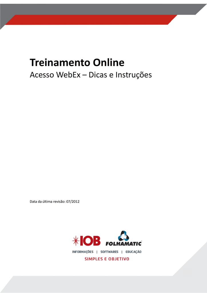 Este é um passo a passo com os requisitos mínimos e instruções de como acessar os treinamentos online, via WebEx. 1º Passo – Requisitos Mínimos Processador: 1 GHz ou superior. Memória: 512MB RAM ou superior. Sistema: Windows XP ou superior, ou Linux (kernel 2.4 ou superior) Java 1.4.2 (SUN) ou superior (caso não tiver, será solicitada a instalação automaticamente na primeira vez que acessar). Acessórios: Fones de ouvidos (headset) ou caixa de som de boa qualidade. Opcionais: Microfone e Webcam. Conexão: • ADSL (Banda larga): no mínimo 512kbps por máquina. • Wireless (Wi-fi): no mínimo 1Mb por máquina. • Modem (3G): Não é recomendada a utilização, pois há oscilação e limitação no sinal do modem. 2º Passo – Link para Acesso Acesse o link da sessão de treinamento recebido no e-mail de confirmação da inscrição. O link para acesso sempre iniciará com o seguinte endereço: https://folhamatic.webex.com/folhamatic/... Abrirá a página da sessão, preencha seu nome e e-mail no campo para login. Para os treinamentos com mais de um dia de duração esse nome e e-mail deve ser sempre o mesmo. Ou seja, o que utilizou no primeiro dia continue utilizando-os nos próximos. Quanto ao campo “Senha” não deverá aparecer nessa página para login, mas caso seja solicitado basta informar 1234. Grupo IOB Folhamatic | Manual Treinamento Online – Acesso WebEx 2 Depois, clique em “Associar-se agora”. 3º Passo – Instalação JAVA Para computadores que ainda não tenham o JAVA instalado, será aberta a tela para executar o aplicativo e instalá-lo. A instalação poderá ser feita também pelo site http://java.com/pt_BR/download/index.jsp . No site, clique no botão “Download gratuito do Java” e salve-o em sua máquina, para depois executá-lo. Grupo IOB Folhamatic | Manual Treinamento Online – Acesso WebEx 3 Após o processo de instalação, abrirá a tela do WebEx, carregando as informações necessárias: E então, já estará na sessão para acompanhar o treinamento. 4º Passo – Configuração de Áudio Ao entrar na sessão de treinamento será apresentada a seguinte pergunta: Grupo IOB Folhamatic | Manual Treinamento Online – Acesso WebEx 4 Basta clicar em “sim” para que seja aberta uma nova tela de configuração: Neste momento o primeiro item deve sempre ficar desmarcado para que seja possível ouvir as instruções do palestrante. Já o segundo item ficará marcado como padrão e não há como desmarcá-lo. 5º Passo – Opções do Treinamento Online Depois de todos os passos anteriores, a tela demonstrada será a seguinte: Grupo IOB Folhamatic | Manual Treinamento Online – Acesso WebEx 5 A tela varia conforme as instruções que o organizador estiver apresentando (slides, sistemas, etc). Não será possível alterar ou habilitar opções nela, pois é o espelho do que estiver sendo exposto. No cabeçalho, tem um menu específico para esse tipo de treinamento: Ao passar o mouse, serão abertas as opções: Grupo IOB Folhamatic | Manual Treinamento Online – Acesso WebEx 6 Retornar: Essa opção voltará para a tela principal do WebEx. Nesse momento não conseguirá mais visualizar o que o palestrante estiver expondo a não ser que clique em “Retornar ao com...”. Participantes: Nessa janela conseguirá verificar o nome do organizador e algumas interações que poderão ser feitas. No campo “Falando” aparecerá o nome do organizador ou participante que estará instruindo ou fazendo a pergunta. Como participante poderá optar se quer ligar a webcam e o microfone desde que esta permissão tenha sido dada pelo organizador. Em alguns casos, para testar som ou qualquer outra pergunta que o organizador fizer, poderá utilizar os botões do rodapé dessa mesma tela. Por exemplo, a pergunta é “Todos estão me ouvindo?” basta clicar no botão equivalente ao “sim”. Sendo assim, caso algum participante não responda nada, o organizador tentará identificar qual é o problema, via bate-papo. Grupo IOB Folhamatic | Manual Treinamento Online – Acesso WebEx 7 Bate-Papo: Esta opção ficará liberada alguns minutos antes de iniciar a sessão e reaberta ao final para que sejam expostas as dúvidas ao organizador e que ele possa respondê-las. As perguntas enviadas via bate-papo serão lidas e respondidas pelo organizador para todos os participantes presentes no treinamento. Ou seja, mesmo que um deles não fez nenhuma pergunta, ele saberá o que foi perguntado e qual foi a resposta. As opções “Anotar” e “P&R” não estarão habilitadas para os participantes. Dúvidas sobre treinamentos: [email protected] Grupo IOB Folhamatic | Manual Treinamento Online – Acesso WebEx 8