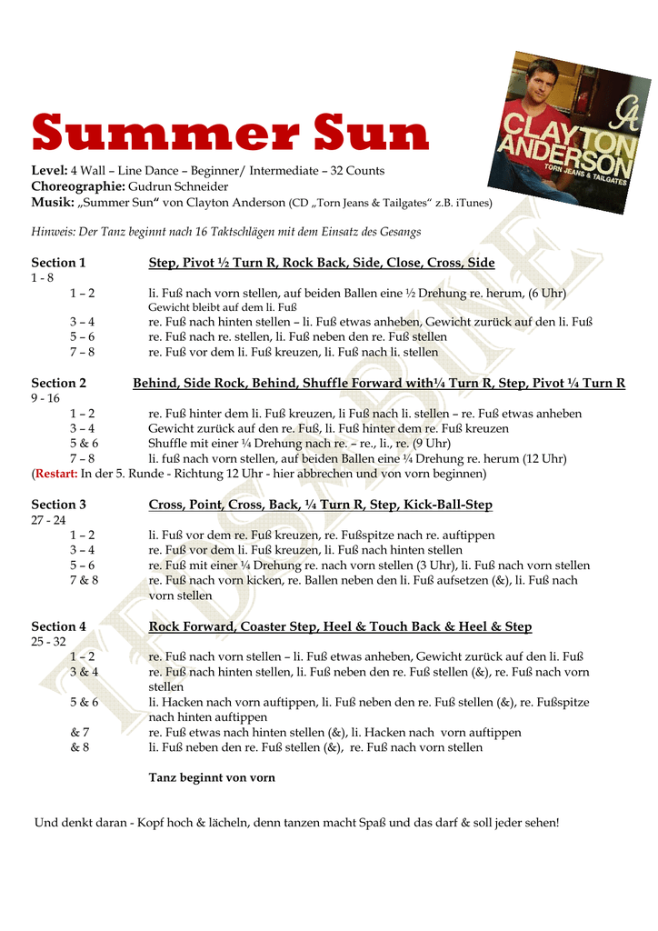 Summer Sun Level: 4 Wall – Line Dance – Beginner/ Intermediate – 32 Counts Choreographie: Gudrun Schneider Musik: „Summer Sun“ von Clayton Anderson (CD „Torn Jeans & Tailgates“ z.B. iTunes) Hinweis: Der Tanz beginnt nach 16 Taktschlägen mit dem Einsatz des Gesangs Section 1 Step, Pivot ½ Turn R, Rock Back, Side, Close, Cross, Side 1-8 1–2 li. Fuß nach vorn stellen, auf beiden Ballen eine ½ Drehung re. herum, (6 Uhr) Gewicht bleibt auf dem li. Fuß 3–4 5–6 7–8 Section 2 re. Fuß nach hinten stellen – li. Fuß etwas anheben, Gewicht zurück auf den li. Fuß re. Fuß nach re. stellen, li. Fuß neben den re. Fuß stellen re. Fuß vor dem li. Fuß kreuzen, li. Fuß nach li. stellen Behind, Side Rock, Behind, Shuffle Forward with¼ Turn R, Step, Pivot ¼ Turn R 9 - 16 1–2 re. Fuß hinter dem li. Fuß kreuzen, li Fuß nach li. stellen – re. Fuß etwas anheben 3–4 Gewicht zurück auf den re. Fuß, li. Fuß hinter dem re. Fuß kreuzen 5&6 Shuffle mit einer ¼ Drehung nach re. – re., li., re. (9 Uhr) 7–8 li. fuß nach vorn stellen, auf beiden Ballen eine ¼ Drehung re. herum (12 Uhr) (Restart: In der 5. Runde - Richtung 12 Uhr - hier abbrechen und von vorn beginnen) Section 3 Cross, Point, Cross, Back, ¼ Turn R, Step, Kick-Ball-Step 27 - 24 1–2 3–4 5–6 7&8 Section 4 li. Fuß vor dem re. Fuß kreuzen, re. Fußspitze nach re. auftippen re. Fuß vor dem li. Fuß kreuzen, li. Fuß nach hinten stellen re. Fuß mit einer ¼ Drehung re. nach vorn stellen (3 Uhr), li. Fuß nach vorn stellen re. Fuß nach vorn kicken, re. Ballen neben den li. Fuß aufsetzen (&), li. Fuß nach vorn stellen Rock Forward, Coaster Step, Heel & Touch Back & Heel & Step 25 - 32 1–2 3&4 5&6 &7 &8 re. Fuß nach vorn stellen – li. Fuß etwas anheben, Gewicht zurück auf den li. Fuß re. Fuß nach hinten stellen, li. Fuß neben den re. Fuß stellen (&), re. Fuß nach vorn stellen li. Hacken nach vorn auftippen, li. Fuß neben den re. Fuß stellen (&), re. Fußspitze nach hinten auftippen re. Fuß etwas nach hinten stellen (&), li. Hacken nach vorn auftippen li. Fuß neben den re. Fuß stellen (&), re. Fuß nach vorn stellen Tanz beginnt von vorn Und denkt daran - Kopf hoch & lächeln, denn tanzen macht Spaß und das darf & soll jeder sehen!