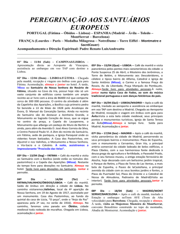 PEREGRINAÇÃO AOS SANTUÁRIOS EUROPEUS PORTUGAL (Fátima – Óbidos – Lisboa) – ESPANHA (Madrid – Ávila – Toledo – MontSerrat – Barcelona) FRANÇA (Lourdes – Paris – Medalha Milagrosa – NotreDame – Torre Eiffel – Montmatre e SacréCouer) Acompanhamento e Direção Espiritual: Padre Renato LuisAndreatto ________________________________________________________________________________ ___________________ 01º Dia – 11/04 (Sab) – CAMPINAS/LISBOA – Apresentação direta ao Aeroporto de Viracopos, assistência ao embarque em voo TAP com destino a Lisboa. 02º Dia – 12/04 (Dom) – LISBOA/FÁTIMA – Chegada pela manhã, recepção e viagem em ônibus com guia para Fátima. Acomodação, almoço e jantar no hotel. À tarde, Missa no Santuário de Nossa Senhora do Rosário de Fátima, situado na Cova da Iria, possui hoje não só um vasto conjunto de edifícios como também um amplo recinto ao ar livre com a área de 86400 m2 que comporta cerca de 300 000 pessoas. O centro da atividade é além da Capelinha das Aparições, a Basílica cuja primeira pedra foi benzida a 13 de Maio de 1928 pelo Arcebispo de Évora, D. Manuel da Conceição Santos. Ainda no recinto do Santuário são de destacar a Azinheira Grande, o Monumento ao Sagrado Coração de Jesus, que se ergue no centro da praça, a Capela do Lausperene, o Monumento que alberga um pedaço do Muro de Berlim e ainda, para além da Avenida D. José Alves Correia da Silva, o Centro Pastoral Paulo VI. A 2km do recinto do Santuário, em Fátima, sede de paróquia, a Igreja Paroquial onde os videntes foram batizados. A Casa dos Pastorinhos, em Aljustrel e nos Valinhos, o Monumento a Nossa Senhora, a Via-Sacra e o Calvário. À noite, assistiremos a impressionante “Procissão das Velas”. 03º Dia – 13/04 (Seg) – FATIMA – Café da manhã e visita ao Santuário com a Basílica (onde estão os túmulos dos pastorinhos) e a Capela das Aparições (Missa). Restante do tempo livre para devoções no Santuário. Almoço no hotel. Tarde livre para devoções no Santuário. Jantar e pernoite. 04º Dia – 14/04 (Ter) – FATIMA/VALINHOS/ÓBIDOS/LISBOA – Café da manhã. Saída de ônibus em direção a cidade de Lisboa. No caminho visitaremos,Valinhos, local da 4ª aparição de Nossa Senhora, em 19 de Agosto de 1917, assinalado por um monumento. Casa dos Pastorinhos, ao fundo do quintal da casa de Lúcia, “O poço”, onde o “Anjo da Paz” apareceu pela 2ª vez, no verão de 1916). Almoço. No caminho, faremos uma parada em Óbidos, cidade medieval toda rodeada de muralhas. Chegada em Lisboa, acomodação e jantar. 05º Dia – 15/04 (Qua) – LISBOA – Café da manhã e visita panorâmica pelos pontos mais característicos da cidade: a Ponte Suspensa 25 de Abril, o Mosteiro dos Jerônimos, a Torre de Belém, o Monumento aos Descobridores, o célebre e típico bairro de Alfama, Catedral e Igreja de Santo Antônio (Missa), o Carmo e a famosa Praça do Rossio, Av. da Liberdade, Praça Marquês do Pomba,etc. Almoço.Tarde livre para atividades pessoais.À noite, jantar numa típica Casa de Fados, ao som da música tradicional portuguesa e com danças folclóricas do país. 06º Dia – 16/04 (Qui) – LISBOA/MADRID – Após o café da manhã, traslado ao aeroporto e assistência ao embarque em voo TAP com destino a Madrid. Chegada ao Aeroporto de Madrid, recepção e viagem em ônibus com guia para Ávila.Visita a esta bela cidade medieval, seus principais pontos e monumentos turísticos, Igreja de Santa Tereza de Ávila(Missa).Almoço e tempo livre. Saída para Madrid. Acomodação e jantar. 07º Dia – 17/04 (Sex) – MADRID – Após o café da manhã, visita panorâmica da cidade de Madrid, percorrendo os seus principais bairros e monumentos: Plaza de Espanha, com o monumento a Cervantes, Gran Via, a principal artéria comercial da cidade ladeada de belos edifícios, a Plaza Cibeles, com a sua harmoniosa fonte dedicada à deusa grega da agricultura e fertilidade, o Paseodel Prado, com o seu famoso museu, a antiga estação ferroviária de Atocha, hoje decorada com um belíssimo jardim tropical, o Parque do Retiro, a Plaza de Toros de Las Ventas, a mais bela de Espanha, o Paseo de laCastellana, a principal avenida da cidade com os seus bonitos jardins e fontes, a Plaza da Puertadel Sol, Plaza do Oriente e a Catedral de Nossa de Almudena, Padroeira de Madrid(Visita ao interior). Tarde livre para atividades pessoais.Jantar e pernoite. 08º Dia – 18/04 (Sab) – MADRID/MONT SERRAT/BARCELONA – Após o café da manhã, traslado à Estação e embarque noTrem AVE (Trem de Alta velocidade) para Barcelona. Chegada, recepção e almoço. À tarde, visita ao Majestoso Mosteiro de MontSerrat, convento Beneditino construído no topo da montanha, Abadia de Montserrat. Acomodação e jantar. 09º Dia – 19/04 (Dom) – BARCELONA – Após o café, faremos uma visita panorâmica desta esplêndida cidade que com sua riqueza cultural e beleza, inspirou grande artistas como Gaudí, Miro, Salvador Dali e Picasso. Bairro gótico, com suas belas construções medievais, como a Catedral da Catalunha, o elegante Palácio de laGeneralitat (sede do governo catalão), a famosa Rambla, a avenida mais badalada de Barcelona e a monumental Igreja da Sagrada Família, a obra inacabada de Gaudí que é considerada o monumento mais excêntrico da cidade. Tarde livre para atividades pessoais. Jantar e pernoite. 10º Dia – 20/04 (Seg) – BARCELONA/ANDORRA/LOURDES – Após o café da manha, saída em ônibus para o Principado de Andorra. Visita panorâmica desta primorosa capital e pitorescos povoados nos arredores. Conheceremos alguns dos seus principais pontos de interesse um verdadeiro retorno à Idade Média, com suas fortalezas e torres de vigias. AIgreja de San Juan de Casellas,com afrescos do séc. XII; a Casa de La Vall, séc. XV, onde funciona a Corte de Justiça e a Sede do Parlamento deste pequeno país. No entanto, a