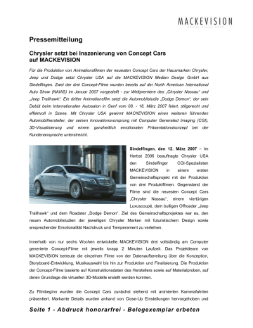 Pressemitteilung Chrysler setzt bei Inszenierung von Concept Cars auf MACKEVISION Für die Produktion von Animationsfilmen der neuesten Concept Cars der Hausmarken Chrysler, Jeep und Dodge setzt Chrysler USA auf die MACKEVISION Medien Design GmbH aus Sindelfingen. Zwei der drei Concept-Filme wurden bereits auf der North American International Auto Show (NAIAS) im Januar 2007 vorgestellt - zur Weltpremiere des „Chrysler Nassau“ und „Jeep Trailhawk“. Ein dritter Animationsfilm setzt die Automobilstudie „Dodge Demon“, der sein Debüt beim Internationalen Autosalon in Genf vom 08. - 18. März 2007 feiert, stilgerecht und effektvoll in Szene. Mit Chrysler USA gewinnt MACKEVISION einen weiteren führenden Automobilhersteller, der seinen Innovationsvorsprung mit Computer Generated Imaging (CGI), 3D-Visualisierung und einem ganzheitlich emotionalen Präsentationskonzept bei der Kundenansprache unterstreicht. Sindelfingen, den 12. März 2007 – Im Herbst 2006 beauftragte Chrysler USA den Sindelfinger MACKEVISION in CGI-Spezialisten einem ersten Gemeinschaftsprojekt mit der Produktion von drei Produktfilmen. Gegenstand der Filme sind die neuesten Concept Cars „Chrysler Nassau“, einem viertürigen Luxuscoupé, dem bulligen Offroader „Jeep Trailhawk“ und dem Roadster „Dodge Demon“. Ziel des Gemeinschaftsprojektes war es, den neuen Automobilstudien der jeweiligen Chrysler Marken mit futuristischem Design sowie ansprechender Emotionalität Nachdruck und Temperament zu verleihen. Innerhalb von nur sechs Wochen entwickelte MACKEVISION drei vollständig am Computer generierte Concept-Filme mit jeweils knapp 2 Minuten Laufzeit. Das Projektteam von MACKEVISION betreute die einzelnen Filme von der Datenaufbereitung über die Konzeption, Storyboard-Entwicklung, Musikauswahl bis hin zur Produktion und Finalisierung. Die Produktion der Concept-Filme basierte auf Konstruktionsdaten des Herstellers sowie auf Materialproben, auf deren Grundlage die virtuellen 3D-Modelle erstellt werden konnten. Zu Filmbeginn wurden die Concept Cars zunächst stehend mit animierten Kamerafahrten präsentiert. Markante Details wurden anhand von Close-Up Einstellungen hervorgehoben und Seite 1 - Abdruck honorarfrei - Belegexemplar erbeten großzügig in Szene gesetzt. Fahraufnahmen durch urbanes Gebiet und Wüstenlandschaften, die ebenfalls vollständig computergeneriert entwickelt wurden, akzentuierten die Dynamik des jeweiligen Fahrzeugtyps. Individuelle Musikkompositionen und Sound-Designs erzeugten gleichzeitig eine Harmonie zwischen Emotionalität und Hochtechnologie. Als Verwendungszweck waren die Produktfilme zunächst als interne sowie Presse- Präsentationen angedacht. Nach Fertigstellung aber war die Begeisterung über das Ergebnis bei Chrysler so groß, dass zwei Filme und zahlreiche Sequenzen spontan im Rahmen der Detroit Auto Show „NAIAS“, der größten Automobilshow in den USA, in die offizielle Enthüllungsshow und Pressekonferenz eingebunden wurden. Mit den Concept-Filmen für Chrysler USA hat der vielfache Preisträger MACKEVISION einmal mehr den Beweis angetreten, dass die Perfektion in der Ergänzung realer Bild- und Filmaufnahmen mit High-End Instrumenten der 3D-Visualisierung liegt. Die vollständigen Produktfilme für den Chrysler Nassau und Jeep Trailhawk stehen unter www.mackevision.de zum Download zur Verfügung. MACKEVISION Medien Design GmbH MACKEVISION Medien Design GmbH wurde vor über 10 Jahren gegründet. Die Wurzeln des Unternehmens liegen in der klassischen Werbefilmproduktion. Die Gesellschaft ist für ihr innovatives Mediendesign allein in 2006 unter anderem mit dem animago award, Gold award des World-Media-Festivals, Silver Star des US Film and Video Festivals, Golden Artist Award des HD Festivals for Digital Film sowie mit dem Prix Victoria Gold der Österreichischen Wirtschaftsfilmtage ausgezeichnet worden und mit seinem 45-köpfigen Spezialistenteam Qualitätsmarktführer im Bereich 3D-Visualisierung. Der Hauptsitz der Firma ist in Sindelfingen, weitere Standorte befinden sich in München und Shanghai. MACKEVISION Medien Design GmbH Veronika Rölle Burghaldenstrasse 2 D-71065 Sindelfingen Tel. +49(0)7031/2861-0 Fax: +49(0)7031/2861-105 E-Mail: [email protected] Internet: www.mackevision.de Seite 2 - Abdruck honorarfrei - Belegexemplar erbeten