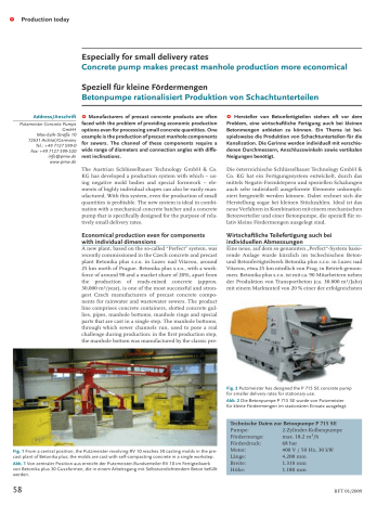 1 Production today Especially for small delivery rates Concrete pump makes precast manhole production more economical Speziell für kleine Fördermengen Betonpumpe rationalisiert Produktion von Schachtunterteilen Address/Anschrift Putzmeister Concrete Pumps GmbH Max-Eyth-Straße 10 72631 Aichtal/Germany Tel.: +49 7127 599-0 Fax: +49 7127 599-520 [email protected] www.pmw.de 1 Manufacturers of precast concrete products are often faced with the problem of providing economic production options even for processing small concrete quantities. One example is the production of precast manhole components for sewers. The channel of these components require a wide range of diameters and connection angles with different inclinations. 1 Hersteller von Betonfertigteilen stehen oft vor dem Problem, eine wirtschaftliche Fertigung auch bei kleinen Betonmengen anbieten zu können. Ein Thema ist beispielsweise die Produktion von Schachtunterteilen für die Kanalisation. Die Gerinne werden individuell mit verschiedenen Durchmessern, Anschlusswinkeln sowie vertikalen Neigungen benötigt. The Austrian Schlüsselbauer Technology GmbH & Co. KG has developed a production system with which – using negative mold bodies and special formwork – elements of highly individual shapes can also be easily manufactured. With this system, even the production of small quantities is profitable. The new system is ideal in combination with a mechanical concrete batcher and a concrete pump that is specifically designed for the purpose of relatively small delivery rates. Die österreichische Schlüsselbauer Technology GmbH & Co. KG hat ein Fertigungssystem entwickelt, durch das mittels Negativ-Formkörpern und speziellen Schalungen auch sehr individuell ausgeformte Elemente unkompliziert hergestellt werden können. Dabei rechnet sich die Herstellung sogar bei kleinen Stückzahlen. Ideal ist das neue Verfahren in Kombination mit einem mechanischen Betonverteiler und einer Betonpumpe, die speziell für relativ kleine Fördermengen ausgelegt sind. Economical production even for components with individual dimensions Wirtschaftliche Teilefertigung auch bei individuellen Abmessungen A new plant, based on the so-called “Perfect” system, was recently commissioned in the Czech concrete and precast plant Betonika plus s.r.o. in Luzec nad Vitavou, around 25 km north of Prague. Betonika plus s.r.o., with a workforce of around 90 and a market share of 20%, apart from the production of ready-mixed concrete (approx. 30,000 m3/year), is one of the most successful and strongest Czech manufacturers of precast concrete components for rainwater and wastewater sewers. The product line comprises concrete containers, slotted concrete gullies, pipes, manhole bottoms, manhole rings and special parts that are cast in a single step. The manhole bottoms, through which sewer channels run, used to pose a real challenge during production: in the first production step, the manhole bottom was manufactured by the classic pre- Eine neue, auf dem so genannten „Perfect“-System basierende Anlage wurde kürzlich im tschechischen Betonund Betonfertigteilwerk Betonika plus s.r.o. in Luzec nad Vitavou, etwa 25 km nördlich von Prag, in Betrieb genommen. Betonika plus s.r.o. ist mit ca. 90 Mitarbeitern neben der Produktion von Transportbeton (ca. 30.000 m3/Jahr) mit einem Marktanteil von 20 % einer der erfolgreichsten Fig. 2 Putzmeister has designed the P 715 SE concrete pump for smaller delivery rates for stationary use. Abb. 2 Die Betonpumpe P 715 SE wurde von Putzmeister für kleine Fördermengen im stationären Einsatz ausgelegt. Fig. 1 From a central position, the Putzmeister revolving RV 10 reaches 30 casting molds in the precast plant of Betonika plus; the molds are cast with self-compacting concrete in a single workstep. Abb. 1 Von zentraler Position aus erreicht der Putzmeister-Rundverteiler RV 10 im Fertigteilwerk von Betonika plus 30 Gussformen, die in einem Arbeitsgang mit Selbstverdichtendem Beton befüllt werden. 58 Technische Daten zur Betonpumpe P 715 SE Pumpe: 2-Zylinder-Kolbenpumpe Fördermenge: max. 18,2 m3/h Förderdruck: 68 bar Motor: 400 V / 50 Hz, 30 kW Länge: 4.200 mm Breite: 1.310 mm Höhe: 1.180 mm BFT 01/2009 Produktion heute 1 Fig. 3 A look into a two-part formwork with a negative mold of rigid polystyrene foam. Abb. 3 Blick in eine zweiteilige Schalung mit einer Negativform aus Polystyrol-Hartschaum. und stärksten tschechischen Hersteller von Fertigteilen für die Regen- und Abwasserkanalisation. Dabei handelt es sich um Betonbehälter, Betonschlitzrinnen, Rohre, Schachtunterteile, Schachtringe und Sonderteile, die in einem Arbeitsschritt aus Beton gegossen werden. Vor allem die Schachtunterteile, in denen die Gerinne der Kanalisation verlaufen, stellten früher bei der Herstellung eine Herausforderung dar: Im ersten Produktionsschritt wurde das Schachtunterteil in klassischer Fertigteilbauweise hergestellt, in einer zweiten Bearbeitungsphase erfolgte die arbeitsintensive manuelle Verkleidung mit Keramikplatten. Bei der „Perfect“-Anlage wird dies durch eine Negativform aus Polystyrol-Hartschaum gelöst, die entsprechend dem gewünschten Durchmesser, dem Winkel und der Neigung der Rinne zugeschnitten und in der zweiteiligen Schalung arretiert wird. Betonpumpeneinsatz bei Kleinmengen cast construction method; in a second processing step, the work-intensive manual lining with ceramic tiles took place. The “Perfect” plant solves this problem with a negative polystyrene rigid foam mold that is cut to the desired diameter, angle and inclination of the channel and fixedin place in the two-part formwork. Use of concrete pumps for processing small quantities Concrete delivery of more than 40 m from the mixing plant into the formwork hall is taken over by a stationary Putzmeister concrete pump P 715 SE. The delivery rate of this machine can be reduced to nearly “zero” if required, an important feature whereby – as in this case