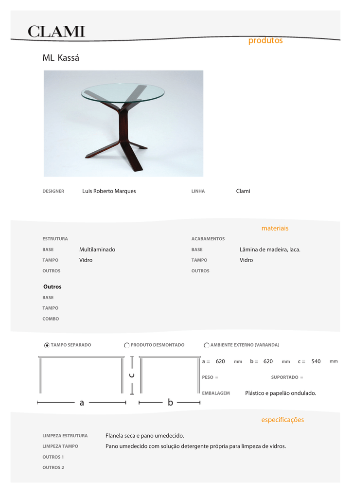 ML Kassá DESIGNER Luis Roberto Marques Clami LINHA materiais ESTRUTURA ACABAMENTOS BASE Multilaminado BASE Lâmina de madeira, laca. TAMPO Vidro TAMPO Vidro OUTROS OUTROS Outros BASE TAMPO COMBO TAMPO SEPARADO PRODUTO DESMONTADO AMBIENTE EXTERNO (VARANDA) a = 620 PESO = EMBALAGEM mm b = 620 mm c= SUPORTADO = Plástico e papelão ondulado. especificações LIMPEZA ESTRUTURA Flanela seca e pano umedecido. LIMPEZA TAMPO Pano umedecido com solução detergente própria para limpeza de vidros. OUTROS 1 OUTROS 2 540 mm