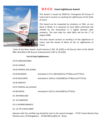 D.F.C.E. Ceará Lighthouse Award This Award is issued by GPDX-CE, Portuguese DX Group of Ceará and it consists on working the Lighthouses of the State of Ceará. GPDX - CE This Award can be requested by amateurs or SWL, on any Band or Mode. It is necessary to have QSOs confirmed and verified by any Association or 2 legally licensed radio amateurs. The start date for valid QSOs will be the 1st of August 2008. The basic Award consists on working 5 of the Lighthouse of Ceará, and the Award of Merit all the 12 Lighthouses of Ceará. Costs of the Basic Award: South America 5 IRC, 5$ (USD) or 5€ (Euros), Rest of the World 8IRC, 8$ (USD) or 8€ (Euros). Endorsements 2 IRC or 2$ (USD). List of Ceará Lighthouses: CE-01 JERICOACOARA CE-02 ITAPAJÉ CE-03 PONTAL DAS ALMAS CE-04 MUNDAÚ Activated in 27 to 28/2/2010 by PT7BI/p and PT7ZT/p CE-05 MUCURIPE Activated in 15/8 to 17/8/2008 by PT7BI/p and PT7ZT/p CE-06 ARACATI CE-07 PONTAL dos CAJUAIS CE-08 PECEM Activated in 23/2 to 24/2/2009 by PT7ZT/p CE -09 PARACURÚ CE -10 CAMOCIM CE-11 MORRO BRANCO CE -12 TIP of MUCURIPE Request with the certified Log should be sent to the award manager: PT7ZT Carlos Moreira Rua Pâmela Loren, 59 Mangabeira, 61760-000 Eusébio CE Brasil.