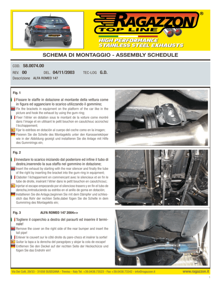 SCHEMA DI MONTAGGIO - ASSEMBLY SCHEDULE COD. 58.0074.00 REV. 00 DEL. 04/11/2003 Descrizione ALFA ROMEO 147 TEC-LOG G.D. Fig. 1 Fissare le staffe in dotazione al montante della vettura come in figura ed agganciare lo scarico utilizzando il gommino; Fix the brackets in equipment on the platform of the car like in the picture and hook the exhaust by using the gum-ring; Fixer l’étrier en dotation sous le montant de la voiture come montré dans l’image et en utilisant le petit bouchon en caoutchouc accrochez l’écchappement; Fijar lo estribos en dotación al cuerpo del coche como en la imagen; Fixieren Sie die Schelle des Montagekits unter den Karosseriekörper wie in der Abbildung gezeigt und installieren Sie die Anlage mit Hilfe des Gummirings ein; Fig. 2 Innestare lo scarico iniziando dal posteriore ed infine il tubo di destra,inserendo la sua staffa nel gommino in dotazione; Insert the exhaust by starting with the rear silencer and finally the tube of the right by inserting the bracket into the gum-ring in equipment; Claboter l’échappement en commencant avec le silencieux et en fin le tube de droite, insérant l’étrier dans le petit bouchon en caoutchcouc; Injertar el escape empezando por el silencioso trasero y en fin el tubo de derecha,inntroduciendo su estribo en el anillo de goma en dotación; Installieren Sie die Anlage,beginnen Sie mit dem Dämpfer und schliesslich das Rohr der rechten Seite,dabei fügen Sie die Schelle in dem Gummiring des Montagekits ein; Fig. 3 ALFA ROMEO 147 2004>> Togliere il coperchio a destra del paraurti ed inserire il terminale! Remove the cover on the right side of the rear bumper and insert the tail pipe! Enlever le couvert sur le côté droite du pare-chocs et insérer la sortie! Quitar la tapa a la derecha del paragolpes y alojar la cola de escape! Entfernen Sie den Deckel auf der rechten Seite der Heckschürze und fügen Sie das Endrohr ein! Via Dei Colli, 29/33 - 31058 SUSEGANA - Treviso - Italy Tel. +39.0438.73523 - Fax +39.0438.73342 - [email protected] www.ragazzon.it 1 Fig. 4 ALFA ROMEO 147 >>2004 Tagliare la nicchia sul lato destro simmetricamente a quella originale; Incise the niche on the right side symmetrically to the original ones; Entailler la niche à droite en symétrie à la niche originale; Entallar el agujero en el lado derecho en simetria con el original; Schneiden Sie die Niche auf der rechten Seite symmetrisch zu der Originalen ein; Fig. 5 Rifilare la parte di lamiera dietro il paraurti sul portaruota; Incise also the part of the sheet behind the bumper on the wheel carrier; Entailler la partie du tôle arrière le pare-chocs sur le porte roues; Entallar la parte de plancha detras del paragolpes sul lleva-rueda; Beschneiden Sie das Blech hinter der Heckschürze auf dem Radhalter; Fig. 6 Infine inserire il terminale nel tubo con l’uscita a destra della vettura! Finally insert the tail pipe on the tube wich exits on the right side of the car! Enfin,insérez la sortie sur le tube que sort sur le côté droite de la voiture! En fin,alojar la cola de escape en el tramo a la derecha del coche! Stecken Sie schließlich das Endrohr auf das auf der rechten Seite austretende Rohr! Fig. 7 Via Dei Colli, 29/33 - 31058 SUSEGANA - Treviso - Italy Tel. +39.0438.73523 - Fax +39.0438.73342 - [email protected] www.ragazzon.it 2