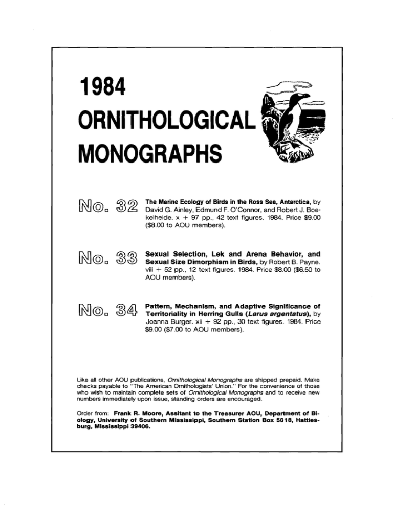 ORNITHOLO MONOGRAPHS The MarineEcologyof Birdsin the RossSea,Antarctica, by DavidG. Ainley,EdmundF. O'Connor,and RobertJ. Boekelheide.x + 97 pp., 42 text figures.1984. Price$9.00 ($8.00to AOU members). Sexual Selection, Lek and Arena Behavior, and Sexual Size Dimorphismin Birds, by RobertB. Payne. viii + 52 pp., 12 text figures.1984. Price$8.00 ($6.50 to AOU members). Pattern, Mechanism, and Adaptive Significance of Territoriality in Herring Gulls (Larus argentatus), by JoannaBurger.xii -I- 92 pp., 30 text figures.1984.Price $9.00 ($7.00to AOU members). Likeall otherAOU publications, Ornithological Monographs are shippedprepaid.Make checkspayableto "The AmericanOrnithologists' Union."For the convenienceof those who wish to maintaincompletesets of Ornithological Monographsand to receivenew numbersimmediatelyuponissue,standingordersare encouraged. Order from: Frank R. Moore, Assitant tO the Treasurer AOU, Department of Biology, University of SOuthernMississippi, Southern Station Box 5018, Hattiesburg, Mississippi 39408. COOPER ORNITHOLOGICAL SOCIETY Objectives The observationand cooperativestudy of birds. The spread of interestin bird study. The conservation of birdsand wildlifein general. The publicationof ornithological knowledge. IncorporatedDecember 6, 1934 Membership(IncludesTHE CONDOR) $18.00 ($12.00 students) AdvancePaymentin U.S. DollarsRequired Subscriptionsare entered for the calendaryear. SubscriptionAddress: Charles T. Collins,Treasurer--EA Departmentof Biology CaliforniaState University Long Beach,CA 90840 USA Publications THE CONDOR A QuarterlyJournalof OrnithologyEstablishedin 1899. STUDIES IN AVlAN BIOLOGY Devotedto Papersof UnusualLength.SupercedesPacificCoast Avifauna,Establishedin 1900: STATUS AND DISTRIBUTION OF ALASKA BIRDS. By E•RINA KESSEL and DANIEL D. GIBSON. 100 pp. SABNo. 1, November 1978 .......................................................... $9.00 SHOREBIRDS IN MARINE ENVIRONMENTS. EditedBy FRANK A. PITELKA. 261 pp. SAB No. 2, June 1979 ......... ........................................................... OUT OF PRINT BiRD COMMUNITY DYNAMICS IN A PONDEROSA PINE FOREST. By ROBERT C. SZARO and RUSSELL P. E•ALDA. 66 pp. SAB NO. 3, October 1979 .......................................................... $6.50 THE AVIFAUNA OF THE SOUTH FARALLON ISLANDS, CALIFORNIA. By DAVIDF. DESANTE and DAVID G. AINLEY. 104 pp. SABNO.4, April1980 ................................................... $10.00 ANNUAL VARIATION OF DAILY ENERGY EXPENDITURE BY THE BLACK-BILLED MAGPIE: A STUDY OF THER- MAL AND BEHAVIORAL ENERGETICS. By JOHNN. MUGAAS and JAMES R. KING.78 pp. SAB No. 5, May 1981 . $6.00 ESTIMATING NUMBERS OF TERRESTRIAL BIRDS. Edited By C. JOHNRALPH and J. MICHAEL SCO•'.630 pp. SAB No. 6, October 1981 ........................................................... OUT OF PRINT NEW TITLES POPULATION ECOLOGY OF THE DIPPER (Cinclusmexicanus)IN THE FRONT RANGE OF COLORADO. By FRANK E. PRICE and CARE E. BOCK. 84 pp. SAB No. 7, November1983 ........................... $9.00 TROPICALSEABIRDBIOLOGY.Proceedings of an InternationalSymposiumof the PacificSeabirdGroup.Editedby RALPH W. SCHREIBER. 114 pp. SAB NO.8, December1983 ................................ $12.00 Pricesaboveincludepostageandhandling. PREPAYMENTIN U.S. DOLLARSONLYIS REQUIRED Make checks payableto Cooper Ornithological Society Cooper Ornithological Society--EA P.O. Box 368 Lawrence, KS 66044 U.S.A. II I Howmany years would it taketoreplace yourcollection ? Safe-guard your valuable specimens PERMANENT SPECIMEN PRESERVATION wit•ppl•• ZOOLOGY AND ORNITHOLO SPECIMEN CABINETS Fumigant Compartment ß DoubleWall Construction ß Pest*Proof andAirTightSeal Skin Case#201 (illustrated) Holds large trays for larger specimens. ß DoublePanel Door ß Lift-OffSafeTypeHinge ß Fumigant Compartment ß 3-PointLocking Mechanism ß FrontandBackAirTightSeals ß Specimen Traysof Aluminum andMasonite. Lightweight, sturdyandeasyto handle. Skin Case:• 202 (not illustrated) Dividedfor half-sizetraysfor smallerspecimens. LaneScience Equipment Co. Dept.D 225 WEST34th Street, New York, NY 10122 Please send completedetails on Lane Zoologyand Ornithol- ogy SpecimenCabinets to: FORILLUSTRATED BROCHURE, WRITE Name Title Institution Address. SCIENCE EQUIPMENT 225 WEST34•hStreet CO. NewYork,NY 10122 City 7one.•State The Auk A Quarterly Journal of Ornithology EDITOR JOHN A. WIENS COPY EDITOR JEAN FERNER ASSOCIATE EDITORS HERBERT W. KALE II, WILLIAM VOLUME PUBLISHED THE AMERICAN E. SOUTHERN 101 BY ORNITHOLOGISTS' 1984 UNION CONTENTS OF VOLUME NUMBER 101 1 BREEDING ECOLOGY AND EXTINCTION OF THEGREATAUK (Pinguinusimpennis):ANECDOTAL EVIDENCEAND CONJECTURES. Sven-AxelBengtson........................................................................................................ 1 SONGSOF THEALDERFLYCATCHER (Empidonaxalnorum)AND WILLOWFLYCATCHER (Empidonax trailIll) AREINNATE. Donald E. Kroodsma..................................................................................................................... 13 REPRODUCTIVE ENERGETICS OF TWO TROPICAL BIRD SPECIES.D.M. Bryant, C. J. Hails, and P. Tatnet ....................................................................................................................................................................................................... 25 THE INFLUENCE OF NECTAR RESOURCESON NESTING SUCCESSAND MOVEMENT PATTERNS OF THE COMMONAMAKIHI(Hemignathus virens). CharlesvanRiperIII .................................................................. 38 MUST DESERTCHUKARS(Alectorischukar sinaica)DRINK WATER?WATERINFLUXAND BODYMASS CHANGESIN RESPONSE TO DIETARYWATERCONTENT. A. Allan Degen,Berry Pinshow,and PeterJ. Shaw ....................................................................................................................................................................... 47 THE DETECTIONOF NEAR-ULTRAVIOLET LIGHT BY NONMIGRATORYAND MIGRATORYBIRDS. John W. Parrish,JamesA. Ptacek,andKev