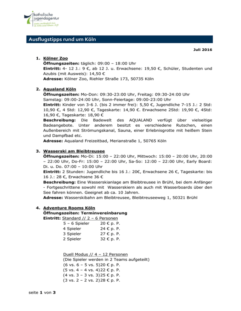 Ausflugstipps rund um Köln Juli 2016 1. Kölner Zoo Öffnungszeiten: täglich: 09:00 – 18:00 Uhr Eintritt: 4- 12 J.: 9 €, ab 12 J. u. Erwachsene: 19,50 €, Schüler, Studenten und Azubis (mit Ausweis): 14,50 € Adresse: Kölner Zoo, Riehler Straße 173, 50735 Köln 2. Aqualand Köln Öffnungszeiten: Mo-Don: 09:30-23:00 Uhr, Freitag: 09:30-24:00 Uhr Samstag: 09:00-24:00 Uhr, Sonn-Feiertage: 09:00-23:00 Uhr Eintritt: Kinder von 3-6 J. (bis 2 immer frei): 5,50 €, Jugendliche 7-15 J.: 2 Std: 10,90 €, 4 Std: 12,90 €, Tageskarte: 14,90 €. Erwachsene 2Std: 19,90 €, 4Std: 16,90 €, Tageskarte: 18,90 € Beschreibung: Die Badewelt des AQUALAND verfügt über vielseitige Badeangebote. Unter anderem besitzt es verschiedene Rutschen, einen Außenbereich mit Strömungskanal, Sauna, einer Erlebnisgrotte mit heißem Stein und Dampfbad etc. Adresse: Aqualand Freizeitbad, Merianstraße 1, 50765 Köln 3. Wasserski am Bleibtreusee Öffnungszeiten: Mo-Di: 15:00 – 22:00 Uhr, Mittwoch: 15:00 – 20:00 Uhr, 20:00 – 22:00 Uhr, Do-Fr: 15:00 – 22:00 Uhr, Sa-So: 12:00 – 22:00 Uhr, Early Board: Di. u. Do. 07:00 – 10:00 Uhr Eintritt: 2 Stunden: Jugendliche bis 16 J.: 20€, Erwachsene 26 €, Tageskarte: bis 16 J.: 28 €, Erwachsene 36 € Beschreibung: Eine Wasserskianlage am Bleibtreusee in Brühl, bei dem Anfänger - Fortgeschrittene sowohl mit Wasserskiern als auch mit Wasserboards über den See fahren können. Geeignet ab ca. 10 Jahren. Adresse: Wasserskibahn am Bleibtreusee, Bleibtreuseeweg 1, 50321 Brühl 4. Adventure Rooms Köln Öffnungszeiten: Terminvereinbarung Eintritt: Standard // 2 – 6 Personen 5 – 6 Spieler 20 € p. P. 4 Spieler 24 € p. P. 3 Spieler 27 € p. P. 2 Spieler 32 € p. P. Duell Modus // 4 – 12 Personen (Die Spieler werden in 2 Teams aufgeteilt) (6 vs. 6 – 5 vs. 5)20 € p. P. (5 vs. 4 – 4 vs. 4) 22 € p. P. (4 vs. 3 – 3 vs. 3) 25 € p. P. (3 vs. 2 – 2 vs. 2) 28 € p. P. seite 1 von 3 Beschreibung: Die AdventureRooms bieten ein „Real-Life Escape“-Spiel für Gruppen an. Beim Standard-Parcours muss sich ein Team innerhalb einer Stunde mit List und Geschick aus einem verschlossenen Raum durch vier „Phasen“ arbeiten und schließlich befreien. Adresse: AdventureRooms Köln, Maastrichter Str. 22, 50672 Köln 5. Phantasialand Öffnungszeiten: Vom 2. Juli - 28. August täglich von 09:00 - 20:00 Uhr Eintritt: Kinder von 4 - 11 J.: 29 €, Kinder ab 12 und Erwachsene: 45 € Beschreibung: Das Phantasialand in Brühl ist ein Freizeitpark für Klein und Groß, mit vielen verschiedenen Attraktionen. Adresse: Phantasialand, Schmidt-Löffelhardt GmbH & Co. KG, Berggeiststraße 31-41, 50321 Brühl 6. Glowing Rooms 3D Schwarzlicht Minigold Öffnungszeiten: Mo-Don: 14:00–21:00 Uhr, Freitag: 13:00-00:00 Uhr, Sa: 10:00-00:00 Uhr, Son: 10:00-21:00 Uhr Eintritt: von 6-12 J.: 7,50 €, von 0-5 J.: 0 €, ab 12 Jahre: 10 € Beschreibung: Indoor-Minigolf ist der wetterunabhängige Freizeitspaß für alle Altersklassen. Dabei setzt Glowing Rooms durch Schwarzlicht und den Einsatz von 3D-Effekten durch Chromadepth-Brillen außergewöhnliche Akzente. Alle Räume wurden über Wände und Boden von renommierten Graffiti-Künstlern gestaltet. Farbe und Licht beflügeln die Fantasie. Adresse: Glowing Rooms, Venloer Straße 383, 50825 Köln 7. Blackfoot Hochseilgarten Öffnungszeiten: Sommerferien Mo - Son: ab 10:00 Uhr Eintritt: Kinder von 6-15 J. Einzelticket: 19 €, ab 19 J. 4 Std: 21 € Beschreibung: Auf über 40.000 qm bieten wir Ihnen eine einzigartige Freizeitlocation mit Hochseilgarten, Gruppen Specials, Events, Schulveranstaltungen, Tauchen, Stand Up Paddling, Bogenschießen und vieles mehr! Adresse: Stallagsbergweg 1, 50769 Köln 8. Schokoladenmuseum Köln Öffnungszeiten: Juli – August täglich, auch Montags 10:00 – 18:00 Uhr, sonst: Di-Fr: 10:00 - 18:00 Uhr, Sa./So./feiertags 11:00 - 19:00 Uhr Eintritt: Erwachsene: 9 €, Gruppe ab 15 P.: 8,50 € Beschreibung: Die Geschichte von Schokolade und Kakao beginnt vor über 4000 Jahren. Sie ist gefüllt mit Mythen und Geheimnisse, Geschichten und Erzählungen, Rezepten und Genüssen. Unser Angebot an Führungen ist breit gefächert und auf ganz unterschiedliche Gruppen und Besucher zugeschnitten. Adresse: Am Schokoladenmuseum 1A, 50678 Köln seite 2 von 3 9. Silly Billy Köln Öffnungszeiten: Mo-Fr: 14:00-19:00 Uhr, Sa. So: 10:00-19:00 Uhr. Schulferien: 11:00-19:00 Uhr Eintritt: Kinder ab 2 J.: 6,90 €, Erwachsene ab 16 J.: 4,60 € Beschreibung: Ein großer Indoor-Spielpark in Köln. Es gibt große Hüpfburgen, eine tolle Kletterwand, Racing Cars, eine Trampolinanlage und mehrere Kleinspielgeräte. Geeignet ab 2 Jahre. Adresse: Silly Billy, Ottostraße 14, 50859 Köln 10. ClashBall - Bubbleball Köln Öffnungszeiten: Terminvereinbarung Eintritt: Indoor-Paket: 8 P.: 140 €, 60 Min. Spielzeit, Outdoor.Paket: 8P.: 140 €, 60 Min. Spielzeit Beschreibung: Es handelt sich hierbei um körpergroße, aufblasbare Körperairbags. Eine Art große Blase. Selbst bei einem Überschlag ist der Kopf geschützt und dem Spaßerlebnis steht nichts im Weg. Adresse: ClashBall - Bubbleball Köln, Manteuffelstr. 26, 51103 Köln-Kalk 11. Sommerrodelbahn Altenahr Öffnungszeiten: täglich von 10-17:30 Uhr Eintritt: Mo-Sa: ab 8 J. + Jugendliche: 2,20 €, Erwachsene:3,00 €, Sonntags alle 3,00 € Beschreibung: Die Sommerrodelbahn Altenahr - ein Ausflugsziel, das rundum Freude macht. Ein Spaß für Jung und Alt. Die Rodelbahn ist nur 25km von Bonn entfernt. 200m mit dem Schlepplift hinauf und dann 550m durch 7 Kurven hinab ins Tal. Adresse: Sommerrodelbahn-Altenahr, Rossberg 143, 53505 Altenahr 12. Odysseum Öffnungszeiten: Juli(August, Schulferien, Wochenende: 10:00-19:00 Uhr, ansonsten 9:00-18:00 Uhr Eintritt: 4-12 J.: 7,50 €, 13-17 J: 9,50 €. Erwachsene: 14 €, Familie: 36,50 € Beschreibung: Das Colosseum ist ein riesiger Abenteuerwissenspark. Auf einer sehr großen Experimentierfläche gibt es sechs verschiedene 