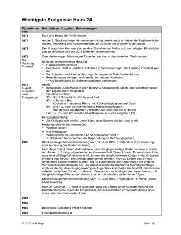 Wichtigste Ereignisse Haus 24 Eigentümer- Beschlüsse, Vorgehen, Bemerkungen vers. Kauf und Bezug der Wohnungen 1973 1974 An der 2. Stockwerkeigentümerversammlung bereits erste umfassende Reglementsänderung. Änderung des Kostenverteilers zu Gunsten der grossen Wohnungen. 1975 Der Antrag (Herr Kummer) es sei das Abstellen der Mofas auf den belegten Einstellplätzen zu verbieten wird mir 22:3 Stimmen angenommen. 1979 Mai Nachtrag Protokoll Quereleien wegen Messungen Raumtemperatur in den einzelnen Wohnungen. 1979 August Ausserordentl. Energiespar. 1980 Schlecht funktionierende Heizung: Heizungsfirma konkurs Beschluss: Statt in Juristerei soll Geld in Verbesserungen der Heizung investiert werden. Fa. Scherler macht keine Heizungsplanungen für Mehrfamilienhäuser Berechnungsunterlagen nicht mehr vorhanden (Konkurs) Als Begründung für Befreiungsgesuch verwenden Abluft: Installation Durkomaten in allen Bad/WC obligatorisch. Mech. oder Elektrisch bleibt den Eigentümern freigestellt. Situation Küchen: 3½ Nur 1 Schacht für Küche und Bad 4½ 1 Schacht Bad Küchen je 1 separate Röhre mit Rückschlagklappen auf Dach 5½ Wie 4½, aber bei Küchen keine Rückschlagklappen, statt dessen zusätzlicher Ventilator auf Dach (für alle 6 Rohre) Für 3½, 5½, und 6½ wurden Abluftklappen in Küche eingebaut (?) Fensterabdichtung: Als Obligatorisch erklärt. Jeder kann aber System wählen, das er will. Heizungsrohre in den Kellern Ost: Werden isoliert. ATA Wärmezähler Wärmezähler AG empfiehlt ATA Wärmezähler nicht !!! Schreiben hervorsuchen als Begründung für Befreiungsgesuch Stockwerkeigentümerversammlung vom 17. Juni 1980, Traktandum 9, Orientierung über Änderung der Kostenverteilung: Herr Hege macht darauf Aufmerksam dass der gegenwärtige Kostenverteiler in späteren Jahren zu Unstimmigkeiten in der Gemeinschaft führen könnte. Er weist darauf hin, dass eine allfällige Liftrevision in 30 Jahren, die möglicherweise Kosten in der Grössenordnung von 40'000.- pro Anlage ausmachen könnten, nicht zu Lasten des Erneuerungsfonds bezahlt werden dürften, da für Liftunterhalt und Reparaturen ein anderer Verteilschlüsselrechtsgültig sei. Die anschliessend durchgeführte Meinungsumfrage ergibt eindeutig, dass im gegenwärtigen Augenblick kein Bedürfnis besteht, den Kostenverteiler zu ändern. Es wird zu diesem Traktandum nicht eingetreten beschlossen, mit der gleichzeitige Bitte an den Ausschuss, er möchte dies weiterhin verfolgen. Stockwerkeigentümerversammlung vom 17. Juni 1980, Traktandum 11, Varia: Dienstbarkeitsvertrag: Herr Dr. Geismar ...... stellt in Aussicht, dass ein Vertrag unter Ausklammerung der Durchfahrtsrechte durch die Einstellhalle 22 voraussichtlich im Verlaufe dieses Sommers unterzeichnet werden kann. 1981 1982 1983 Beschluss: Sanierung West-Fassade 1984 Flachdachsanierung B 15.12.2014 H. Hege Seite 1 (7) Eigentümer- Beschlüsse, Vorgehen, Bemerkungen vers. Ansammlung von Oberflächenwasser südlich des Schulhauses Kappelenfeld 1985 Brief 19.4.84 von Walter J. Heller AG an Hr. Heinzmann: ..... wir gestatten uns, Sie darauf aufmerksam zu machen, dass die von uns in obiger Sache gewünschte Bestätigung gemäss unserem Brief vom 1. Dez. 83 immer noch ausstehend ist........ Brief 23.4.84 von Hr. Heinzmann an Walter J. Heller AG: ....Ihnen meinen seinerzeitigen Hinweis in Erinnerung zu rufen, nachdem ich stellvertretend für den Hausverwalter, Herrn R. Stampfli, die Initiative zur Entsumpfung des obenerwähnten Areals ergriffen habe. .... zumal ich die Auffassung vertrete, dass die entsprechenden Unkosten vom eigentlichen Verursacher, nämlich der Gemeindeverwaltung Wohlen bei Bern getragen werden sollten....... Funzeln in der Einstellhalle werden durch Floureszenzröhren ersetzt. Herr Beutler beanstandet die morgentlichen Klopfgeräusche der Heizung. Herr Stampfli erklärt, dass dies Problem auch in anderen Liegenschaften auftritt und bis heute keine Abhilfe bekannt ist. 1986 Ausserbetriebnahme Wasserenthärtungsanlage 1987 Deponie Fluoreszenzröhren einrichten (Bei Garagenausfahrt) 1989 Stockwerkeigentümerversammlung vom 20.Mai 1987, Traktandum 6c, Thermostatische Radiatorventile (Danfoss) Herr Stampfli orientiert, dass an das bestehende Heizungssystem (Einrohrsystem in steigender Folge) keine Thermostatventile angeschlossen werden können. Sicherungsschein für Schlüsselbestellungen ist bei der Verwaltung 1990 Beschluss: Flachdachsanierung A+C, 75 KFr Gemäss Fachmann sei Lebensdauer eines Flachdaches dieser Bauart 15 Jahre Antrag: Zirkulationspumpe für Heizung erst um 9:00 einschalten (wegen Klopfgeräuschen) Einstimmig abgelehnt 1991 Anstellung Hr. Dubuis 1993 Beschluss auf Zirkularweg: Türschliessanlagen installieren. Werden 1993 eingebaut. 8 Besitzer in Haus B und 2 Besitzer in Haus C bauen Renovationsfenster ein. (2-fach Verglasung) 1994 Brief Stampfli: Flachdach B wird repariert. 4'400 Fr für 30 m² Erneuerung wäre 36 Kfr. Dazu ist Dach noch zu jung (1984 erneuert) 1995 1996 Neue Heizung 1997 1998 Abdichtung Einstellhalle 1999 Tumbler in Haus B ersetzt Vorhang Waschplatz in Haus B ersetzt 2000 Lüftungssanierung 3½ Zi Wohnungen A + C 2001 Auf Initiative Hr. Ruchti Neubepflanzung Ost-Seite durch Hr. Ruchti, Hr+Frau Wermuth, Hr+Frau Zürcher. (ausser einem Nachtessen und je 100 Fr bescheidene Entschädigung ehrenamtlich) Türen zu Einstellhalle gewechselt 2002 Tragseile Lift B + C ersetzt 2003 Flachdachsanierung B 2004 Neuanstrich Treppenhaus A 15.12.2014 H. Hege Seite 2 (7) Eigentümer- Beschlüsse, Vorgehen, Bemerkungen vers. Neuanschaffung Rasentraktor (Siedlung) 2005 In der Einstellhalle wird eine Fluchtwegsignalisation installiert 2006 Neufassung des Reglements, da während der Jahre verschiedene Anpassungen gemacht wurden. Dabei wurden den Eigentümern jeweils nur die betroffenen Seiten zugesandt. Die Neufassung basiert auf einer eingescannten aktuellen Version. Zusätzlich enthält sie Fussnoten mit Änderungsdatum und dem Originaltext der vorh