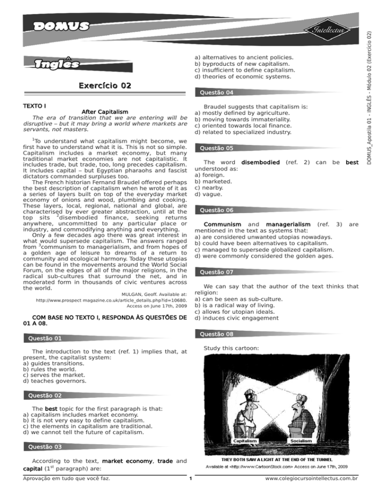 Exercício 02 Questão 04 TEXTO I Braudel suggests that capitalism is: a) mostly defined by agriculture. b) moving towards immateriality. c) oriented towards local finance. d) related to specialized industry. After Capitalism The era of transition that we are entering will be disruptive – but it may bring a world where markets are servants, not masters. 1 To understand what capitalism might become, we first have to understand what it is. This is not so simple. Capitalism includes a market economy, but many traditional market economies are not capitalistic. It includes trade, but trade, too, long precedes capitalism. It includes capital – but Egyptian pharaohs and fascist dictators commanded surpluses too. The French historian Fernand Braudel offered perhaps the best description of capitalism when he wrote of it as a series of layers built on top of the everyday market economy of onions and wood, plumbing and cooking. These layers, local, regional, national and global, are characterised by ever greater abstraction, until at the 2 top sits disembodied finance, seeking returns anywhere, uncommitted to any particular place or industry, and commodifying anything and everything. Only a few decades ago there was great interest in what would supersede capitalism. The answers ranged 3 from communism to managerialism, and from hopes of a golden age of leisure to dreams of a return to community and ecological harmony. Today these utopias can be found in the movements around the World Social Forum, on the edges of all of the major religions, in the radical sub-cultures that surround the net, and in moderated form in thousands of civic ventures across the world. Questão 05 The word disembodied understood as: a) foreign. b) marketed. c) nearby. d) vague. (ref. 2) can be best Questão 06 Communism and managerialism (ref. 3) mentioned in the text as systems that: a) are considered unwanted utopias nowadays. b) could have been alternatives to capitalism. c) managed to supersede globalized capitalism. d) were commonly considered the golden ages. are Questão 07 We can say that the author of the text thinks that religion: a) can be seen as sub-culture. b) is a radical way of living. c) allows for utopian ideals. d) induces civic engagement MULGAN, Geoff. Available at: http://www.prospect magazine.co.uk/article_details.php?id=10680. Access on June 17th, 2009 COM BASE NO TEXTO I, RESPONDA ÀS QUESTÕES DE 01 A 08. Questão 08 Questão 01 Study this cartoon: The introduction to the text (ref. 1) implies that, at present, the capitalist system: a) guides transitions. b) rules the world. c) serves the market. d) teaches governors. Questão 02 The best topic for the first paragraph is that: a) capitalism includes market economy. b) it is not very easy to define capitalism. c) the elements in capitalism are traditional. d) we cannot tell the future of capitalism. Questão 03 According to the text, market economy, trade and capital (1st paragraph) are: Aprovação em tudo que você faz. 1 www.colegiocursointellectus.com.br DOMUS_Apostila 01 - INGLÊS - Módulo 02 (Exercício 02) a) alternatives to ancient policies. b) byproducts of new capitalism. c) insufficient to define capitalism. d) theories of economic systems. Despite Hemingway’s assurances, Huck Finn remains one of the most challenged books in the U.S. In an attempt to avoid controversy, CBS Television produced a made-for-TV adaptation of the book in 1955 that lacked a single mention of slavery, or even any African American cast members to portray the character of Jim. In 1998, parents in Tempe, Ariz. sued the local high school over the book’s inclusion on a required reading list. The case went as far as a federal appeals court; the parents lost. TEXTO II Censorship in Modern Times By M.J. Stephey Brave New World Since 1982, the American Library Association has sponsored Banned Books Week to pay tribute to free speech and open libraries. The tradition began as a nod to how far society has come since 1557, when Pope Paul IV first established The Index of Prohibited Books to protect Catholics from controversial ideas. Four-hundred and nine years later, Pope Paul VI would abolish it, although attempts at censorship still remain. Here, TIME presents some of the most challenged books of all time. By Aldous Huxley The Adventures of Huckleberry Finn By Mark Twain Huxley’s 1932 work — about a drugged, dull and mass-produced society of the future — has been challenged for its themes of sexuality, drugs, and suicide. The book parodies H.G. Wells utopian novel Men Like Gods, and expresses Huxley’s disdain for the youthand market-driven culture of the United States. Chewing gum, then as now a symbol of America’s teeny-bopper shoppers, pops up in the book as a way to deliver sex hormones and subdue anxious adults; pornographic films called “feelies” are also popular grown-up pacifiers. In Huxley’s vision of the 26th century, Henry Ford is the new God (worshipers say “Our Ford” instead of “Our Lord,”) and the car maker’s concept of mass production has been applied to human reproduction. As recently as 1993, a group of parents attempted to ban the book in Corona-Norco, Calif. because it “centered around negativity.” In 1885, the Concord, Mass. Public Library banned the year-old book for its “coarse language” — critics deemed Mark Twain’s use of common vernacular (slang) as demeaning and damaging. One reviewer dubbed it “the veriest trash ... more suited to the slums than to intelligent, respectable people.” Little Women author Louisa May Alcott lashed out publicly at him, saying, “If Mr. Clemens [Twain’s original name] cannot think of something better to tell our pure-minded lads and lasses he had best stop writing for them.” (That the word “nigger” appears more than 200 times throughout the book did not initially cause much controversy). In 1905, the Brooklyn Public Library followed Concord’s lead, banishing