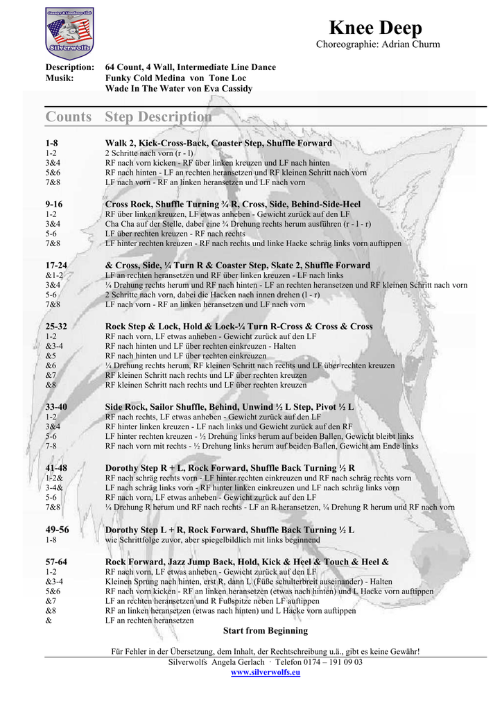 Knee Deep Choreographie: Adrian Churm Description: Musik: 64 Count, 4 Wall, Intermediate Line Dance Funky Cold Medina von Tone Loc Wade In The Water von Eva Cassidy Counts Step Description 1-8 Walk 2, Kick-Cross-Back, Coaster Step, Shuffle Forward 1-2 3&4 5&6 7&8 2 Schritte nach vorn (r - l) RF nach vorn kicken - RF über linken kreuzen und LF nach hinten RF nach hinten - LF an rechten heransetzen und RF kleinen Schritt nach vorn LF nach vorn - RF an linken heransetzen und LF nach vorn 9-16 Cross Rock, Shuffle Turning ¾ R, Cross, Side, Behind-Side-Heel 1-2 3&4 5-6 7&8 RF über linken kreuzen, LF etwas anheben - Gewicht zurück auf den LF Cha Cha auf der Stelle, dabei eine ¾ Drehung rechts herum ausführen (r - l - r) LF über rechten kreuzen - RF nach rechts LF hinter rechten kreuzen - RF nach rechts und linke Hacke schräg links vorn auftippen 17-24 & Cross, Side, ¼ Turn R & Coaster Step, Skate 2, Shuffle Forward &1-2 3&4 5-6 7&8 LF an rechten heransetzen und RF über linken kreuzen - LF nach links ¼ Drehung rechts herum und RF nach hinten - LF an rechten heransetzen und RF kleinen Schritt nach vorn 2 Schritte nach vorn, dabei die Hacken nach innen drehen (l - r) LF nach vorn - RF an linken heransetzen und LF nach vorn 25-32 Rock Step & Lock, Hold & Lock-¼ Turn R-Cross & Cross & Cross 1-2 &3-4 &5 &6 &7 &8 RF nach vorn, LF etwas anheben - Gewicht zurück auf den LF RF nach hinten und LF über rechten einkreuzen - Halten RF nach hinten und LF über rechten einkreuzen ¼ Drehung rechts herum, RF kleinen Schritt nach rechts und LF über rechten kreuzen RF kleinen Schritt nach rechts und LF über rechten kreuzen RF kleinen Schritt nach rechts und LF über rechten kreuzen 33-40 Side Rock, Sailor Shuffle, Behind, Unwind ½ L Step, Pivot ½ L 1-2 3&4 5-6 7-8 RF nach rechts, LF etwas anheben - Gewicht zurück auf den LF RF hinter linken kreuzen - LF nach links und Gewicht zurück auf den RF LF hinter rechten kreuzen - ½ Drehung links herum auf beiden Ballen, Gewicht bleibt links RF nach vorn mit rechts - ½ Drehung links herum auf beiden Ballen, Gewicht am Ende links 41-48 Dorothy Step R + L, Rock Forward, Shuffle Back Turning ½ R 1-2& 3-4& 5-6 7&8 RF nach schräg rechts vorn - LF hinter rechten einkreuzen und RF nach schräg rechts vorn LF nach schräg links vorn - RF hinter linken einkreuzen und LF nach schräg links vorn RF nach vorn, LF etwas anheben - Gewicht zurück auf den LF ¼ Drehung R herum und RF nach rechts - LF an R heransetzen, ¼ Drehung R herum und RF nach vorn 49-56 Dorothy Step L + R, Rock Forward, Shuffle Back Turning ½ L 1-8 wie Schrittfolge zuvor, aber spiegelbildlich mit links beginnend 57-64 Rock Forward, Jazz Jump Back, Hold, Kick & Heel & Touch & Heel & 1-2 &3-4 5&6 &7 &8 & RF nach vorn, LF etwas anheben - Gewicht zurück auf den LF Kleinen Sprung nach hinten, erst R, dann L (Füße schulterbreit auseinander) - Halten RF nach vorn kicken - RF an linken heransetzen (etwas nach hinten) und L Hacke vorn auftippen LF an rechten heransetzen und R Fußspitze neben LF auftippen RF an linken heransetzen (etwas nach hinten) und L Hacke vorn auftippen LF an rechten heransetzen Start from Beginning Für Fehler in der Übersetzung, dem Inhalt, der Rechtschreibung u.ä., gibt es keine Gewähr! Silverwolfs Angela Gerlach · Telefon 0174 – 191 09 03 www.silverwolfs.eu