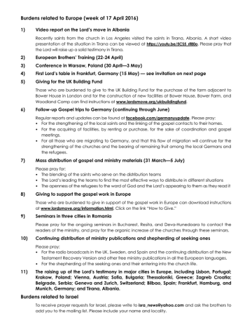 Burdens related to Europe (week of 17 April 2016) 1) Video report on the Lord’s move in Albania Recently saints from the church in Los Angeles visited the saints in Tirana, Albania. A short video presentation of the situation in Tirana can be viewed at https://youtu.be/5CS5_rif80o. Please pray that the Lord will raise up a solid testimony in Tirana. 2) European Brothers’ Training (22-24 April) 3) Conference in Warsaw, Poland (30 April—3 May) 4) First Lord’s table in Frankfurt, Germany (15 May) — see invitation on next page 5) Giving for the UK Building Fund Those who are burdened to give to the UK Building Fund for the purchase of the farm adjacent to Bower House in London and for the construction of new facilities at Bower House, Bower Farm, and Woodland Camp can find instructions at www.lordsmove.org/ukbuildingfund. 6) Follow-up Gospel trips to Germany (continuing through June) Regular reports and updates can be found at facebook.com/germanyupdate. Please pray: • For the strengthening of the local saints and the linking of the gospel contacts to their homes. • For the acquiring of facilities, by renting or purchase, for the sake of coordination and gospel meetings. • For all those who are migrating to Germany, and that this flow of migration will continue for the strengthening of the churches and the bearing of remaining fruit among the local Germans and the refugees. 7) Mass distribution of gospel and ministry materials (31 March—5 July) Please pray for: • The blending of the saints who serve on the distribution teams • The Lord’s leading the teams to find the most effective ways to distribute in different situations • The openness of the refugees to the word of God and the Lord’s appearing to them as they read it 8) Giving to support the gospel work in Europe Those who are burdened to give in support of the gospel work in Europe can download instructions at www.lordsmove.org/information.html. Click on the link “How to Give.” 9) Seminars in three cities in Romania Please pray for the ongoing seminars in Bucharest, Resita, and Deva-Hunedoara to contact the readers of the ministry, and pray for the organic increase of the churches through these seminars. 10) Continuing distribution of ministry publications and shepherding of seeking ones Please pray: • For the radio broadcasts in the UK, Sweden, and Spain and the continuing distribution of the New Testament Recovery Version and other free ministry publications in all the European languages. • For the shepherding of the seeking ones and their entering into the church life. 11) The raising up of the Lord’s testimony in major cities in Europe, including Lisbon, Portugal; Krakow, Poland; Vienna, Austria; Sofia, Bulgaria; Thessaloniki, Greece; Zagreb Croatia; Belgrade, Serbia; Geneva and Zurich, Switzerland; Bilbao, Spain; Frankfurt, Hamburg, and Munich, Germany; and Tirana, Albania. Burdens related to Israel To receive prayer requests for Israel, please write to [email protected] and ask the brothers to add you to the mailing list. Please include your name and locality. INVITATION TO THE FIRST LORD’S TABLE IN FRANKFURT, GERMANY Dear saints, We would like to announce that the saints in Frankfurt am Main, Germany, will take the ground and commence the Lord's table on Lord's Day, 15 May 2016. We appreciate the saints in the Body for standing with us and releasing the prayers for a lampstand to be raised up in this city. This is a testimony of His victory and is a real glory to the Lord and shame to the enemy. We invite you to join us in our celebration of the Lord's table, which will coincide with the annual German-speaking conference in Frankfurt from 14-16 May. If you are able to come, we would encourage you to also register for the conference at the website below, where you will find information regarding the location of the meeting, lodging, and meals. The registration deadline is 1 May. http://lebensstrombuecher.de/wp3/conference-in-frankfurt-may-2016/ Please pray that the Lord would firmly establish this lampstand and provide a strong advancement in the church life in Frankfurt. The serving brothers in Frankfurt Matthew 16:18 - And I also say to you that you are Peter, and upon this rock I will build My church, and the gates of Hades shall not prevail against it. -----------------------------------------------------------------------------Liebe Heiligen, Wir möchten ankündigen, dass die Heiligen in Frankfurt am Main den Grund einnehmen und mit dem Tisch des Herrn am Tag des Herrn, den 15. Mai 2016, anfangen werden. Wir schätzen die Heiligen im Leib, dass sie mit uns gestanden sind und die Gebete befreit haben, dass ein Leuchter in dieser Stadt aufgerichtet werden kann. Das ist ein Zeugnis über Seinen Sieg und ist eine wahre Herrlichkeit für den Herrn und Schande für den Feind. Wir laden dich ein, um mit uns in unserer Feier am Tisch des Herrn teilzunehmen, der mit der jährlichen deutschsprechenden Konferenz in Frankfurt vom 14.-16. Mai zusammenfallen wird. Wenn du kommen kannst, ermutigen wir dich, dich auch für die Konferenz im untenstehenden Internetlink anzumelden. Dort kannst du Informationen über den Ort der Versammlung, Unterkünfte und Mahlzeiten finden. Der Anmeldeschluss ist der 1. Mai. http://lebensstrombuecher.de/wp3/konferenz-in-frankfurt-am-main-14-16-5-2016/ Bitte bete für diese Zeit, dass der Herr diesen Leuchter fest gründet und ein starkes Vorangehen im Gemeindeleben in Frankfurt gewährt. Die dienenden Brüder in Frankfurt Matthäus 16:18 - Und Ich sage dir auch, dass du Petrus bist, und auf diesen Felsen werde Ich Meine Gemeinde bauen, und die Pforten des Hades werden nicht den Sieg über sie davontragen.