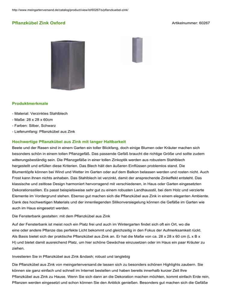 http://www.meingartenversand.de/catalog/product/view/id/60267/s/pflanzkuebel-zink/ Pflanzkübel Zink Oxford Artikelnummer: 60267 Produktmerkmale - Material: Verzinktes Stahlblech - Maße: 28 x 28 x 60cm - Farben: Silber, Schwarz - Lieferumfang: Pflanzkübel aus Zink Hochwertige Pflanzkübel aus Zink mit langer Haltbarkeit Beete und der Rasen sind in einem Garten ein toller Blickfang, doch einige Blumen oder Kräuter machen sich besonders schön in einem tollen Pflanzgefäß. Das passende Gefäß braucht die richtige Größe und sollte zudem witterungsbeständig sein. Die Pflanzgefäße in einer tollen Zinkoptik werden aus robustem Stahlblech hergestellt und erfüllen diese Kriterien. Das Blech hält den äußeren Einflüssen problemlos stand. Die Blumentöpfe können bei Wind und Wetter im Garten oder auf dem Balkon belassen werden und rosten nicht. Auch Frost kann ihnen nichts anhaben. Das Stahlblech ist verzinkt, damit der ansprechende Zinkeffekt entsteht. Das klassische und zeitlose Design harmoniert hervorragend mit verschiedenen, in Haus oder Garten eingesetzten Dekorationsstilen. Es passt beispielsweise sehr gut zu einem robusten Landhausstil, bei dem Holz und verzierte Elemente im Vordergrund stehen. Ebenso gut machen sich die Pflanzkübel aus Zink in einem eleganten Ambiente. Dank des hochwertigen Materials und der innenliegenden Silikonversiegelung können die Gefäße im Garten wie auch im Haus eingesetzt werden. Die Fensterbank gestalten: mit dem Pflanzkübel aus Zink Auf der Fensterbank ist meist noch ein Platz frei und auch im Wintergarten findet sich oft ein Ort, wo die eine oder andere Pflanze das perfekte Licht bekommt und gleichzeitig in den Fokus der Aufmerksamkeit rückt. Als Basis bietet sich der praktische Pflanzkübel aus Zink an. Er hat die Maße von ca. 28 x 28 x 60 cm (L x B x H) und bietet damit ausreichend Platz, um hier schöne Gewächse einzusetzen oder im Haus ein paar Kräuter zu ziehen. Investieren Sie in Pflanzkübel aus Zink – robust und langlebig Die Pflanzkübel aus Zink von meingartenversand.de lassen sich zu besonders schönen Highlights zaubern. Sie können sie ganz einfach und schnell im Internet bestellen und haben bereits innerhalb kurzer Zeit Ihre Pflanzkübel aus Zink zu Hause. Wenn Sie sich dann an die Dekoration machen möchten, kommt einfach Erde rein, Pflanzen werden eingesetzt und schon können Sie den Anblick genießen. Besonders gut machen sich die Gefäße auch, um Petersilie oder andere Kräuter für den Hausgebrauch anzubauen und dann frisch zu ernten. Dazu empfiehlt sich eine Kräuter Düngermischung von meingartenversand.de. Wenn Sie die Kübel im Außenbereich einsetzen möchten, bohren Sie einfach ein kleines Loch in den Boden. Auf diese Weise lässt sich verhindern, dass Staunässe entsteht. Bestellen Sie bequem vom Sofa aus bei meingartenversand.de und genießen Sie Ihre neue, grüne Wohlfühl-Oase. Preis: 46,95 EUR | Birkenweg 32 | 22395 Hamburg | Telefon: 04101 / 835 510 | www.meingartenversand.de | [email protected]