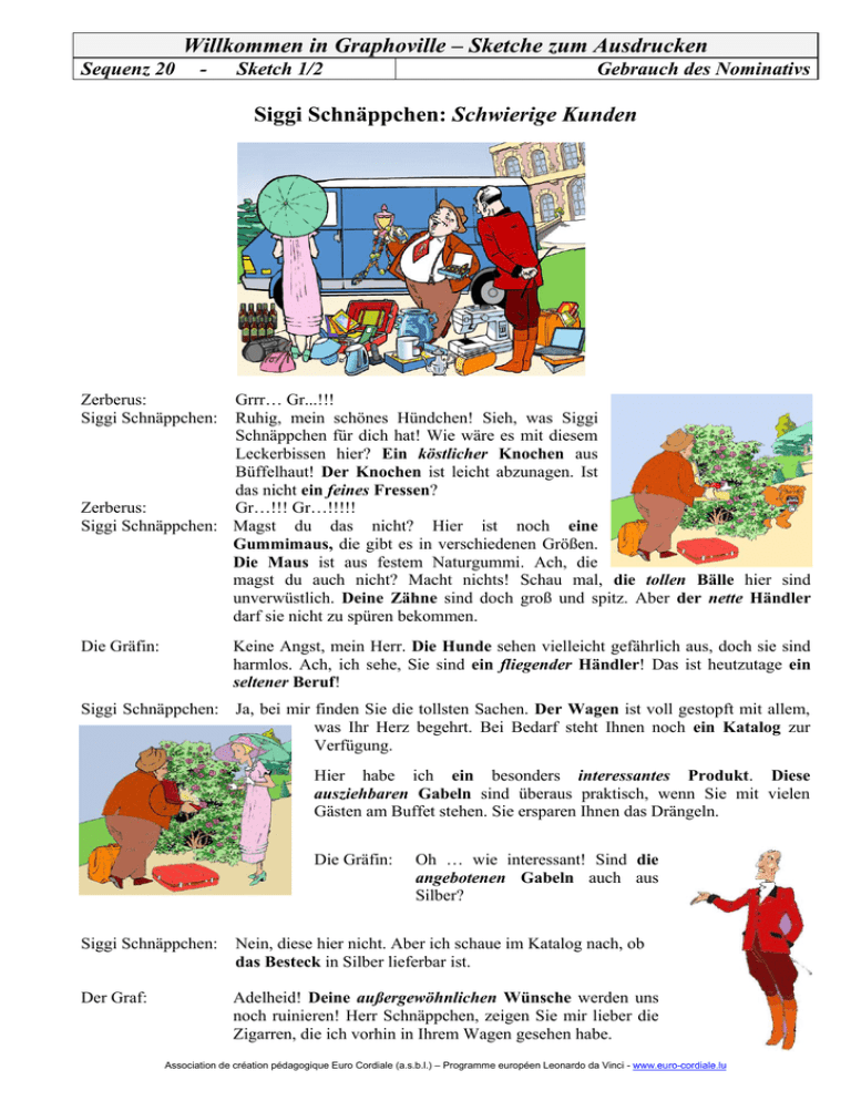 Willkommen in Graphoville – Sketche zum Ausdrucken Sequenz 20 - Sketch 1/2 Gebrauch des Nominativs sketches Sketche zum Ausdrucken, Sketche zum Drucken, ausdruckbare Sketche, gratis Sketche, Sketche zum Spielen, Deutsch als Fremdsprache, Rechtschreibung, Grammatik, deutsch, Sketche DaF à Siggi Schnäppchen: Schwierige Kunden Grrr… Gr...!!! Ruhig, mein schönes Hündchen! Sieh, was Siggi Schnäppchen für dich hat! Wie wäre es mit diesem Leckerbissen hier? Ein köstlicher Knochen aus Büffelhaut! Der Knochen ist leicht abzunagen. Ist das nicht ein feines Fressen? Zerberus: Gr…!!! Gr…!!!!! Siggi Schnäppchen: Magst du das nicht? Hier ist noch eine Gummimaus, die gibt es in verschiedenen Größen. Die Maus ist aus festem Naturgummi. Ach, die magst du auch nicht? Macht nichts! Schau mal, die tollen Bälle hier sind unverwüstlich. Deine Zähne sind doch groß und spitz. Aber der nette Händler darf sie nicht zu spüren bekommen. Zerberus: Siggi Schnäppchen: Die Gräfin: Keine Angst, mein Herr. Die Hunde sehen vielleicht gefährlich aus, doch sie sind harmlos. Ach, ich sehe, Sie sind ein fliegender Händler! Das ist heutzutage ein seltener Beruf! Siggi Schnäppchen: Ja, bei mir finden Sie die tollsten Sachen. Der Wagen ist voll gestopft mit allem, was Ihr Herz begehrt. Bei Bedarf steht Ihnen noch ein Katalog zur Verfügung. Hier habe ich ein besonders interessantes Produkt. Diese ausziehbaren Gabeln sind überaus praktisch, wenn Sie mit vielen Gästen am Buffet stehen. Sie ersparen Ihnen das Drängeln. Die Gräfin: Oh … wie interessant! Sind die angebotenen Gabeln auch aus Silber? Siggi Schnäppchen: Nein, diese hier nicht. Aber ich schaue im Katalog nach, ob das Besteck in Silber lieferbar ist. Der Graf: Adelheid! Deine außergewöhnlichen Wünsche werden uns noch ruinieren! Herr Schnäppchen, zeigen Sie mir lieber die Zigarren, die ich vorhin in Ihrem Wagen gesehen habe. Association de création pédagogique Euro Cordiale (a.s.b.l.) – Programme européen Leonardo da Vinci - www.euro-cordiale.lu Willkommen in Graphoville – Sketche zum Ausdrucken Sequenz 20 - Sketch 2/2 Gebrauch des Nominativs Siggi Schnäppchen: Nicht aufgeben! Das sind: Die Gräfin Adelaïde und ihr Bruder Graf Archibald, Nanni und Juppi ihre Neffen (8 und 9 Jahre), Justine die Hausangestellte und der Schriftsteller Simon, ein Cousin der Gräfin. Wem stellt er seine Artikel vor? Aber nein, mein Herr, die Produkte von Sigi Schnäppchen sind preiswert! Die Gabeln sind zurzeit im Angebot! Die brandneuen grünen Kehrbesen sind noch nicht im Katalog. Außerdem ist das Modell ausziehbar! Was? Eine Spielkonsole soll in meinem Lieferwagen sein? Aber nein! In dem Karton befindet sich ein Minicomputer. Doch dafür seid ihr noch zu jung! Die Seidenhandschuhe hier sind sehr elegant, gnädige Frau. Sind sie aus Baumwolle? Aber nein, die weißen Handschuhe sind doch nicht aus Baumwolle! Lederhandschuhe sind im Moment der letzte Schrei! Junger Mann, das ist quasi ein magischer Kugelschreiber! Er schreibt fast von alleine! Nein, Bonbons mit Cola-Geschmack schmecken mir nicht, daher führe ich sie nicht. Sie sind pure Chemie. Aber die Pralinen sind exzellent! Aber sicher, die Reithosen passen Ihnen bestimmt! Aber Sie müssen sie anprobieren. Hier ist auch die dazu gehörende Weste! Die Pferdedecke gefällt Ihnen auch? Wunderbar! Das ökologisch abbaubare Reinigungsmittel ist ein Geschenk des Hauses! Ein ultramodernes schnurloses Telefon wäre im Schloss überaus praktisch, gnädiger Herr! Das Modell hier ist außerdem sehr billig… Nein? Kein modernes Telefon? Na ja, wie Sie wünschen! Sehen Sie nur, gnädige Frau! Das Silberbesteck vor Ihnen ist spülmaschinenfest! Interessant, nicht wahr? Kratzfeste Pfannen, wie die hier, sind sonst nirgendwo zu finden! Greifen Sie zu! Association de création pédagogique Euro Cordiale (a.s.b.l.) – Programme européen Leonardo da Vinci - www.euro-cordiale.lu