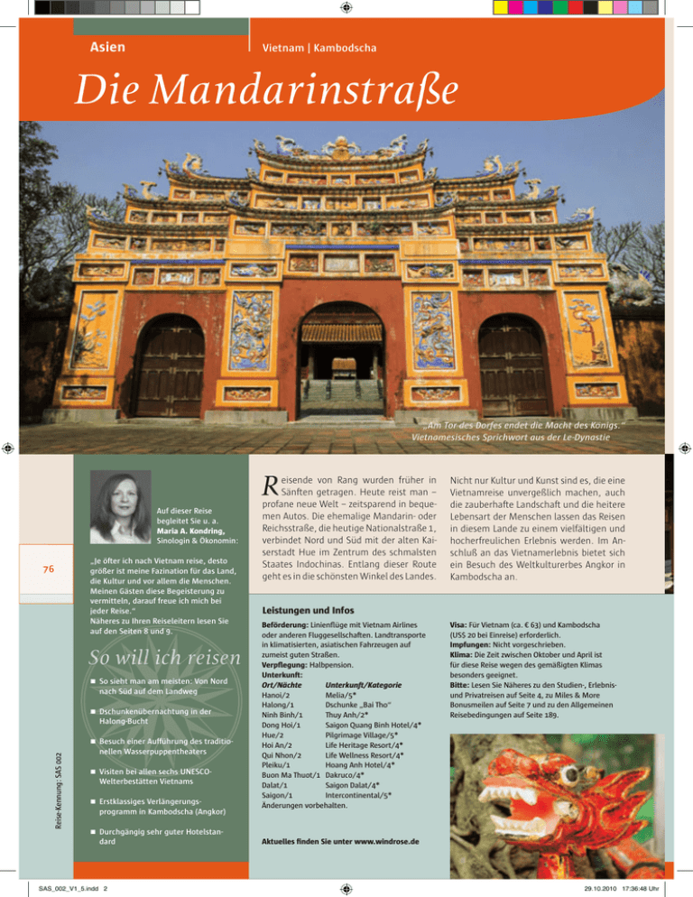 Asien Vietnam | Kambodscha Die Mandarinstraße „Am Tor des Dorfes endet die Macht des Königs.“ Vietnamesisches Sprichwort aus der Le-Dynastie R Auf dieser Reise begleitet Sie u. a. Maria A. Kondring, Sinologin & Ökonomin: 76 „Je öfter ich nach Vietnam reise, desto größer ist meine Fazination für das Land, die Kultur und vor allem die Menschen. Meinen Gästen diese Begeisterung zu vermitteln, darauf freue ich mich bei jeder Reise.“ Näheres zu Ihren Reiseleitern lesen Sie auf den Seiten 8 und 9. So will ich reisen So sieht man am meisten: Von Nord nach Süd auf dem Landweg Dschunkenübernachtung in der Halong-Bucht Reise-Kennung: SAS 002 Besuch einer Aufführung des traditio- nellen Wasserpuppentheaters Visiten bei allen sechs UNESCO- Welterbestätten Vietnams Erstklassiges Verlängerungs- programm in Kambodscha (Angkor) eisende von Rang wurden früher in Sänften getragen. Heute reist man – profane neue Welt – zeitsparend in bequemen Autos. Die ehemalige Mandarin- oder Reichsstraße, die heutige Nationalstraße 1, verbindet Nord und Süd mit der alten Kaiserstadt Hue im Zentrum des schmalsten Staates Indochinas. Entlang dieser Route geht es in die schönsten Winkel des Landes. Nicht nur Kultur und Kunst sind es, die eine Vietnamreise unvergeßlich machen, auch die zauberhafte Landschaft und die heitere Lebensart der Menschen lassen das Reisen in diesem Lande zu einem vielfältigen und hocherfreulichen Erlebnis werden. Im Anschluß an das Vietnamerlebnis bietet sich ein Besuch des Weltkulturerbes Angkor in Kambodscha an. Leistungen und Infos Beförderung: Linienflüge mit Vietnam Airlines oder anderen Fluggesellschaften. Landtransporte in klimatisierten, asiatischen Fahrzeugen auf zumeist guten Straßen. Verpflegung: Halbpension. Unterkunft: Ort/Nächte Unterkunft/Kategorie Hanoi/2 Melia/5* Halong/1 Dschunke „Bai Tho“ Ninh Binh/1 Thuy Anh/2* Dong Hoi/1 Saigon Quang Binh Hotel/4* Hue/2 Pilgrimage Village/5* Hoi An/2 Life Heritage Resort/4* Qui Nhon/2 Life Wellness Resort/4* Pleiku/1 Hoang Anh Hotel/4* Buon Ma Thuot/1 Dakruco/4* Dalat/1 Saigon Dalat/4* Saigon/1 Intercontinental/5* Änderungen vorbehalten. Visa: Für Vietnam (ca. € 63) und Kambodscha (US$ 20 bei Einreise) erforderlich. Impfungen: Nicht vorgeschrieben. Klima: Die Zeit zwischen Oktober und April ist für diese Reise wegen des gemäßigten Klimas besonders geeignet. Bitte: Lesen Sie Näheres zu den Studien-, Erlebnisund Privatreisen auf Seite 4, zu Miles & More Bonusmeilen auf Seite 7 und zu den Allgemeinen Reisebedingungen auf Seite 189. Durchgängig sehr guter Hotelstan- dard SAS_002_V1_5.indd 2 Aktuelles finden Sie unter www.windrose.de 29.10.2010 17:36:48 Uhr Die 18 Erlebnistage 1 Frankfurt – Vietnam Am Nachmittag Abflug nach Südostasien. 2 Hanoi Ankunft in Hanoi am frühen Morgen. Am Nachmittag Besuch des Hoan-Kiem-Sees sowie des Ngoc-Son-Tempels und Bummel durch das quirlige, schachbrettartige Altstadtlabyrinth. 3 Hanoi Stadtbesichtigung in Hanoi: Ho-Chi-Minh-Haus, Einpfahlpagode, Tran-Quoc-Pagode und Tempel der Literatur sowie Ethnologisches Museum. Abschließend Besuch des einzigartigen, traditionellen Wasserpuppentheaters. 4 Hanoi – Halong Fahrt nach Halong, unterwegs Besichtigung der But-Thap-Pagode. Gegen Mittag Beginn der Bootsfahrt durch die faszinierende Kegel-Karstlandschaft der Bucht mit ihren steil aufragenden Felseninseln (UNESCO-Welterbe). Übernachtung an Bord einer Dschunke. 5 Halong – Ninh Binh Fortsetzung der Bootsfahrt. Anschließend Fahrt in nördlicher Richtung nach Ninh Binh. Unterwegs Besuch der Keo-Pagode. 6 Ninh Binh – Hanoi – Dong Hoi Besuch der alten Kaiserstadt Hoa Lu. Anschließend Fahrt in die „Trockene Halong-Bucht“ und Bootstour mit Sampans durch das Tam-CocHöhlensystem. Wanderung zum Felsentempel Chua Bich Dong mit herrlichem Ausblick auf eine Landschaft, die zu den schönsten Vietnams gehört. Am Nachmittag Fahrradfahrt zu den traditionellen Dörfern Van Lam und Ninh Van. Rückfahrt nach Hanoi und Beginn der Zugfahrt im Schlafwagen nach Dong Hoi. 7 Dong Hoi – Hue Ankunft in Dong Hoi am frühen Morgen und Erfrischung im Hotel. Fahrt zur Phong-Nha- Grotte, einer der längsten und schönsten Höhlen der Erde. Danach Fahrt in die ehemalige Kaiserstadt Hue, bis 1945 Hauptstadt des vereinten Annam. 8 Hue Bootsfahrt auf dem Parfümfluß zur Thien-Mu-Pagode und zum Kaisergrab Minh Mang. Anschließend Besuch des Mausoleums von Kaiser Khai Dinh und der innerhalb der Zitadellen-Mauern liegenden „verbotenen“ Kaiserstadt. Am Abend stimmungsvolle Bootsfahrt, begleitet von Musik der vietnamesischen Kaiserzeit. 9 Hue – Da Nang – Hoi An Autofahrt auf landschaftlich imponierender Straße über Lang Co und den Wolkenpaß. Unterwegs Besuch des berühmten Cham-Museums in Da Nang. Weiterfahrt entlang der Marmorberge nach Hoi An. 10 Hoi An: My Son Besuch von zwei Welterbestätten: My Son, die Ruinen der ehemaligen Cham-Hauptstadt, und das multikulturelle Hoi An, die mittelalterliche Hafenstadt. 11 Hoi An – My Lai – Qui Nhon Fahrt entlang der Küste nach Qui Nhon. Unterwegs Stop an der My-Lai-Gedenkstätte. 12 Qui Nhon Der Tag lockt mit individuellen Unternehmungen in der Umgebung oder lädt zu einem Strandaufenthalt ein. 13 Qui Nhon – Pleiku Rundfahrt in Qui Nonh mit Besuch des QuangTrung-Museums und Besichtigung der ChamTürme Duong Long und Ban It. Am Nachmittag Fahrt ins zentrale Hochland nach Pleiku. 14 Pleiku – Buon Ma Thuot Am Vormittag Besuch von ethnischen Minderheiten. Am Nachmittag Fahrt nach Buon Ma Thuot und Stadtbesichtigung. Termine und Preise Termine 2011 Fr 04.02. – 21.02. STU Fr 25.03. – 11.04. ERL Fr 28.10. – 14.11. STU Fr 18.11. – 05.12. * ERL Fr 16.12. – 02.01. ** STU Erlebnis Plus Termine 2012 Fr 03.02. – 20.02. STU Fr 23.03. – 09.04. STU Fr 26.10. – 12.11. STU Fr 16.11. – 03.12. * ERL Fr 14.12. – 31.12. ** STU STU = Studienreise Reisen Sie mit erfahrenen, qualifizierten Reiseleitern. Maximal 18, mindestens 12 Teil