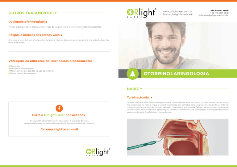 www.orlightlaser.com.br fb.com/orlightlaserbrasil OUTROS TRATAMENTOS São Paulo - Brasil + 55 (11) 3871-9041 [email protected] Uvulopalatofaringoplastia Técnica a laser possibilita precisão, menor risco de sangramento e preservação dos tecidos adjacentes. Pólipos e nódulos nas cordas vocais A técnica a laser diminui o tempo de cirurgia e o risco de sangramento e garante a integridade das estruturas adjacentes. Vantagens da utilização do laser nesses procedimentos Menos dor Recuperação mais rápida Menos edema dos tecidos no pós-operatório. Menor tempo de operação OTORRINOLARINGOLOGIA NARIZ Turbinectomia Cirurgia realizada para aliviar a congestão nasal crônica do paciente, em que a luz laser atravessa uma sonda fina introduzida no nariz e reduz o tamanho do tecido dos cornetos, sem sangramento. Ela pode ser feita em conjunto com outros tipos de cirurgia, tais quais rinoplastia e septoplastia. Existem várias técnicas distintas de turbinectomia, e cada uma delas é própria para uma situação diferente. Em comparação às cirurgias tradicionais, esse procedimento é realizado em menos tempo. Curta a ORlight Laser no Facebook Acompanhe semanalmente notícias sobre o universo do laser, suas possibilidades e o avanço dessa ciência nas áreas estética e cirúrgica. fb.com/orlightlaserbrasil Adenoides Amigdalas (Amigdalites) A técnica a laser trata a adesão sem sangramentos e em menor tempo que as técnicas tradicionais. A intervenção pode ser cirúrgica ou ambulatorial, dependendo do grau da adesão, e em ambos os casos, a recuperação é rápida comparada às técnicas tradicionais. A técnica de Amigdalectomia a laser, indicada para os pacientes com inflamações constantes nas amígdalas, possibilita que o procedimento cirúrgico seja realizado com menor risco de sangramento e que o tecido amigdaliano seja preservado. Cirurgia para sinusite (Sinusectomia) Para situações de inflamação dos seios paranasais. A cirurgia consiste em remover delicadamente, com instrumentos adequados, as estruturas que obstruem os canais e dificultam sua drenagem, facilitando o esvaziamento de muco produzido diariamente pelos seios paranasais. OUVIDO Miringotomia Miringotomia ou timpanotomia é o corte da membrana timpânica, com as finalidades de drenagem das efusões pela tuba auditiva e aeração da orelha média. Esta operação realizada a laser substitui com eficácia o instrumento cirúrgico comum usado para perfurar a membrana timpânica e, por ser menos invasiva, pode acontecer em uma clínica ou até mesmo em um consultório médico. GARGANTA Laringectomia transoral ressecção transoral para o câncer de laringe (fases I e II) Com técnicas fonomicrocirúrgicas e as vantagens que o laser de diodo proporciona, é possível realizar ressecções transorais completas com precisão e o mínimo de lesões nos tecidos adjacentes. Assim, reduz-se o risco de sangramento e metástase em caso de maligno. A recuperação do paciente é rápida, com resultados satisfatórios. Estapedectomia Procedimento cirúrgico que remove parte ou todo o estribo e o substitui por uma prótese reconstituindo a cadeia ossicular, a fim de restaurar a audição em pacientes afetados por otosclerose.