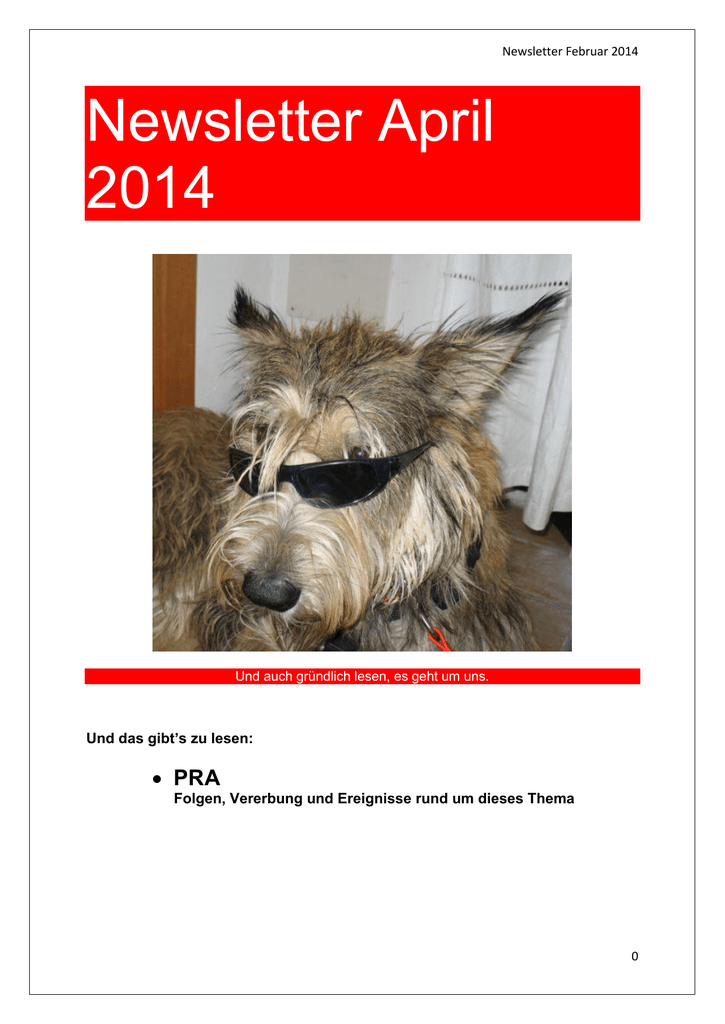 Newsletter Februar 2014 Newsletter April 2014 Und auch gründlich lesen, es geht um uns. Und das gibt’s zu lesen: PRA Folgen, Vererbung und Ereignisse rund um dieses Thema 0 Newsletter Februar 2014 Liebe Picardler, dieser Newsletter beschäftigt sich, wie angekündigt, nur mit dem Thema PRA, einer Augenerkrankung, die für unsere Hunde leider eine große Gefahr darstellen könnte. Bevor ich Euch einen Abriss der Geschehnisse rund um dieses Thema gebe, möchte ich Euch bitten, die Ausführungen unserer Zuchtberaterin Bettina Mode zur PRA und zur Vererbung aufmerksam zu lesen. Diese Erläuterungen sind nämlich Grundlage der Dinge, die wir als Vorstand der AG Picard zusammen mit Bettina Mode zu realisieren versuchen. Hier nun zuerst Bettina Modes Erklärungen PRA Allgemein: Die PRA gehört mit zu den wichtigsten erblichen Augenerkrankungen des Hundes. Sie ist bei vielen Hunderassen verbreitet. An dieser progressiven Erkrankung mit autosomal rezessivem Erbgang können sowohl weibliche als auch männliche Tiere erkranken. Betroffene Tiere tragen die Anlage der PRA in homozygoter (reinerbiger) Ausprägung in sich, wobei die Erkrankung erst ab einem bestimmten Lebensalter auftritt. Andererseits gibt es sog. „Träger" des Gens, die selbst gesund bleiben, die PRA aber weitervererben können. PRA ist nicht heilbar und kann auch nicht behandelt oder im Verlauf gebremst werden. Sie betrifft die innerste Schicht des Auges, d.h. die Netzhaut, in welcher sich die für das Sehen so wichtigen Nervenzellen befinden. Hierbei unterscheidet man die Zapfen für das Tagsehen und die Stäbchen für das Nachtsehen. Die PRA beginnt mit dem langsamen Absterben der Stäbchen; im weiteren Verlauf degenerieren auch die Zapfen. Die betroffenen Hunde verlieren also typischerweise zuerst ihre Sehfähigkeit im Dunkeln und anschließend auch die Fähigkeit, bei Tageslicht zu sehen. Die PRA führt in allen Fällen zur totalen Erblindung beider Augen. Vererbung: Wie oben schon erwähnt handelt es sich bei der PRA um eine autosomal- rezessiv vererbte Krankheit. Autosomal bedeutet, dass das für die Krankheit verantwortliche Gen auf einem Autosom liegt (Autosom ist ein Chromosom, das nicht zu den Geschlechtshormonen gehört) und daher nicht geschlechtsspezifisch ist. Damit eine autosomal-rezessive Erbkrankheit ausbricht, müssen die Anlagen dazu von beiden Eltern vererbt werden. Rezessiv bedeutet „zurücktretend“ oder auch „nicht in Erscheinung tretend“. In der Genetik unterscheidet man zwischen dominanten und rezessiven Allelen eines Gens 1 Newsletter Februar 2014 (Die Funktionsform eines Genes - also die Art und Weise - wie ein Gen ein Merkmal ausprägt, bezeichnet man als Allel. Das PRA-Gen wäre also ein mutiertes Allel)) Ein dominantes Allel setzt sich gegenüber einem rezessiven Allel durch. Damit ein rezessives Allel merkmalsbestimmend werden kann, muss es homozygot (reinerbig) vorliegen. Das rezessive Allel ist zumeist durch eine Mutation entstanden und kann zu einem Merkmal mit eingeschränkter Funktionsfähigkeit führen Wenn es heterozygot (mischerbig) vorliegt, kann das nichtdefekte Allel die mögliche Einschränkung der Funktion überspielen. Bei einem “rezessiven Erbgang” erkranken nur Hunde, wenn sie von beiden Eltern je ein defektes (= krank machendes) Gen erben. D.h. die Krankheit bricht nicht aus, wenn nur ein Elternteil das defekte Gen weitervererbt. Hunde mit nur einem fehlerhaften Gen sind Anlage-Träger. Sie erkranken selbst nicht, können (müssen aber nicht) das defekte Gen weitervererben. Die Krankheit manifestiert sich erst, wenn das rezessive (krank machende) Gen reinerbig vorliegt, es also von Vater und Mutter geerbt wurde. Hunde, die kein defektes Gen haben, sind Anlage-frei (erb-gesund). Warum ein PRA Gentest? Seit Jahren ist im CFH die klinische Augenuntersuchung auf PRA für Picards, die zur Zucht verwendet werden, in den „Rassespezifischen Zuchtbestimmungen“ vorgeschrieben. Eine klinische Augenuntersuchung bedeutet in diesem Fall, dass ein Tierarzt des Dortmunder Kreises mit einer Zusatzausbildung im Bereich der Augenerkrankungen den Hund auf Anzeichen der PRA untersucht. Bei der klinischen Untersuchung ist eine PRA Erkrankung sicher feststellbar. PRA-Gen Träger können klinisch überhaupt nicht erkannt werden, da sie ja keine Anzeichen der Krankheit zeigen und auch nicht an PRA erkranken. Da diese Erkrankung vererbbar ist, ist es aber auch wichtig PRA-Gen Träger zu erkennen. Bis jetzt konnte man nur bei Erkrankung eines Hundes annehmen, dass seine Eltern Träger der Krankheit sind, bzw. wenn ein Elterntier erkrankte (obwohl es bei der Untersuchung durch den Tierarzt als gesund eingestuft wurde), muss man die Möglichkeit in Betracht ziehen, dass die Nachkommen zumindest Träger der PRA sein könnten. Da schon ab einem Alter von 18 Monaten gezüchtet werden darf, die PRA Erkrankung aber erst viel später erkannt werden kann, ist es möglich, dass eine Hündin bis zum Erkennen der PRA schon mehrere Würfe zur Welt gebracht hat. Ebenso kann ein Rüde bis zu diesem Zeitpunkt, je nach Deckeinsatz, schon sehr viele Nachkommen gezeugt haben. Es ist also trotz klinischer Untersuchung immer noch ein Glücksspiel, ob man mit PRA-Gen freien, PRA-Gen Trägern oder sogar mit Tieren züchtet, die das PRA-Gen 2 Newsletter Februar 2014 von beiden Elterntieren geerbt haben und irgendwann erkranken werden. In all diesen möglichen Varianten war und ist noch immer die Möglichkeit offen, dass die Nachkommen an PRA erkranken können. Da man bisher keine andere Untersuchungsmethode kennt, ist die klinische PRA Untersuchung die einzige, wenn auch nicht sichere, aber relativ kostengünstige Möglichkeit auf PRA zu untersuchen. Daher benötigen wir unbedingt einen sogenannten Gentest ! Um zu zeigen wie wichtig ein Gentest für unsere Picards ist, habe ich versucht, Euch in den folgenden Graphiken die dadurch gegebenen Möglichkeiten bzw. die Vererbung der PRA näher zu bringen. Was bringt das 