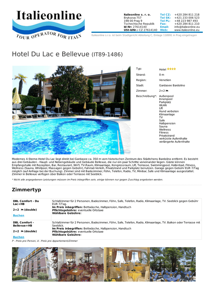 Italieonline s. r. o. Bryksova 757 198 00 Prag 9 Tschechische Republik Id-Nr: 27614140 USt-IdNr.: CZ 27614140 Tel CZ: Tel SK: Tel PL: Fax: Email: Web: +420 284 811 218 +421 233 006 523 +48 223 987 493 +420 284 811 210 [email protected] www.italieonline.eu Italieonline s.r.o. ist beim Stadtgericht Abteilung C, Einlage 118991 in Prag eingetragen Hotel Du Lac e Bellevue (IT89-1486) Typ: Hotel Strand: 0m Region: Venetien Stadt: Gardasee Bardolino Zimmer: 2+2 Beschreibung*: Außenpool Innenpool Parkplatz WLAN Lift Hund verboten Klimaanlage TV Safe Halbpension Sauna Wellness Fitness Privatstrand verkürzte Aufenthalte verlängerte Aufenthalte Modernes 4-Sterne-Hotel Du Lac liegt direkt bei Gardasee ca. 350 m vom historischen Zentrum des Städtchens Bardolino entfernt. Es besteht aus drei Gebäuden - Haupt- und Nebengebäude und Gebäude Bellevue, die nur ein paar Schritte voneinander liegen. Gäste können Empfangshalle mit Rezeption, Bar, Restaurant, WI-FI, TV-Raum, Klimaanlage, Kongressraum, Lift, Terrasse, Swimmingpool, Hallenbad, Fitness, Wellness (Sauna, Whirlpool, Massagen gegen Gebühr), Fahrrad-Verleih, Privatstrand und Parkplatz benutzen. Garage gegen Gebühr EUR 7/Tag möglich (auf Anfrage bei der Buchung). Zimmer sind mit Badezimmer, Föhn, Telefon, Radio, TV, Minibar, Safe und Klimaanlage ausgestattet. Zimmer in Bellevue verfügen über Balkon oder Terrasse mit Seeblick. * Nicht alle angegebenen Leistungen müssen im Preis inbegriffen sein, einige können nur gegen Zuschlag angeboten werden. Zimmertyp DBL Comfort - Du Lac+HB 2+2 (double) Buchen DBL Comfort Bellevue+HB 2+2 (double) Buchen Schlafzimmer für 2 Personen, Badezimmer, Föhn, Safe, Telefon, Radio, Klimaanlage, TV. Seeblick gegen Gebühr EUR 7/Tag. Im Preis inbegriffen: Bettwäsche, Halbpension, Handtuch Pflichtsgebühre: eventuelle Ortstaxe Wählbare Gebühre: Schlafzimmer für 2 Personen, Badezimmer, Föhn, Safe, Telefon, Radio, Klimaanlage, TV. Balkon oder Terrasse mit Seeblick. Im Preis inbegriffen: Bettwäsche, Halbpension, Handtuch Pflichtsgebühre: eventuelle Ortstaxe Wählbare Gebühre: P - Preis pro Person, A - Preis pro Appartement/Zimmer Du Lac Comfort Die Fotos dienen nur zur Illustration. https://www.italieonline.eu/ch/gardasee/hotel-du-lac-e-bellevue-1486.html www.ITALIEONLINE.eu TOUR OPERATOR FOR ITALY