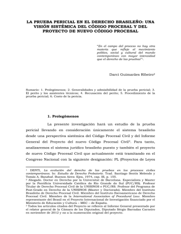 LA PRUEBA PERICIAL EN EL DERECHO BRASILEÑO: UNA VISIÓN SISTÉMICA DEL CÓDIGO PROCESAL Y DEL PROYECTO DE NUEVO CÓDIGO PROCESAL “En el campo del proceso no hay otra materia que refleje el movimiento político, social y cultural del mundo contemporáneo con mayor intensidad que el derecho de las pruebas”1. Darci Guimarães Ribeiro2 Sumario: 1. Prolegómenos; 2. Generalidades y admisibilidad de la prueba pericial; 3. El perito y los asistentes técnicos; 4. Recusación del perito; 5. Procedimiento de la prueba pericial; 6. Costo de la pericia. 1. Prolegómenos La presente investigación hará un estudio de la prueba pericial llevando en consideración únicamente el sistema brasileño desde una perspectiva sistémica del Código Procesal Civil y del Informe General del Proyecto del nuevo Código Procesal Civil3. Para tanto, analizaremos el sistema jurídico brasileño puesto y también el proyecto de nuevo Código Procesal Civil que actualmente está tramitando en el Congreso Nacional con la siguiente designación: PL (Proyectos de Leyes DENTI, La evolución del derecho de las pruebas en los procesos civiles contemporáneos. In: Estudio de Derecho Probatorio. Trad. Santiago Sentís Melendo y Tomás A. Banzhaf. Buenos Aires: Ejea, 1974, cap. III, p. 155. 2 Abogado. Doctor en Derecho por la Universitat de Barcelona. Especialista y Master por la Pontifícia Universidade Católica do Rio Grande do Sul (PUC/RS). Profesor Titular de Derecho Procesal Civil de la UNISINOS e PUC/RS. Profesor del Programa de Post-Grado en Derecho de la UNISINOS (Master y Doctorado). Miembro del Instituto Brasileño de Derecho Procesal Civil. Miembro del Instituto Iberoamericano de Derecho Procesal Civil. Miembro de la International Association of Procedural Law. Miembro representante del Brasil en el Proyecto Internacional de Investigación financiado por el Ministerio de Educación y Cultura – MEC – de España. 3 Todos los artículos citados del Proyecto se refieren al Informe General presentado por el relator general de la Cámara de los Diputados, Diputado Sérgio Barradas Carneiro en noviembre de 2012 y no a la numeración original del proyecto. 1 nº 6.025, de 2005 y nº 8.046, de 2010). También tomaremos en cuenta la posición de la jurisprudencia de los tribunales superiores sobre temas controvertidos. No trataremos de cuestiones dogmáticas comunes a todos los sistemas, ya que la investigación se destina a mostrar única y exclusivamente el funcionamiento de la prueba pericial en el derecho brasileño, con especial interés para el derecho comparado. 2. Generalidades y admisibilidad de la prueba pericial La existencia de un proceso es un fenómeno muy complejo, especialmente desde la perspectiva de la prueba, pues las consecuencias jurídicas que necesitan ser probadas en un determinado proceso4, ni siempre podrán serlo por los medios usuales de prueba que son los testigos y documentos. A veces hay necesidad de un conocimiento técnico especializado que el juez no lo tiene y solo este conocimiento es capaz de comprobar o no la certidumbre de la afirmación hecha en juicio. Por ello, es correcto afirmar, como lo hace DENTI, que “se tiene testimonio técnico cuando el declarante no puede prescindir, en la narración de los hechos, del uso de un lenguaje En esta orden de ideas, podemos afirmar que la prueba realizada en juicio no se refiere directamente a los hechos en si mismos considerados, sino más bien a las afirmaciones jurídicas extraídas de estos hechos, pues los hechos fenoménicamente considerados son irrelevantes para la prueba, ya que ellos existen o no independientemente de la prueba que en juicio se haga. Con razón CARNELUTTI cuando conceptúa la prueba como “comprobación de la verdad de una proposición”, y, más adelante concluye diciendo: “En este sentido, justo reconocer que objeto de la prueba no son los hechos sino las afirmaciones”, La prueba civil. Trad. Niceto AlcaláZamora y Castillo. Buenos Aires: Arayú, 1955, p. 38 e 40. De ahí que SERRA DOMÍNGUEZ conceptúa la prueba como “una actividad de comparación entre una afirmación sobre unos hechos y la realidad de los mismos encaminada a formar la convicción de una persona”, Contribución al estudio de la prueba. In: Estudios de Derecho Procesal, Barcelona: Ariel, 1969, nº 12, p. 356; este mismo articulo también fue publicado en Estudios de Derecho Probatorio. Lima: Comunitas, 2009, cap. 1, p. 25. De igual modo, PICÓ I JUNOY, El derecho a la prueba en el proceso civil, Barcelona: Bosch, 1996, cap. I, nº 1, p. 14, nota 8. Para profundizar mejor el estudio sobre el concepto de prueba, consultar DARCI GUIMARÃES RIBEIRO, Provas Atípicas, Porto Alegre: Livraria do Advogado, 1998, nº 2.3, p. 63-69. 4 especializado o, más genéricamente, no ordinario”5. Esto equivale decir, como bien a hecho el legislador brasileño al redactar el art. 420, pár. único, I, del Código Procesal Civil, que “o juiz indeferirá a perícia quando: I – a prova do fato não depender do conhecimento especial de técnico; (…)”6. El juez, como una persona que detiene una cultura media7, es incapaz de dominar adecuadamente todos los conocimientos de las más diversas ramas del saber, por ello, en muchos casos dentro del proceso, necesitará de una persona que detenga el conocimiento técnico especializado que le falte. Estas personas pueden ser de las más diversas áreas del saber como médicos, ingenieros, contadores y tantos otros que servirán para examinar personas, cosas o documentos que hacen parte del thema probandum. Esta es la razón por la cual se puede concluir, juntamente con OTTO TSCHADEK, que “resulta imposible establecer reglas generales para el ‘modus procedendi’ de los peritos y ha de dejarse a su discreción la manera de llegar a conclusiones”8. Aun cuando el juez, delante del caso concreto, detenga el conocimiento técnico especializado, la prueba pericial no puede ser suprimida9, al menos en e